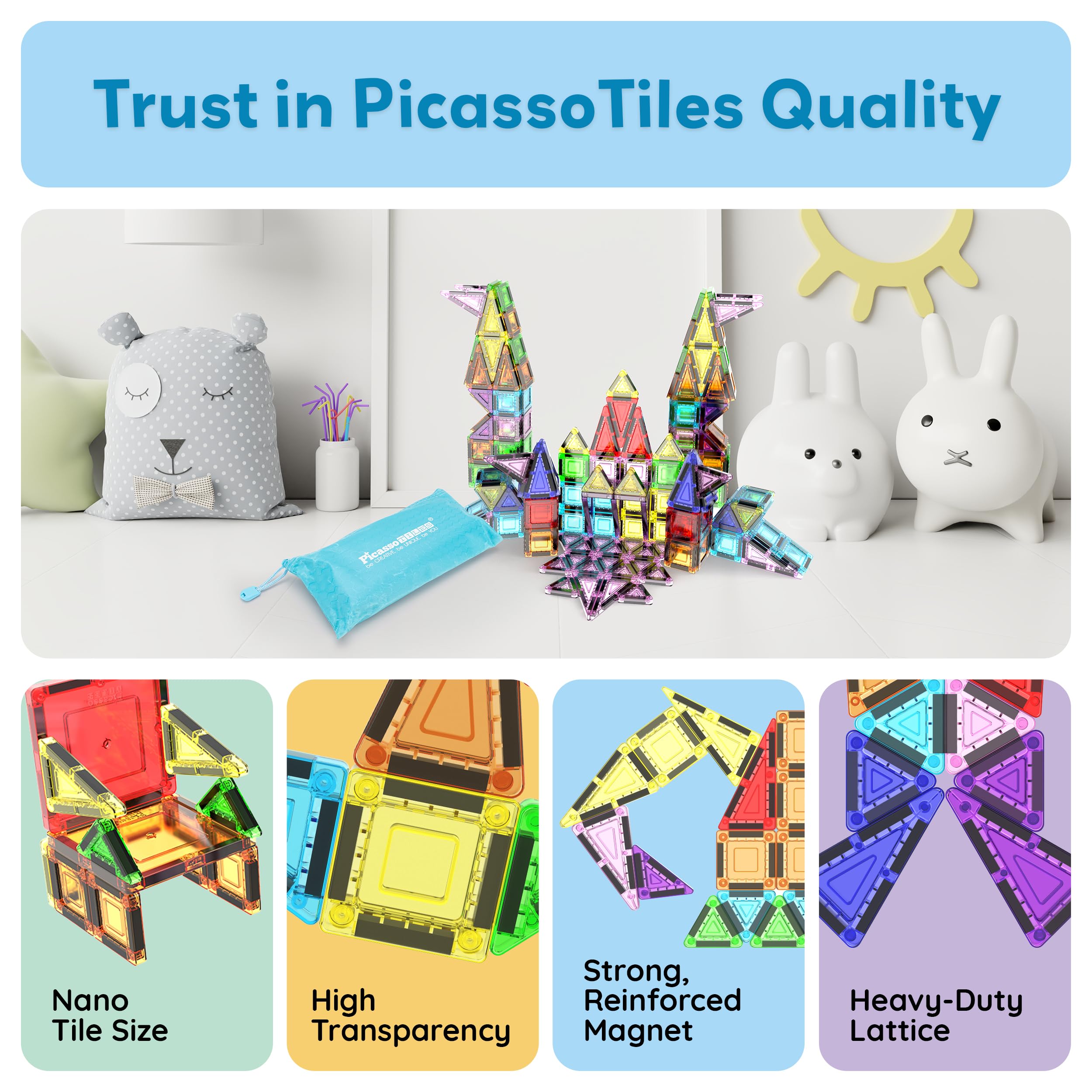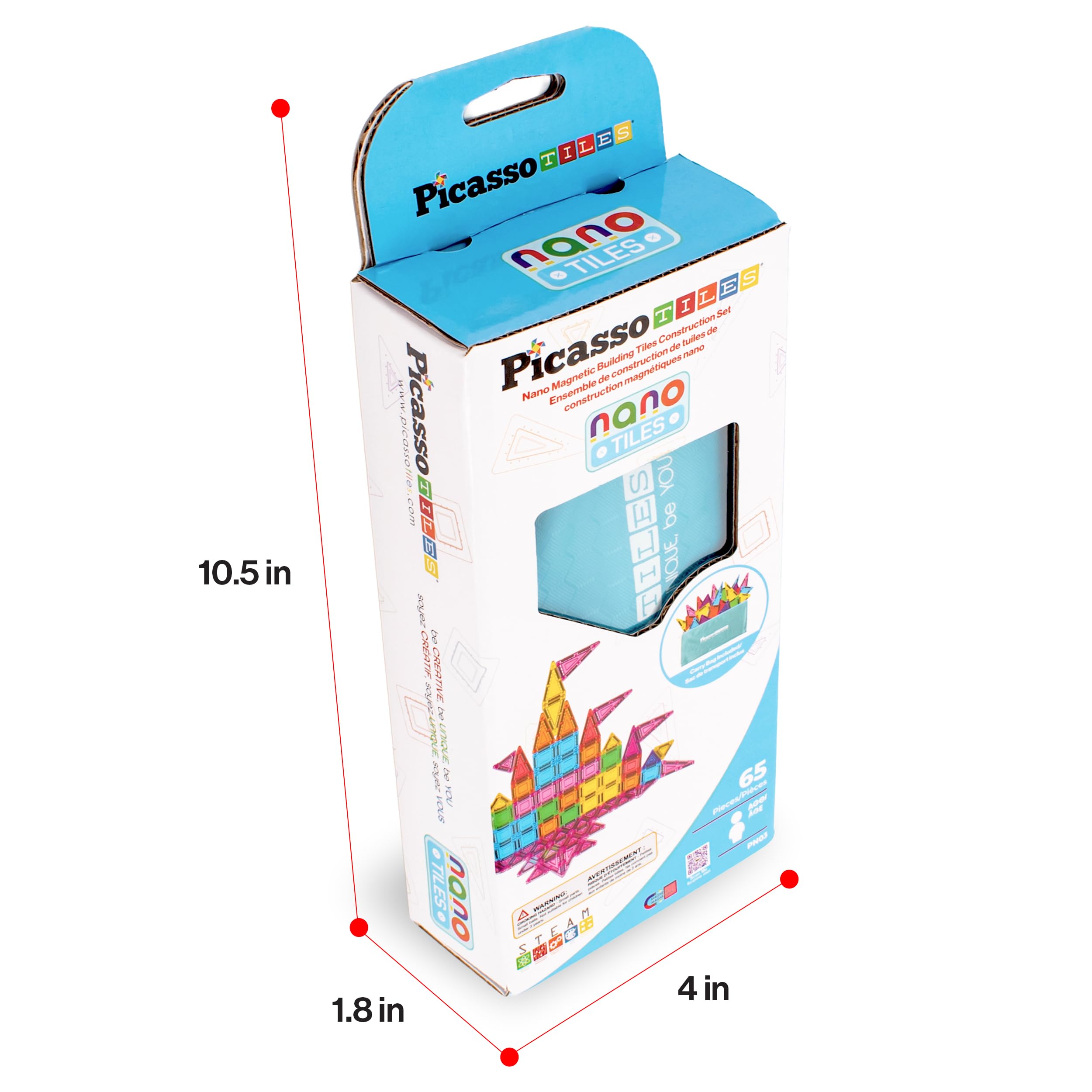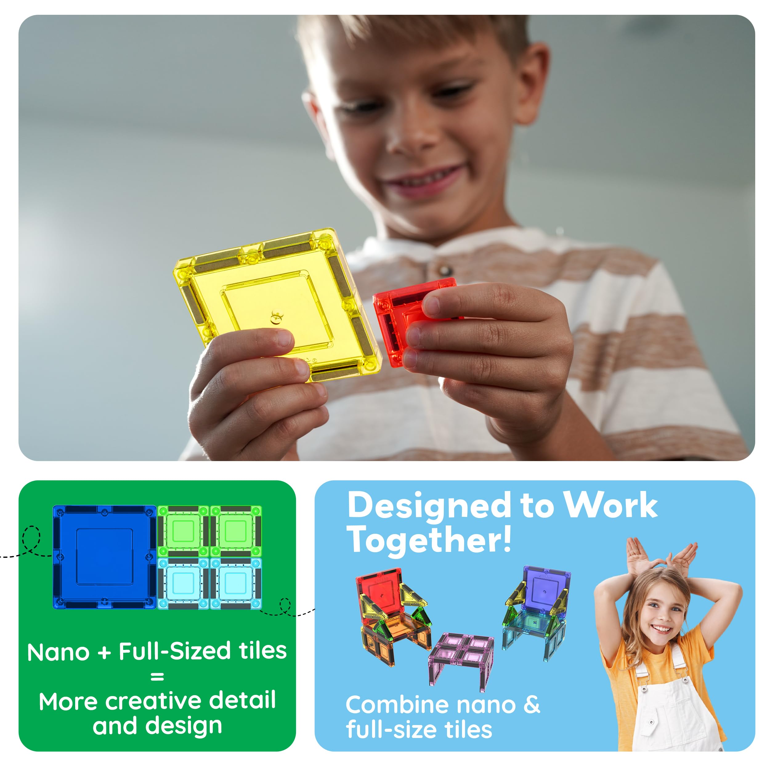 COMPATIBLE WITH OTHER SETS: Our nano mini magnetic tiles seamlessly connect with all full-sized PicassoTiles building sets. Combining smaller and larger pieces creates unique design elements, expanding possibilities for detailed and imaginative builds. Compact and portable, this set enhances any magnet tile collection by offering versatile building options for play anytime, inspiring inventive and artistic creations.