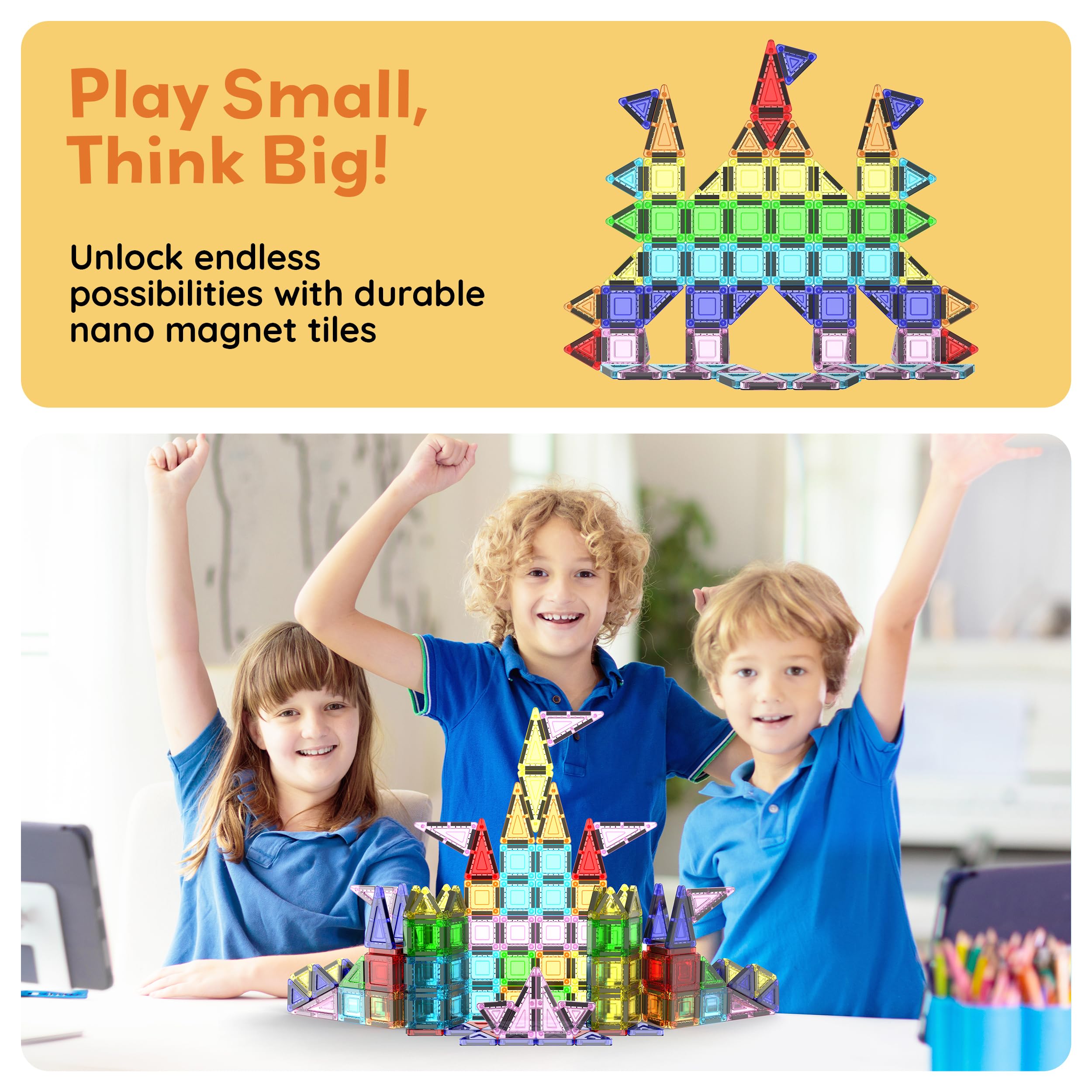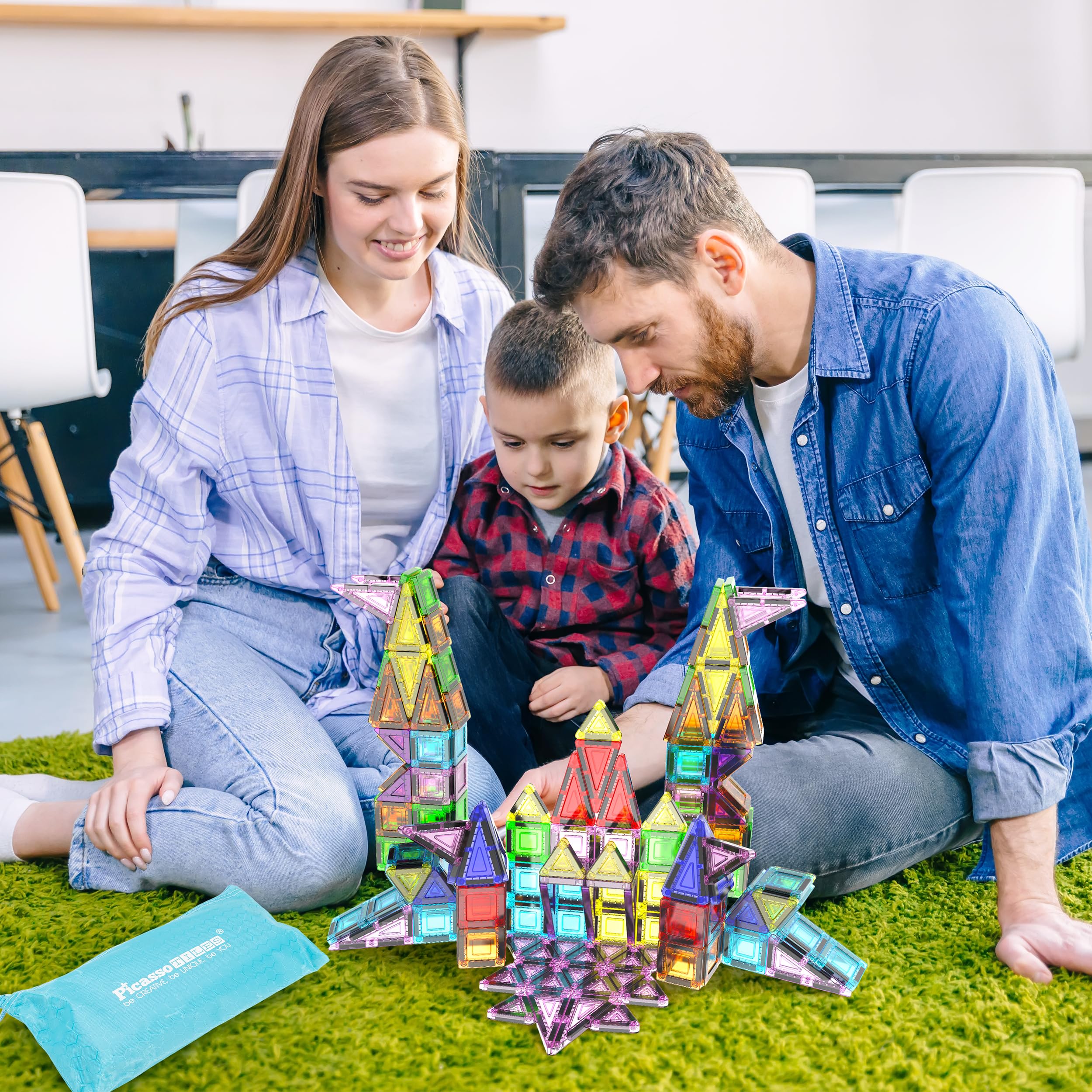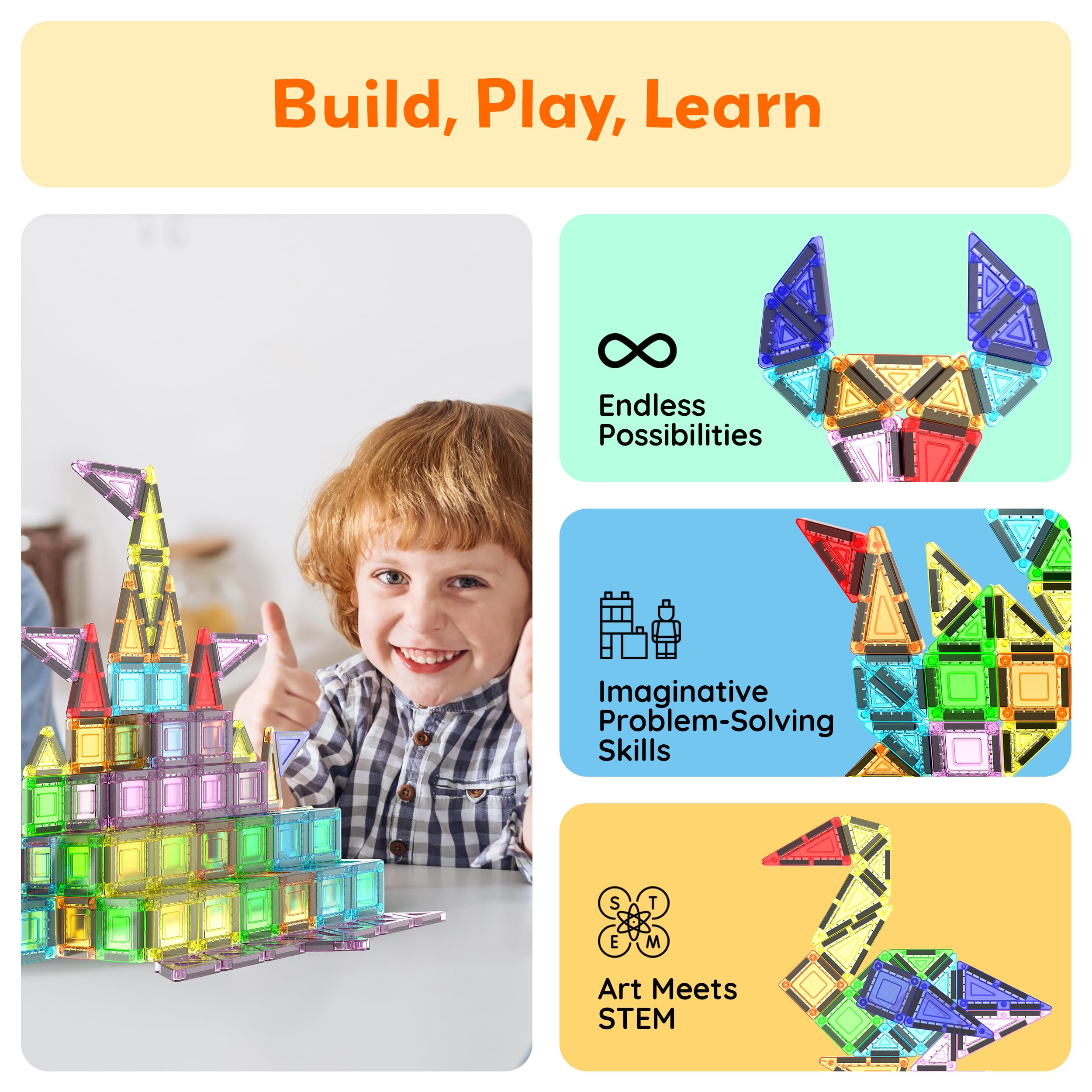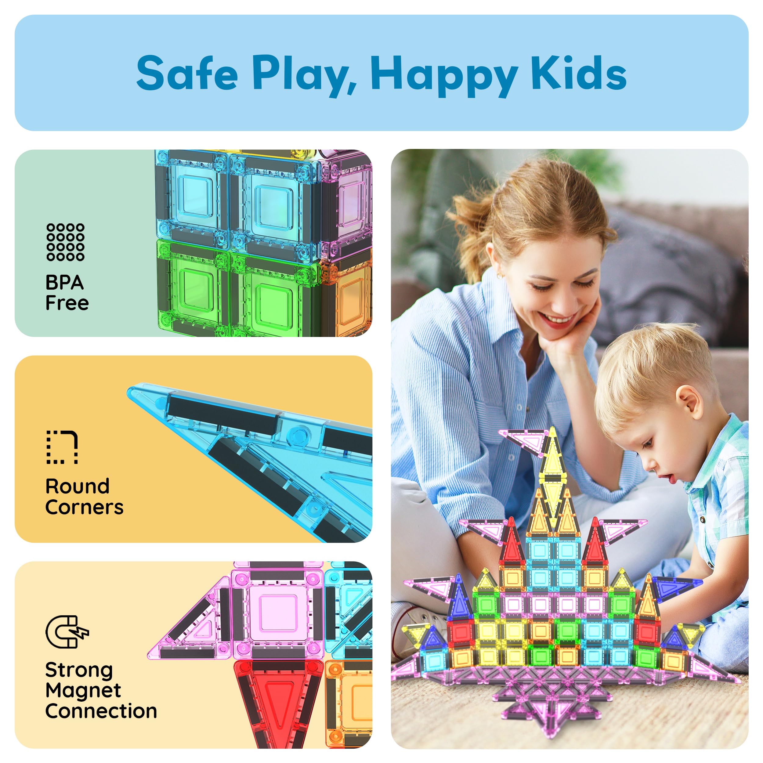 SAFE & DURABLE: Crafted from high-quality, non-toxic materials, this magnetic tile building set ensures safe play for kids of all ages. Built to withstand hours of fun, the sturdy construction resists breaking and wear. Rounded edges provide added safety, giving parents peace of mind while children explore, build, and create with confidence at home or on the go.