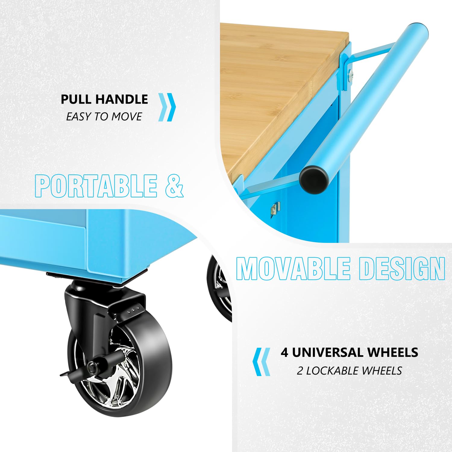 4-DRAWERS TOOL CABINET - This bamboo top rolling tool box with 4 drawers, large bottom storage space and side foldable tray , provides abundant space for your tools and accessories.