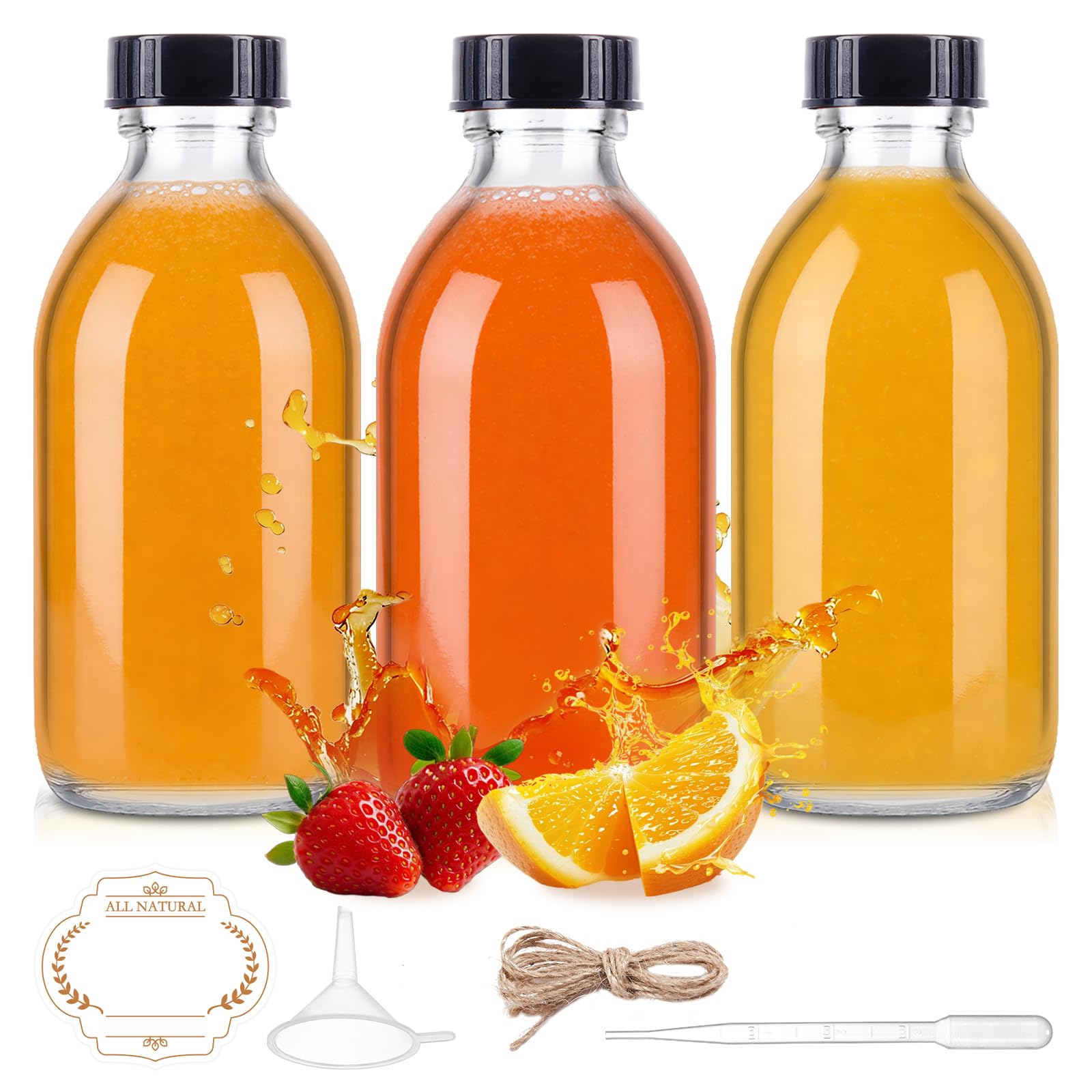 8 OZ Glass Bottle with Lids: Package include 3 Pack 8 oz Clear glass bottles, black airtight phenolic polycone caps, Writable Stickers, 1 funnels, jute rope