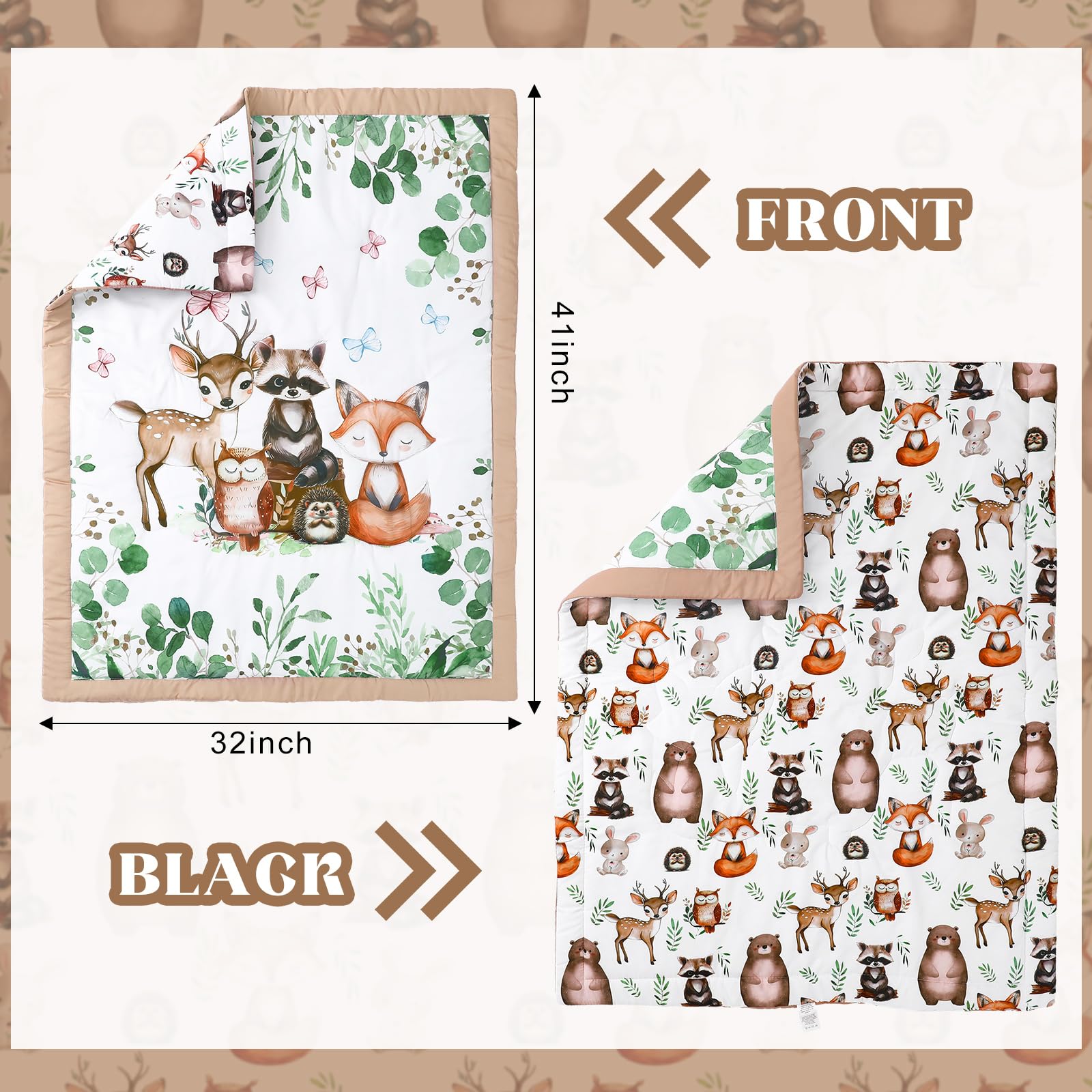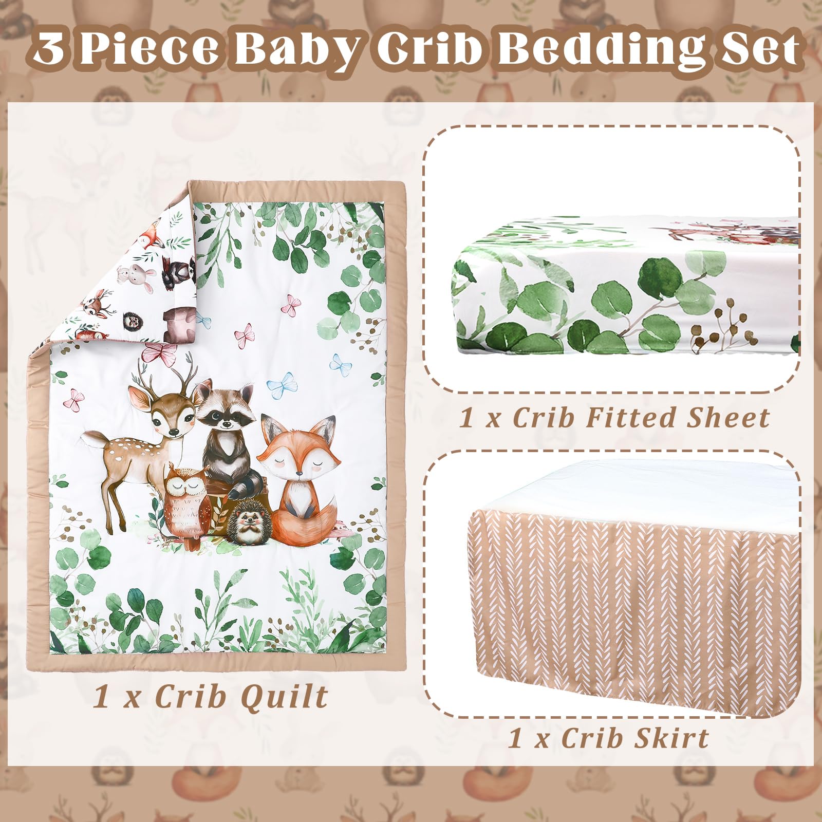 Jungle Animals Crib Set: our watercolor safari animal crib bed set has animal patterns like sika deer, baby raccoon, owl, little hedgehog, etc., with rich eucalyptus leaves, which are vivid and cute, adding a funny atmosphere to the neutral style nursery and helping the baby to self-soothe to sleep