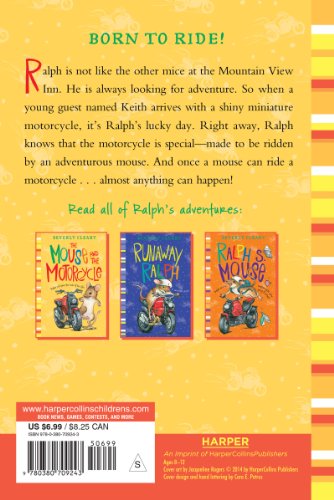 In this imaginative adventure from Newbery Medalβwinning author Beverly Cleary, a young mouse named Ralph is thrown into a world of excitement when a boy and his shiny toy motorcycle check in to the Mountain View Inn. When the ever-curious Ralph spots Keith's red toy motorcycle, he vows to ride it. So when Keith leaves the bike unattended in his room one day, Ralph makes his move. But with all this freedom (and speed!) come a lot of obstacles. Whether dodging a rowdy terrier or keeping his nosy cousins away from his new wheels, Ralph has a lot going on! And with a pal like Keith always looking out for him, there's nothing this little mouse can't handle. This timeless classic now features a foreword written by New York Times bestselling author Kate DiCamillo, as well as an exclusive interview with Beverly Cleary herself. The Mouse and the Motorcycle is perfect for independent reading or for shared reading at home or in a classroom. This fun story is the first of a trilogy, along with Runaway Ralph and Ralph S. Mouse, all inspired by the author's hope to create appealing books for boys and girlsβand by the sight of her son playing with toy cars.