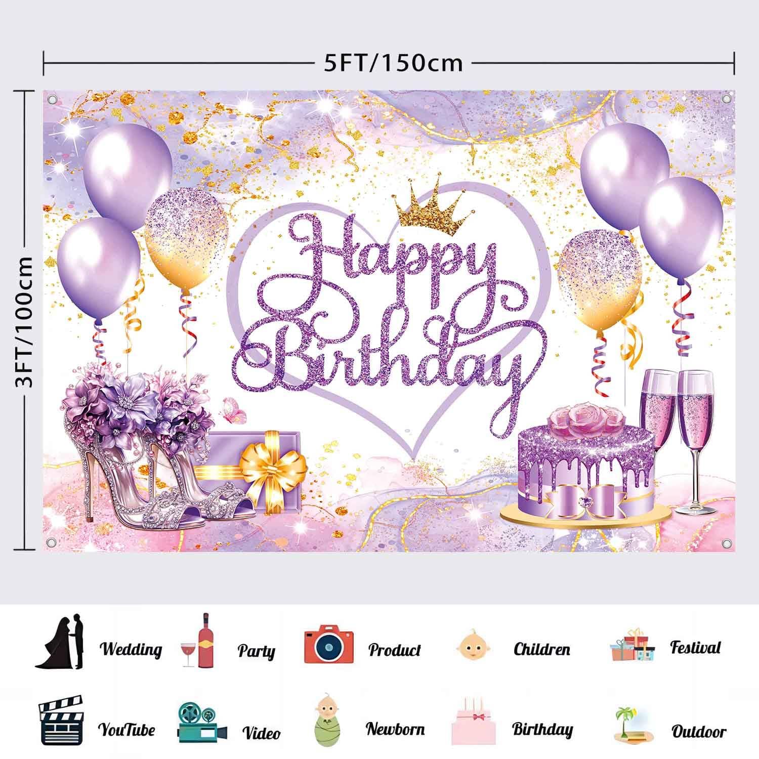 Stunning Design: This purple gold birthday background is the perfect decoration for your birthday party, featuring a elegant design with purple gold balloons, glitter birthday cake, purple champagne flutes, gift box, high heels, gold crown, floral elements to create a cheerful scene. The bright colors and eye-catching fonts will match with your other colorful birthday party favors.