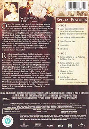 Set Contains: The two-disc deluxe edition of The Fall of the Roman Empire comes stuffed with extras for this somewhat forgotten sixties epic. A commentary track by producer Samuel Bronston's son Bill, with Bronston biographer Mel Martin, provides info over the course of the movie's 185-minute running time. A terrific 22-minute promo movie from 1964, narrated by co-star James Mason, offers some great behind-the-scenes footage, including costume tests and the amusing sight of Alec Guinness and Christopher Plummer dueling at chess. Another new half-hour "making of" doc fills in the rest of the story, with good detail on the vast scale of the production and the money woes Bronston juggled on the Spanish location as the budget skyrocketed; the usual experts are joined by director Anthony Mann's wife and composer Dimitri Tiomkin's daughter. Two 10-minute docs give historical background on the real Rome, and a comparison of fact vs. fiction in the movie. Another 20-minute short does an excellent job of parsing Tiomkin's ambitious score. The usual stills and trailers are also here. For the special three-disc Collector's Edition, you also get a package of postcard-sized stills and souvenir booklet, plus three short films made by Encyclopedia Britannica on the film's sets, an offbeat bonus for completists. (A title card notes that a deleted sequence from Fall was discovered too late to include in the set, but will be offered at a future date.) --Robert Horton Product Description In appointing a successor to his throne, the Emperor of Rome, Marcus Aurelius, chooses his adopted son Livius over his own son, Commodus. Prior to Livius' coronation, Commodus murders his father and proclaims himself the new emperor, prompting an epic reign of terror and corruption. His brutish tyranny alienates his brother, and the power struggle between Commodus and Livius culminates in the ultimate battle between the Barbarians and the Romans.