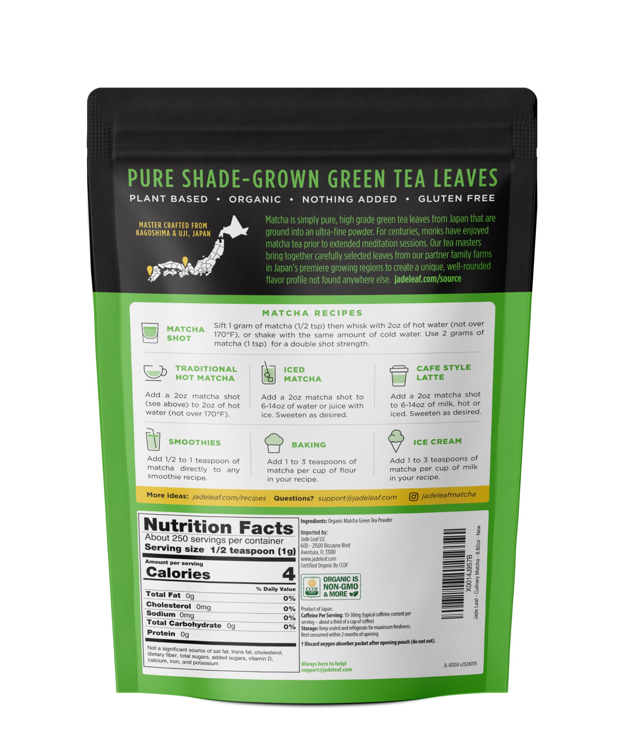 AUTHENTIC JAPANESE MATCHA POWDER: Jade Leaf Matcha is pure shade-grown green tea leaf matcha powder - Grown Without Pesticides or Harmful Fertilizers, sourced directly from the pristine tea fields of Uji and Kagoshima, Japan.