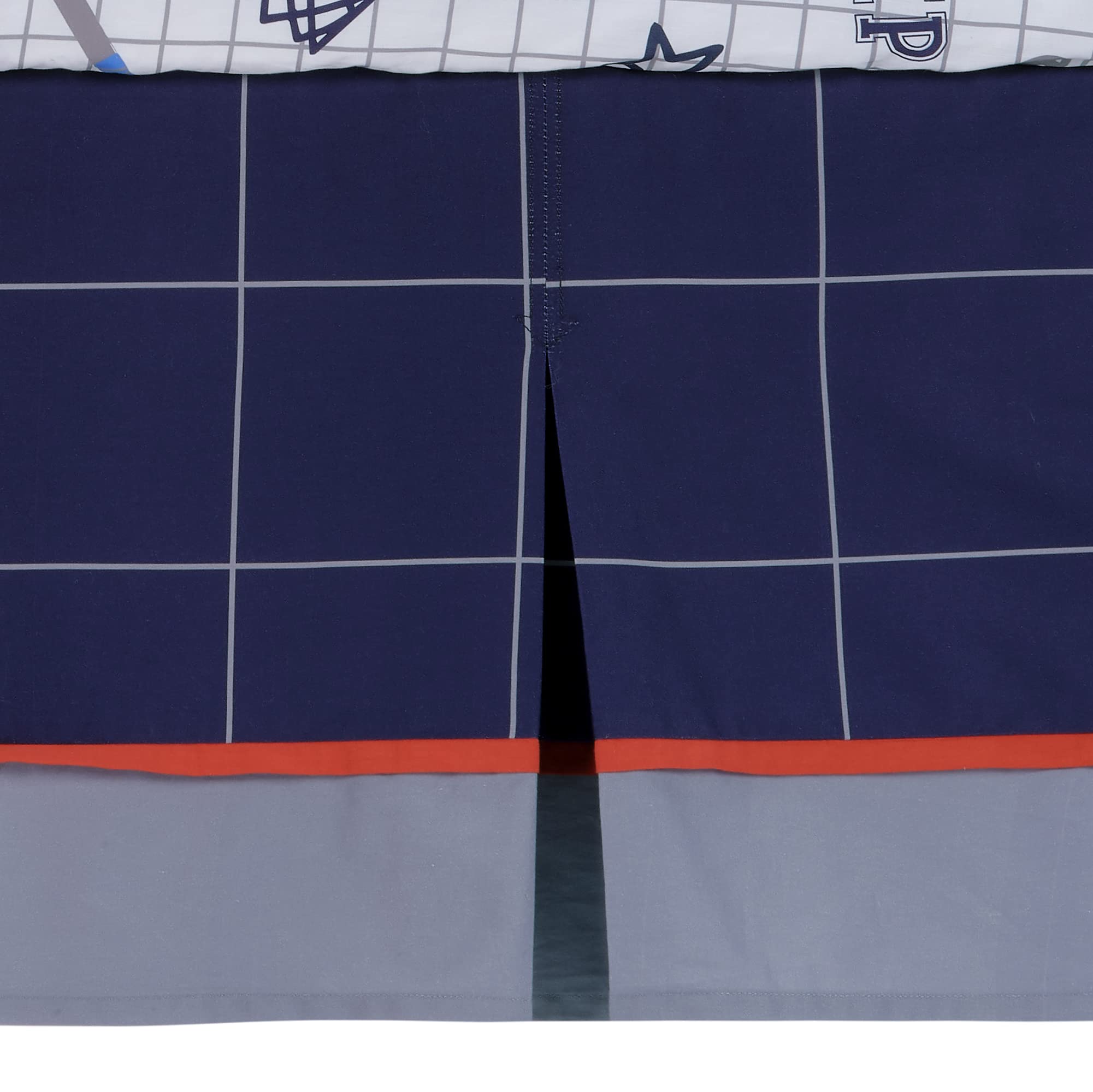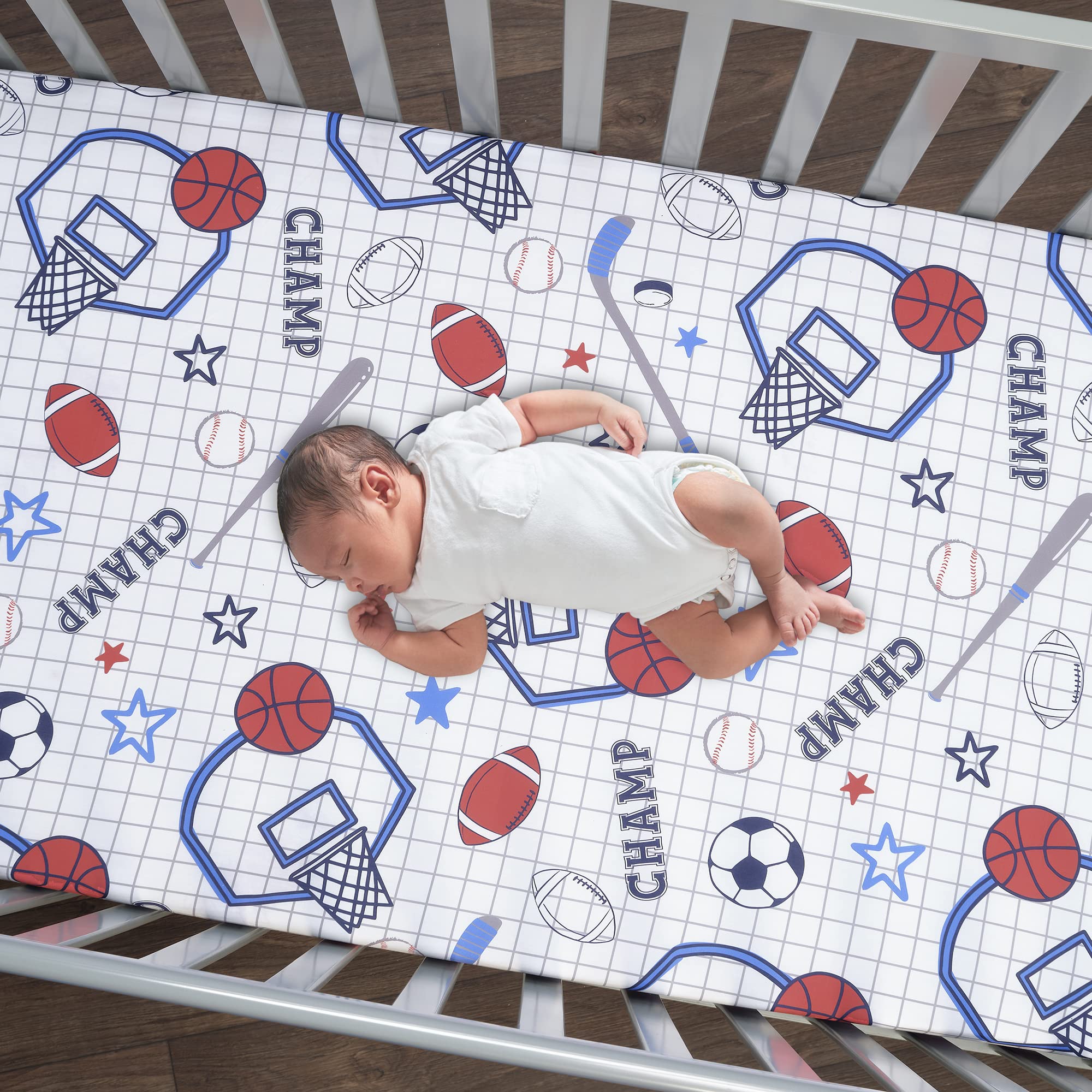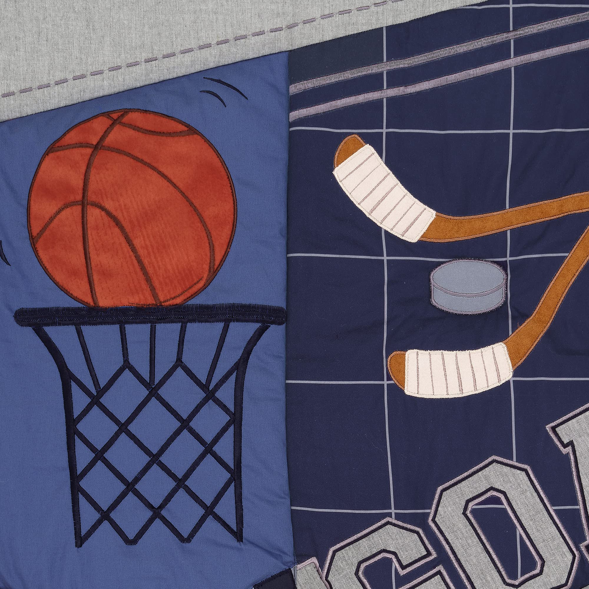 Your little one will sleep like an all-star with this custom designed sports theme crib bedding set. The three-piece set includes one quilt, one breathable 100% cotton fitted crib sheet, and one crib skirt. The patchwork style quilt, which is completely appliqued and embroidered, includes textured fabrications of heather gray chambray, velour, and faux suede. Featured sports include basketball, football, baseball, hockey, and soccer. The back of the quilt is a navy and gray windowpane pattern. The breathable 100% cotton fitted crib sheet includes all sports along with colorful stars. It has elastic all the way around ensuring a safe and secure fit on a standard-sized crib mattress measuring 28β X 52.β The crib skirt adds the finishing touch to your childβs crib. It is a cotton poly blend and has two front pleats. The upper panel is a navy and gray windowpane, and the lower panel is solid gray with a rust color trim in between. The four-sided crib skirt has a 14 Β½β drop.