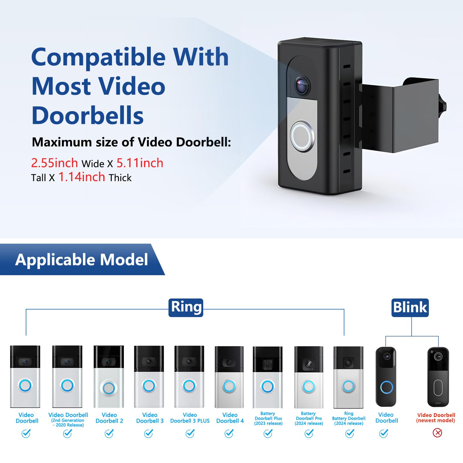 Compatible Doorbells: KIMILAR Anti-Theft Video Doorbell Mount suitable for Ring Video Doorbell (1-4 generation) and Ring Video Doorbell (2nd Generation - 2020 Release) and Ring Battery Doorbell (2024 Release) / Battery Doorbell Plus (2023 Release) and Blink Video Doorbell. The size of the doorbell that can be placed inside is not more than 2.55inches Wide x 5.11inches High x 1.14inches depth. (Doorbell is Not Included in Package)