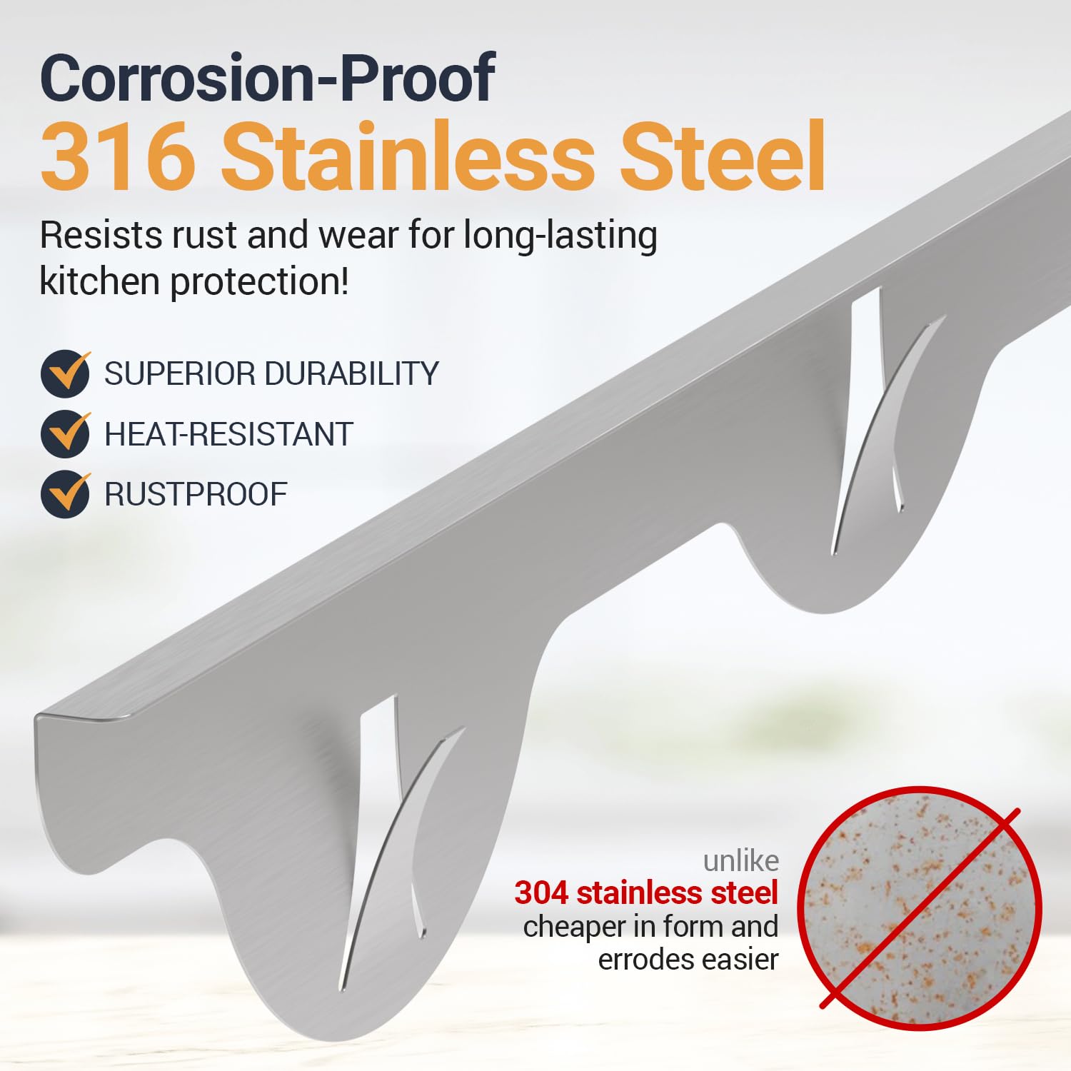 SUPERIOR 316 STAINLESS STEEL CONSTRUCTION: Our newly released metal gap filler are made from high-quality 316 stainless steel, renowned for its exceptional corrosion and heat resistance. This ensures an unmatched durability and strength that can resist even the harshest kitchen conditions, providing you with a product that is truly built to last. Perfect for stove gap guards or stove side gap covers