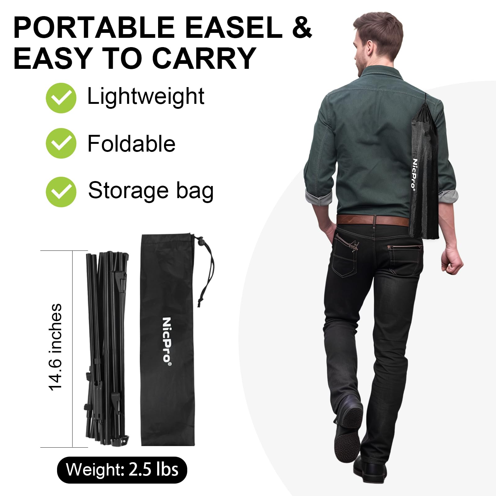 Collapsible Easels Enough: Black easel stand for sign is easy to set up with spring-loaded joints and tear down, No extra tools needed. The legs instantly lock into place when they are fully expanded. Lightweight 3 pounds and can be folded to only 15" for easy storage then you can carry to anywhere. Comes with anti-dust storage bag.