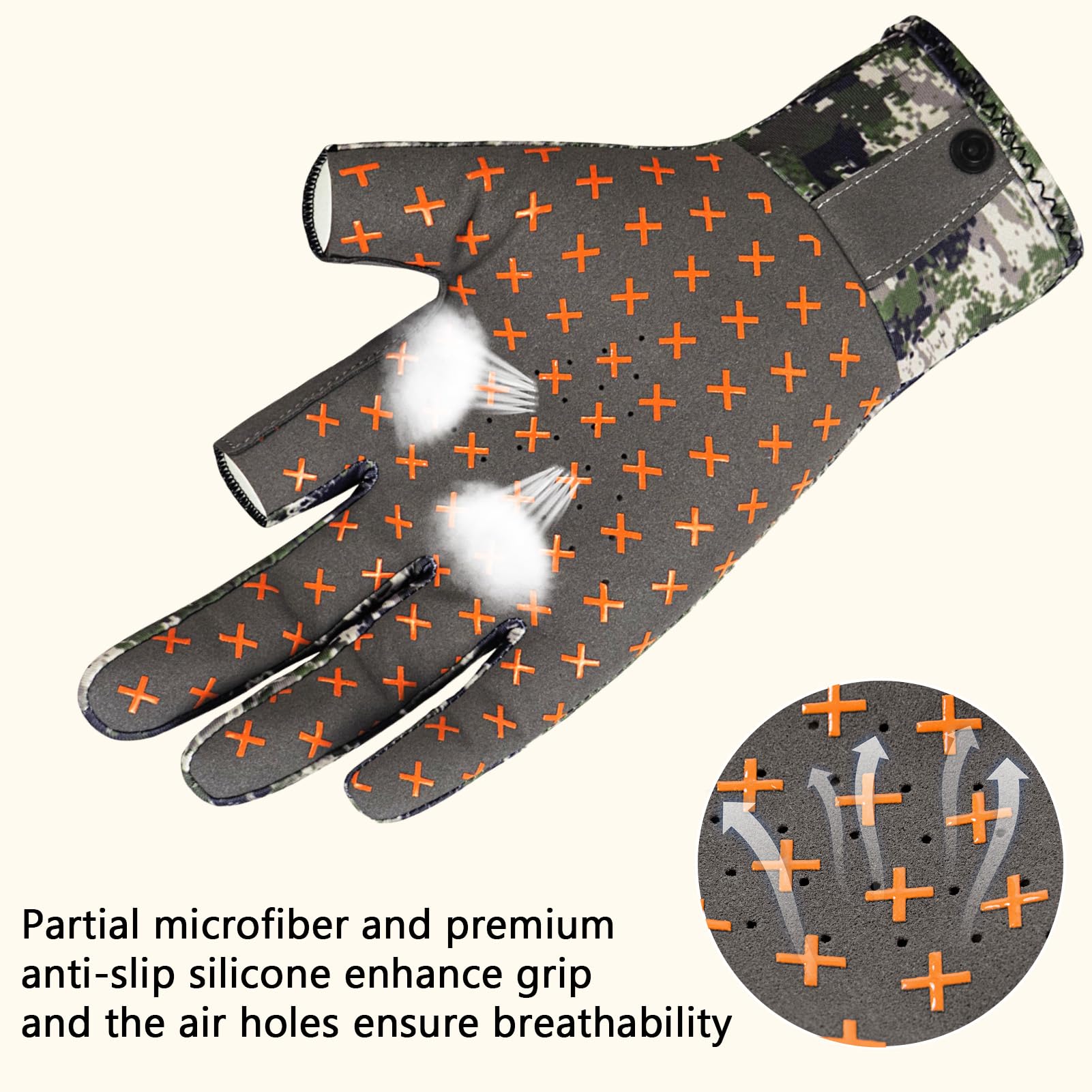 Partial microfiber and premium anti-slip silicone make sure you keep a firm grip on your bow or other hunting tools as well as prevent daily wear and tear; The air holes in the palm ensures breathability; Elastic wrist for a snug and comfortable fit