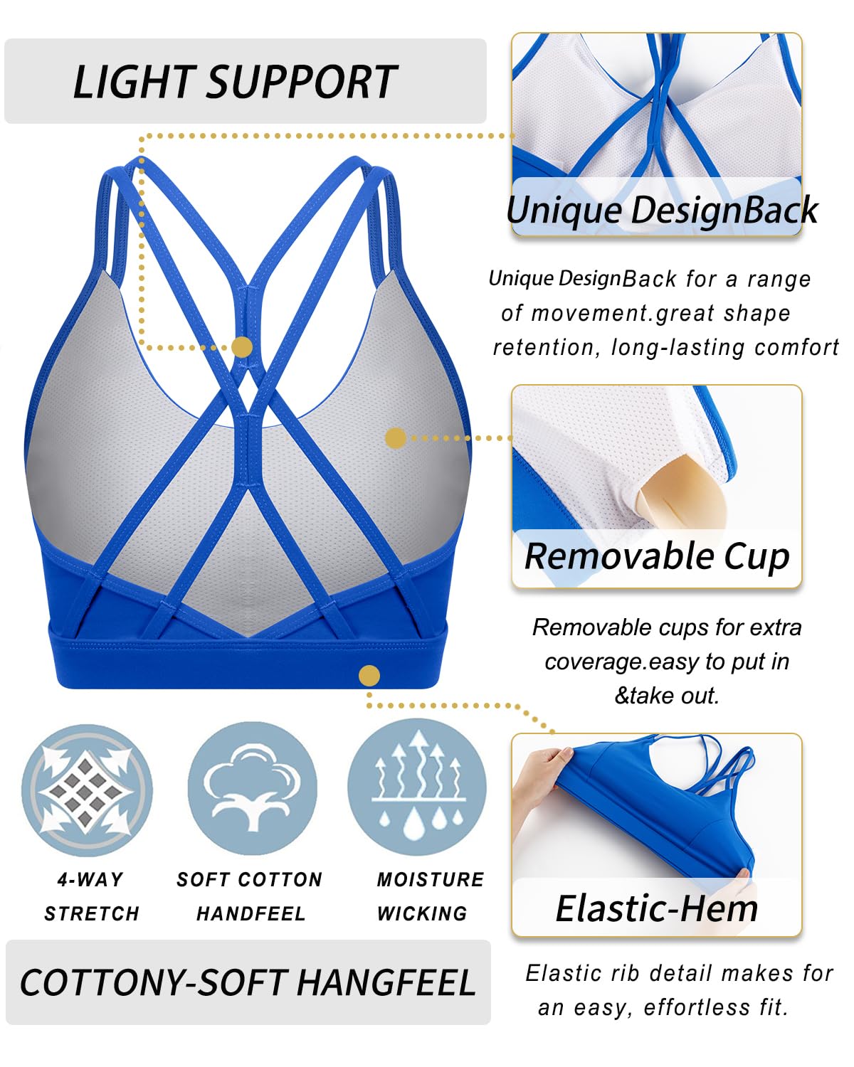 WHY WE MADE THIS: We designed this bra with a strappy, crisscross back for a range of movement. Made with moisture wicking fabric that's sweat-wicking and four-way stretch that offers great support and coverage with a cool, give you smooth COTTONY-SOFT HANGFEEL, great shape retention, long-lasting comfort—if you want it.
