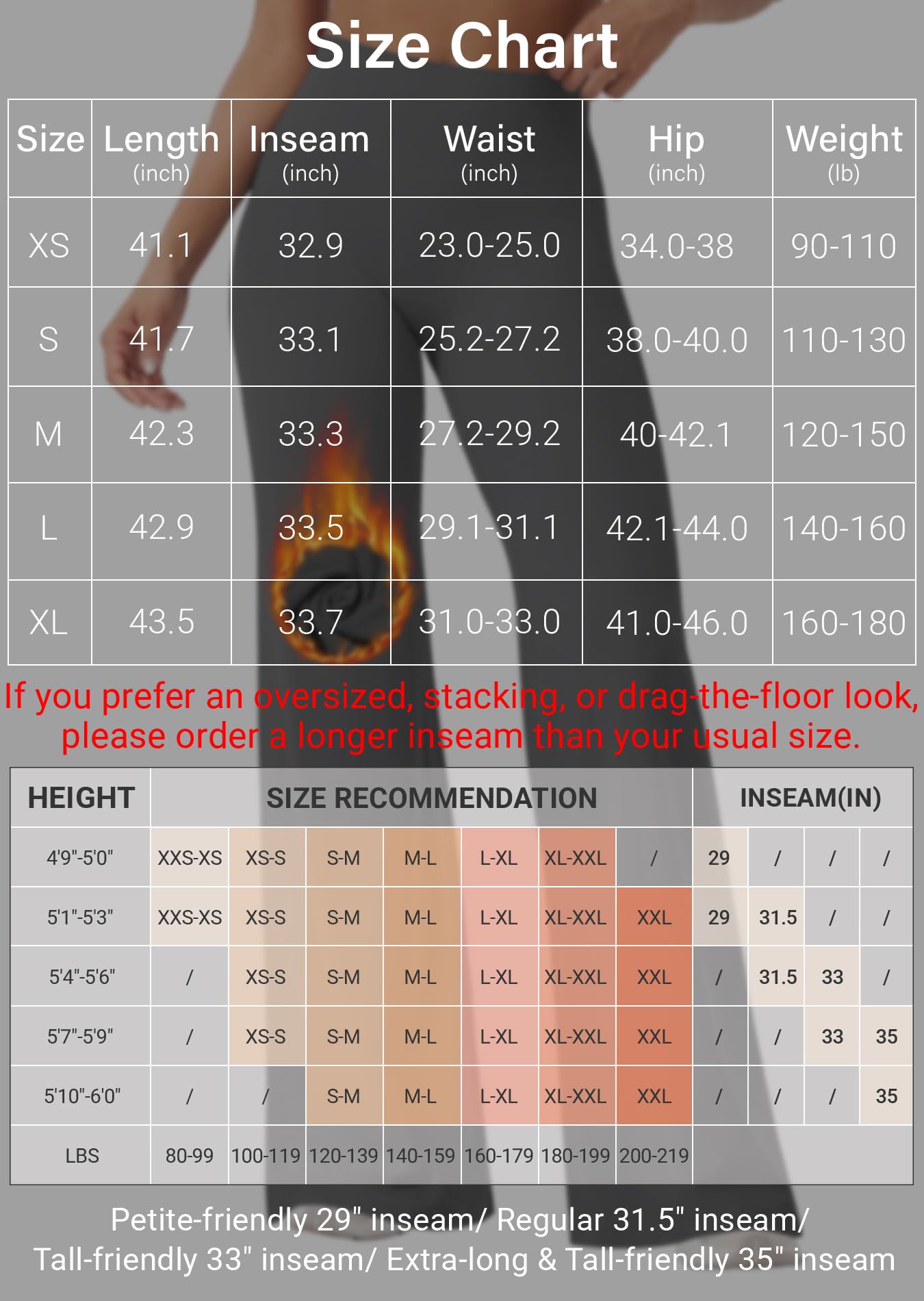 Womens Workout Leggings: For an oversized, stacking, or drag-the-floor look, please order a LONGER inseam than your usual size