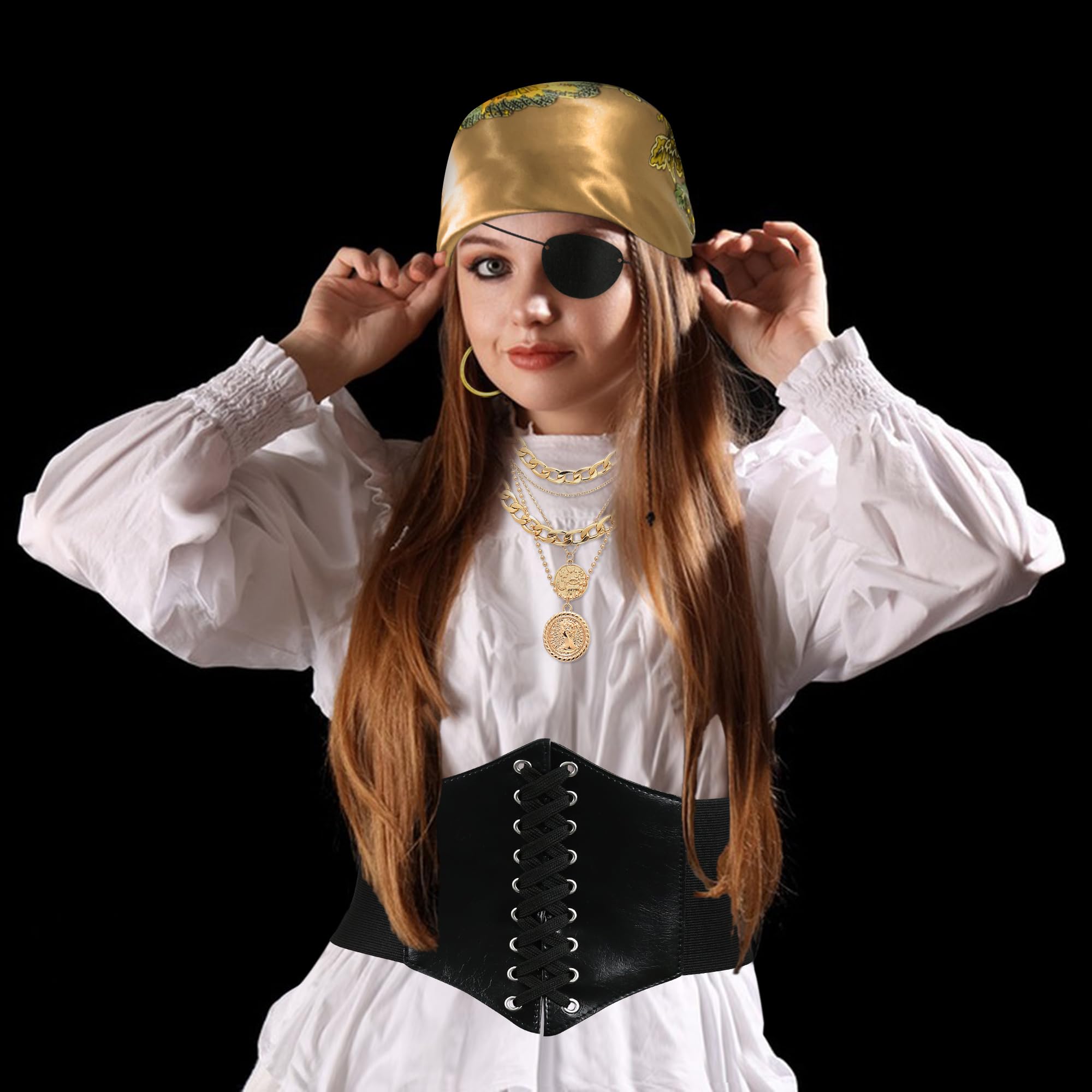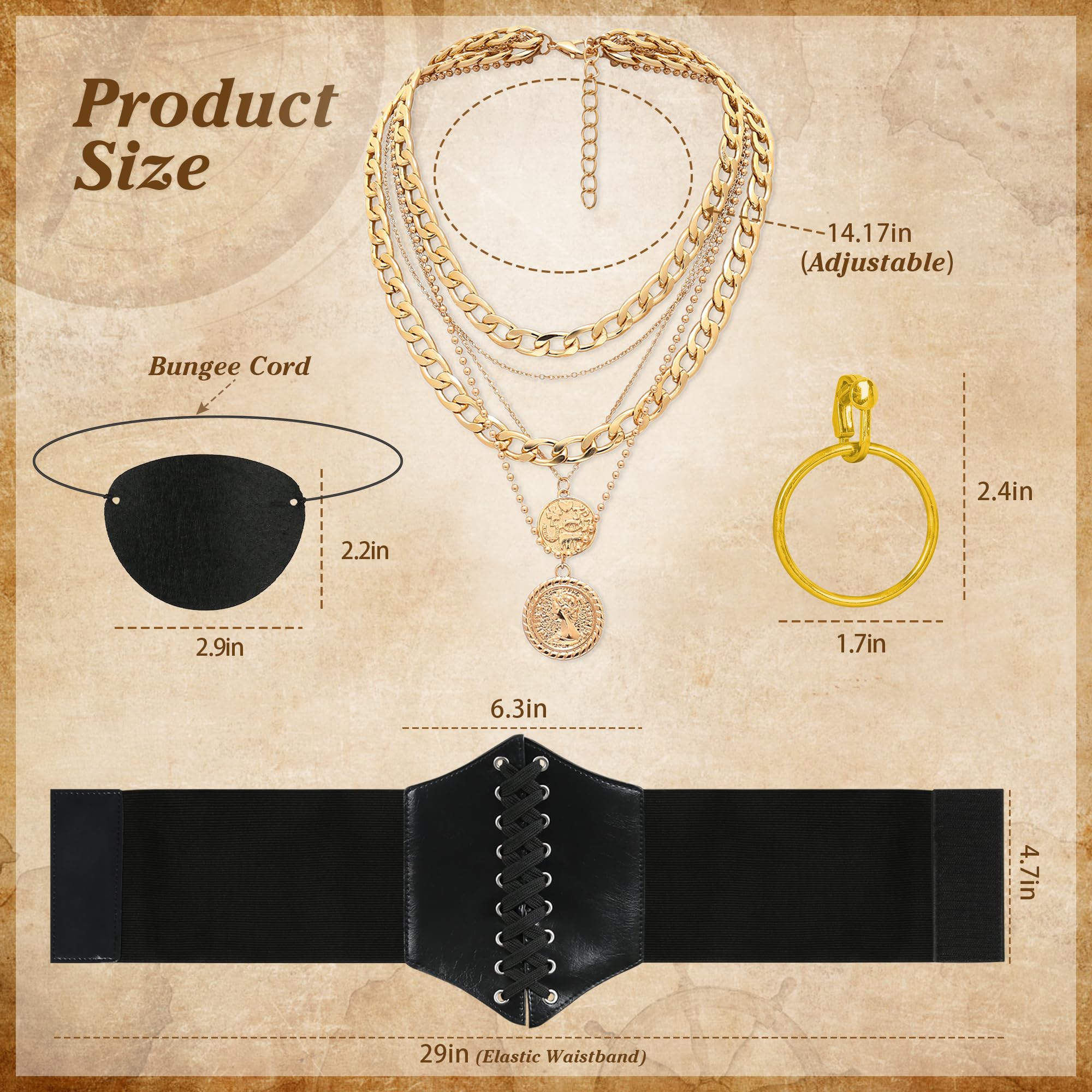 6 PCS Pirate Accessories Set Package includes: 1 piece pirate bandana, 1 piece pirate large sash,1 piece Bracelet,1 piece necklace,1 piece eye patch,1 piece earring