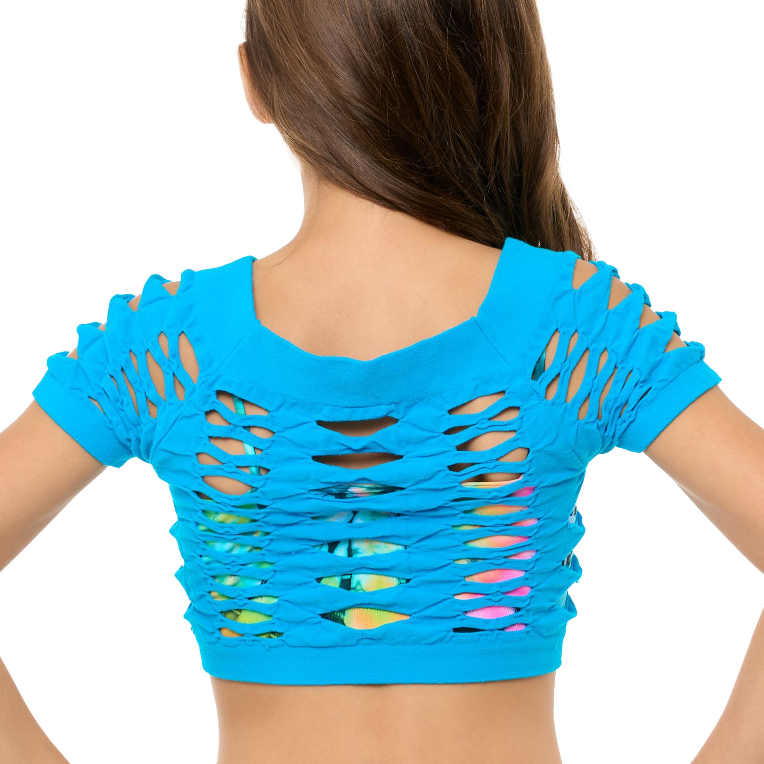(Trendy and Fashionable Crop Top for School) This modern short sleeve fishnet crop top is perfect for girls ages 10 to 14 who want to stay stylish and confident during the school year, first-day outfits, or school events.
