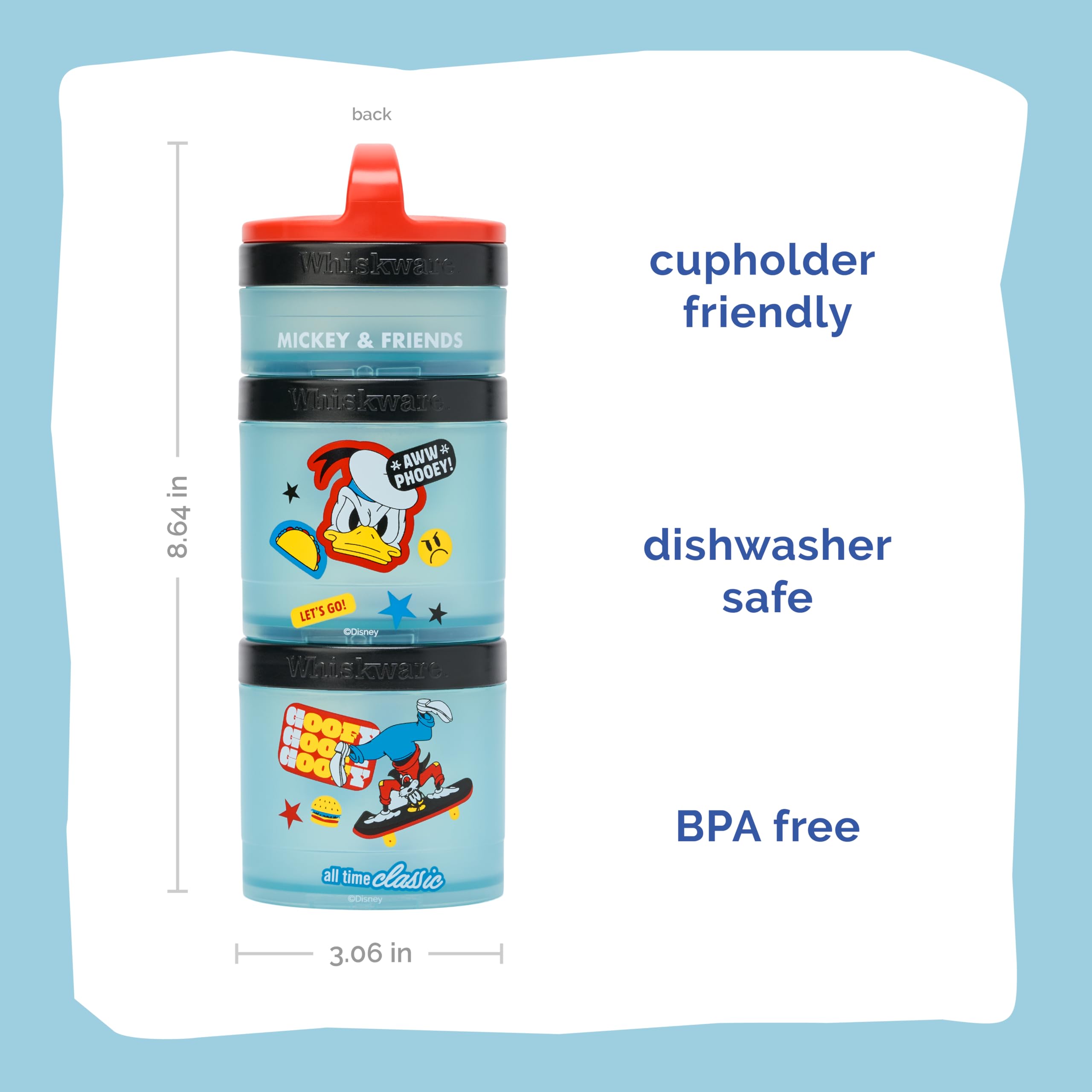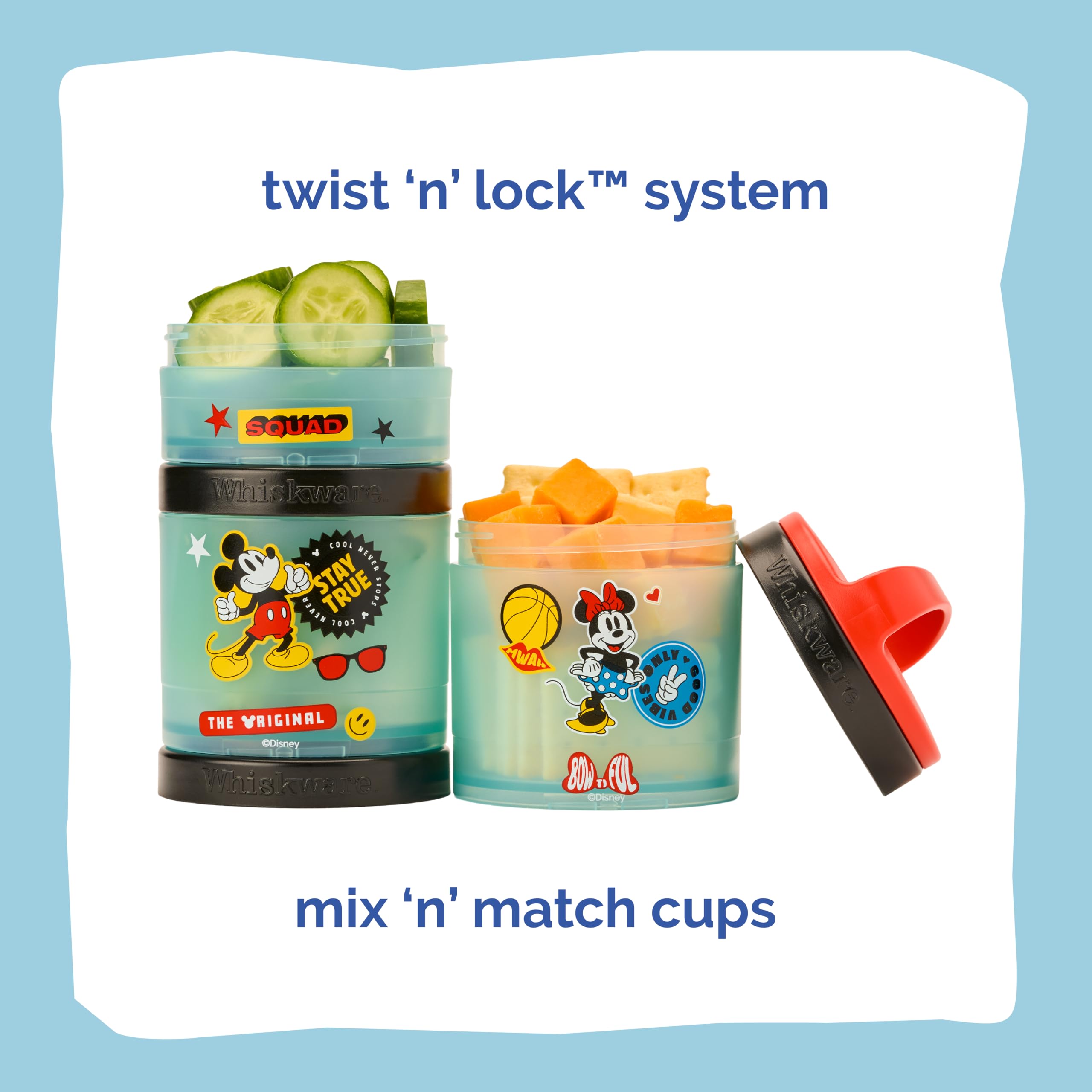 Here to turn snack time into playtime. Whiskware’s durable, low-mess snack jars have a Twist ‘n’ Lock™ system that not only lets you pack and go in a flash—but it also lets you mix and match all your favorite characters! Designed for little hands to hold, our snacking containers fit in cupholders, diaper bags, backpacks and more—making them an awesome food storage choice for daycare, school, and on-the-go airplane or car travel. But most of all, because we care about safety and convenience, Whiskware snacking containers are BPA free and dishwasher safe for worry-free use and cleaning. So if you want healthy snacking to be simple (and loads of fun), don’t miss these containers!