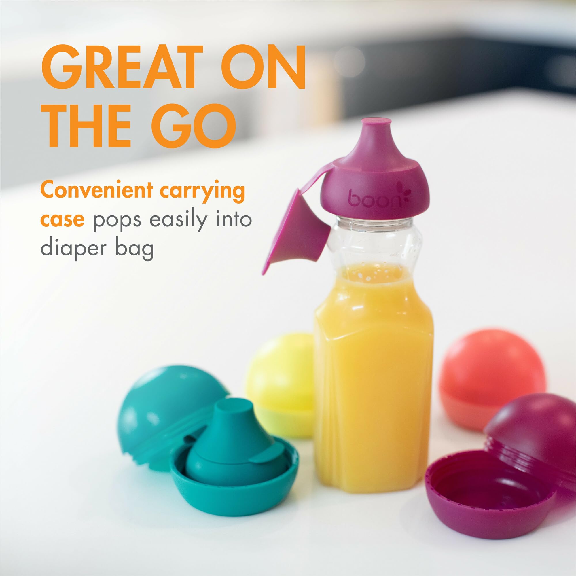 Great on the Go: These bottle toppers include 4 convenient carrying cases that pop easily into your diaper bag, making them crucial toddler travel essentials for flying or driving