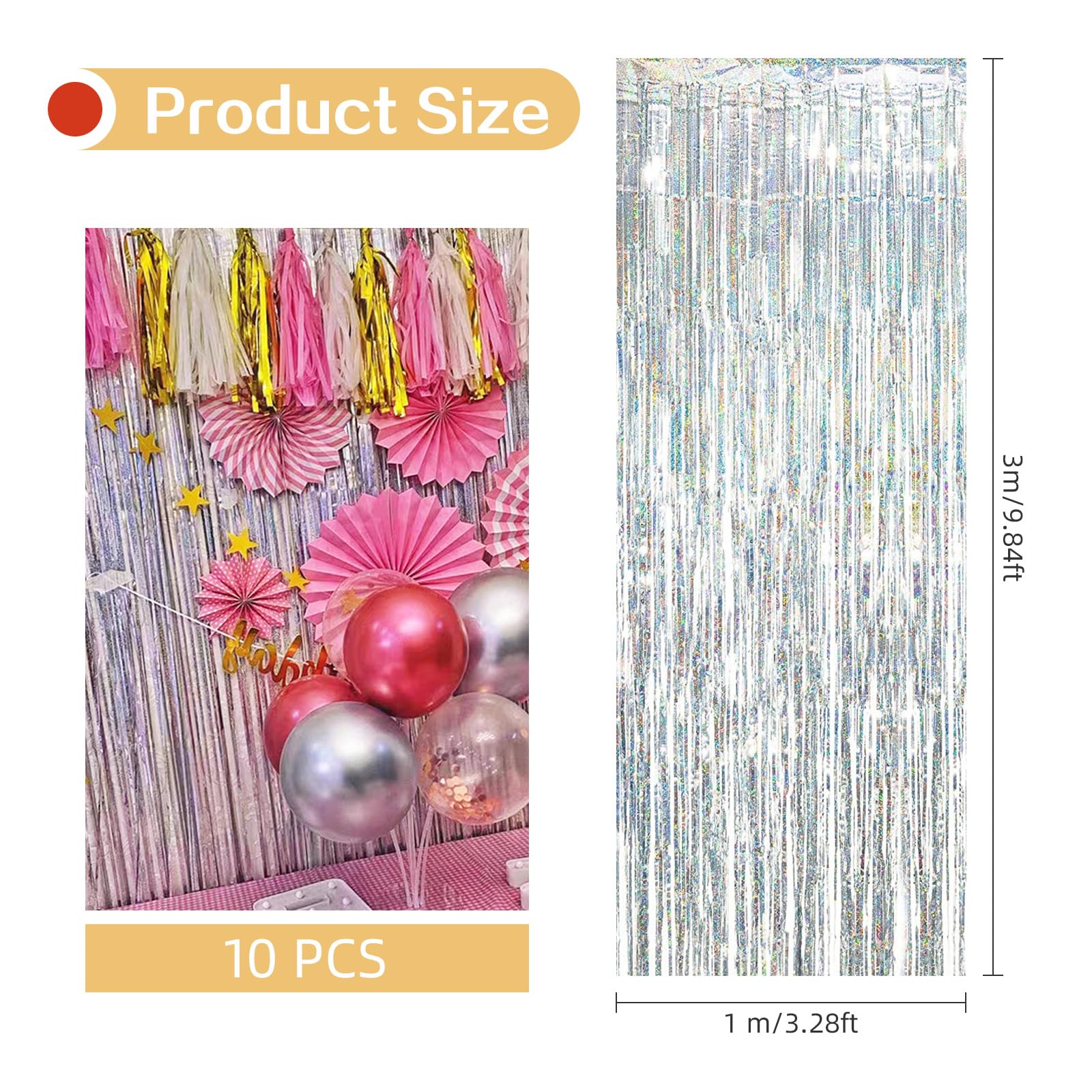 {Package and Size}: 10 Pack. Each pack size (W x L): 3.2ft x 9.8ft /1m x 3m. This 9.8 ft long and 3.2 ft wide foil fringe curtain can cover a wide area and can be cut to the required length and style to create the perfect background decoration.