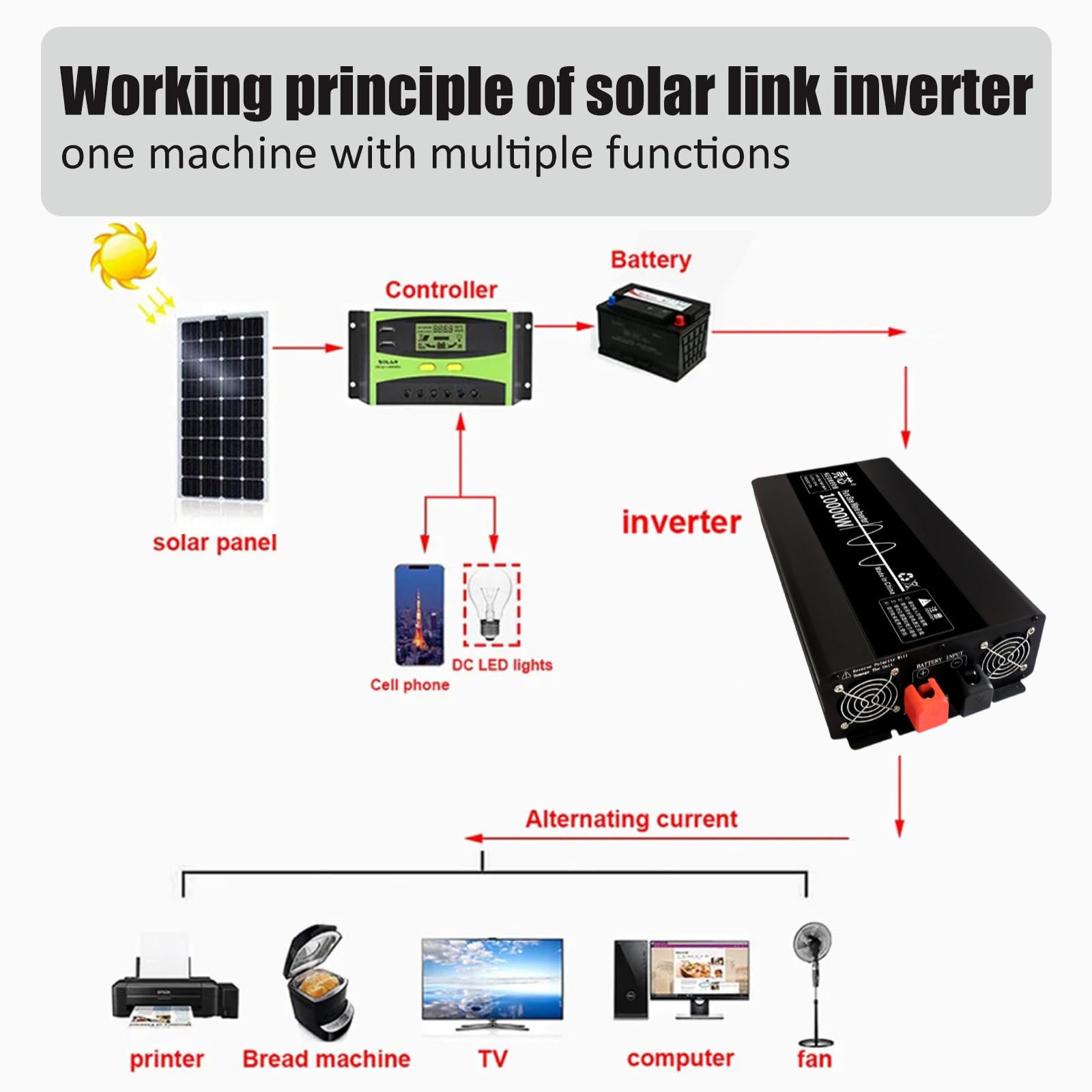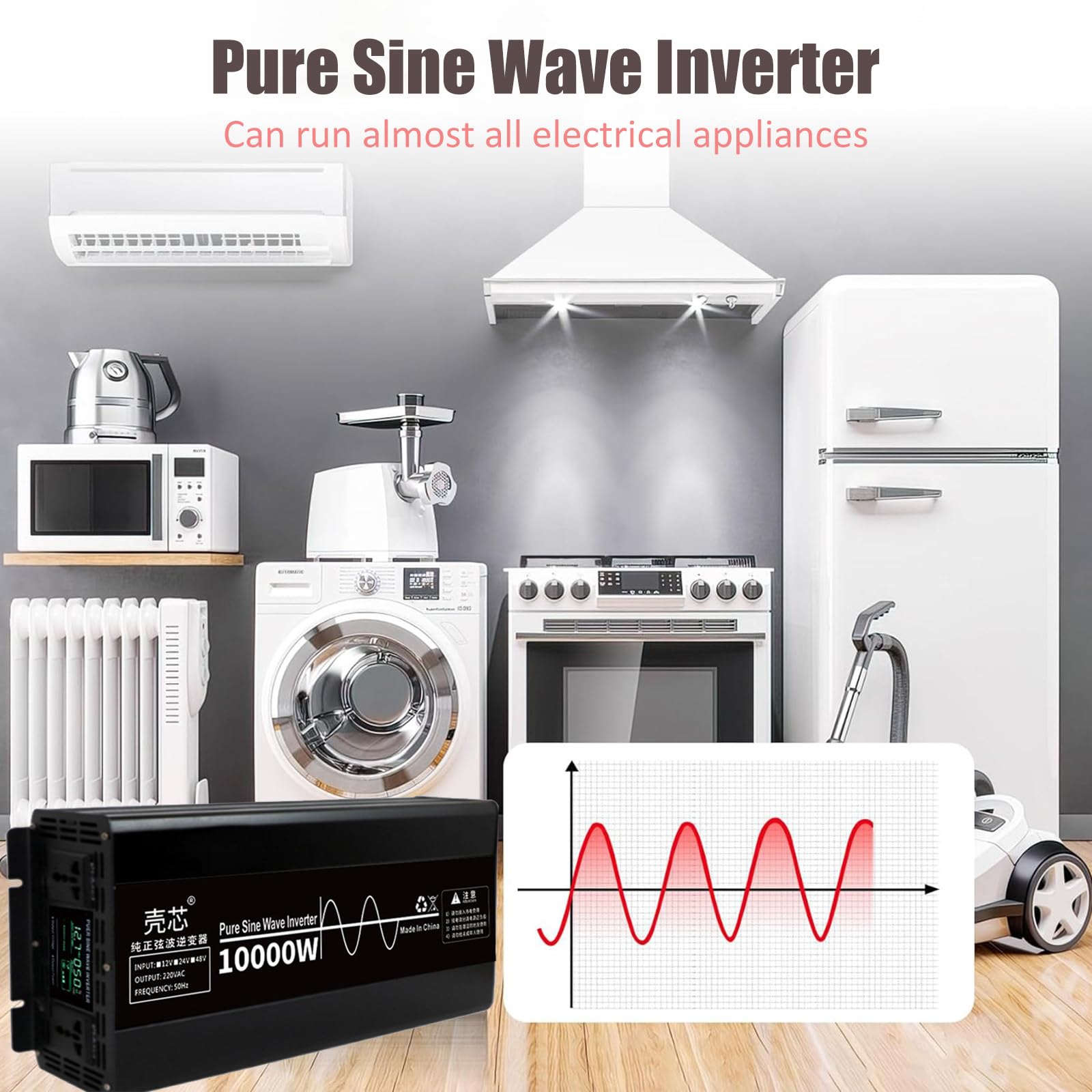 Pure sine wave inverter: This is a real inverter with pure sine wave, stable and efficient. It can convert 12V/24V/48V DC to 110V/220V AC. Can be used in emergency, camping, car, home, camper and solar systems. (100-20,000W solar panels or wind turbines can be used)