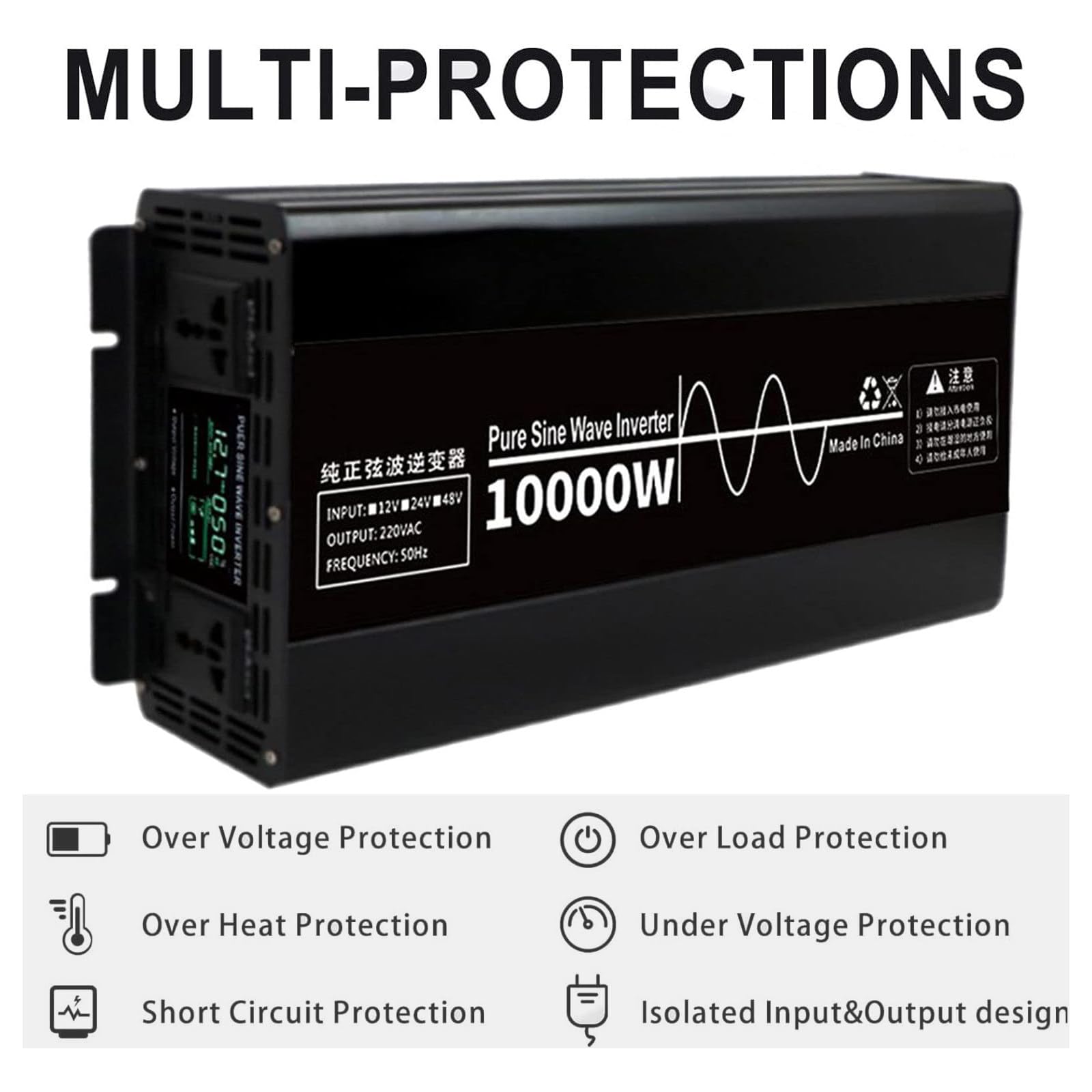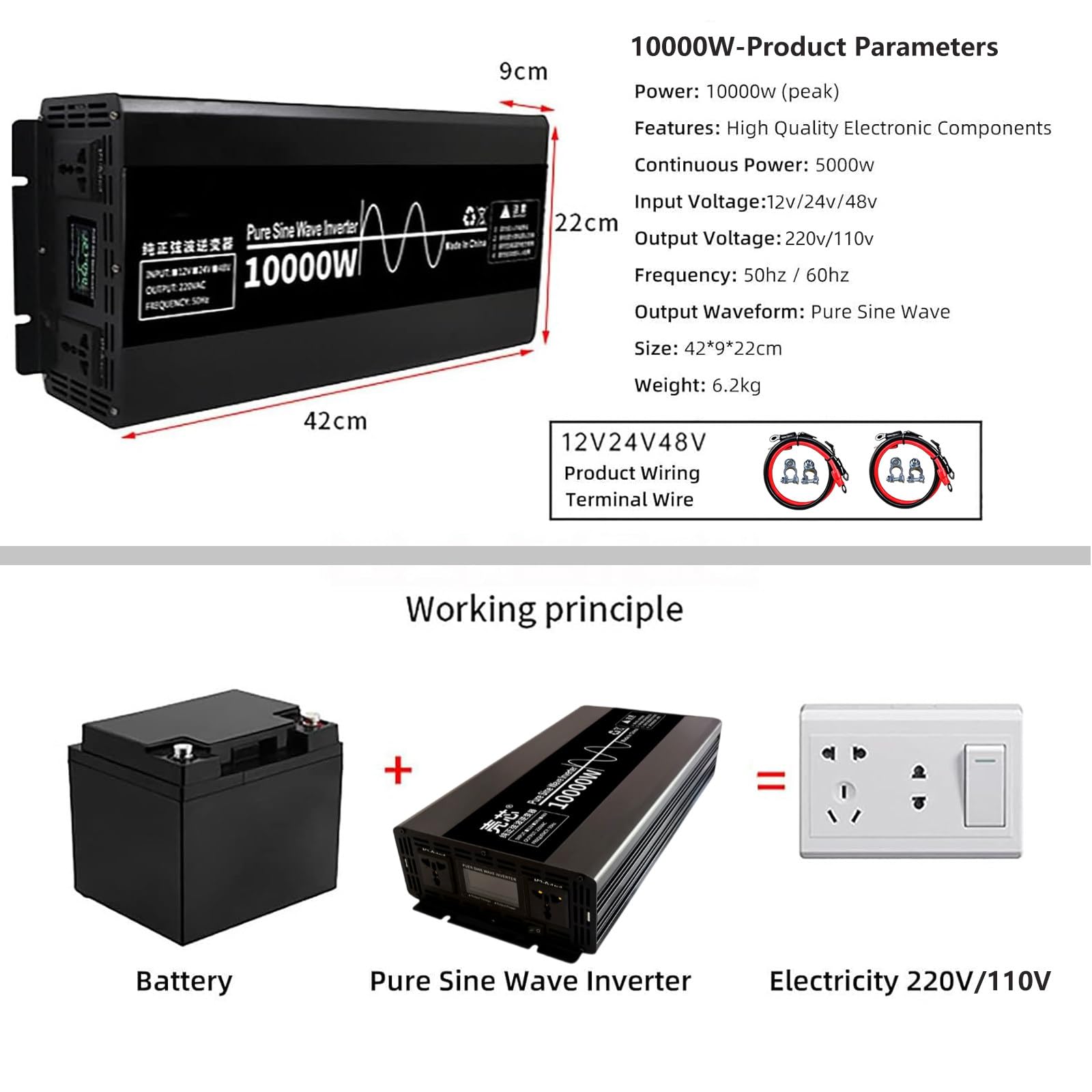 Are you still worrying about the power outage? - With this multi-function inverter, you can use ordinary 110V 220V electric appliances in your car/boat/caravan or your distribution garden. Or DIY your own home solar wind power generation systemFeatures:- Stable : Supply continuous pure sine wave output , as stable as main power- Silence : Less audible and electric noise- Save : Less power consumption , less waste- Safe : No damage to your devices Specifications:- Name:Pure Sine Wave Power Inverter- Material: aluminum alloy- Output Waveform: pure sine wave- Input Voltage: 12V/24V/48V DC- Output Voltage: 110V/220V AC- Peak Power: 4500W/7000W/10000W (Optional)- Rated Power: 2300W/3300W/5000W (Optional)- Weight: 3.3kg(4500W) /5.25kg(7000W) /6.4kg(10000W)- Output Socket: 2- LCD Screen: input voltage, output voltage display- Protection: short circuit, undervoltage, overvoltage, overload, high temperature, overcurrent Packing List:- Pure Sine Wave Inverter x 1- Pure Copper Cables x 1Remarks:1. Before connecting the inverter, make sure that the inverter switch is off.2. 12V inverters are only suitable for 12V batteries. 24V inverters are only suitable for 24V batteries.3. Do not expose the inverter to direct sunlight and store it in a cool, dry environment.4. Do not use the inverter with products that consume more power than the inverter can supply, as this may damage the inverter and the product.Customer service:- As an honest international seller, customer satisfaction is our top priority. If you have any questions about the product, please send us an email in time and we will answer your questions as soon as possible.