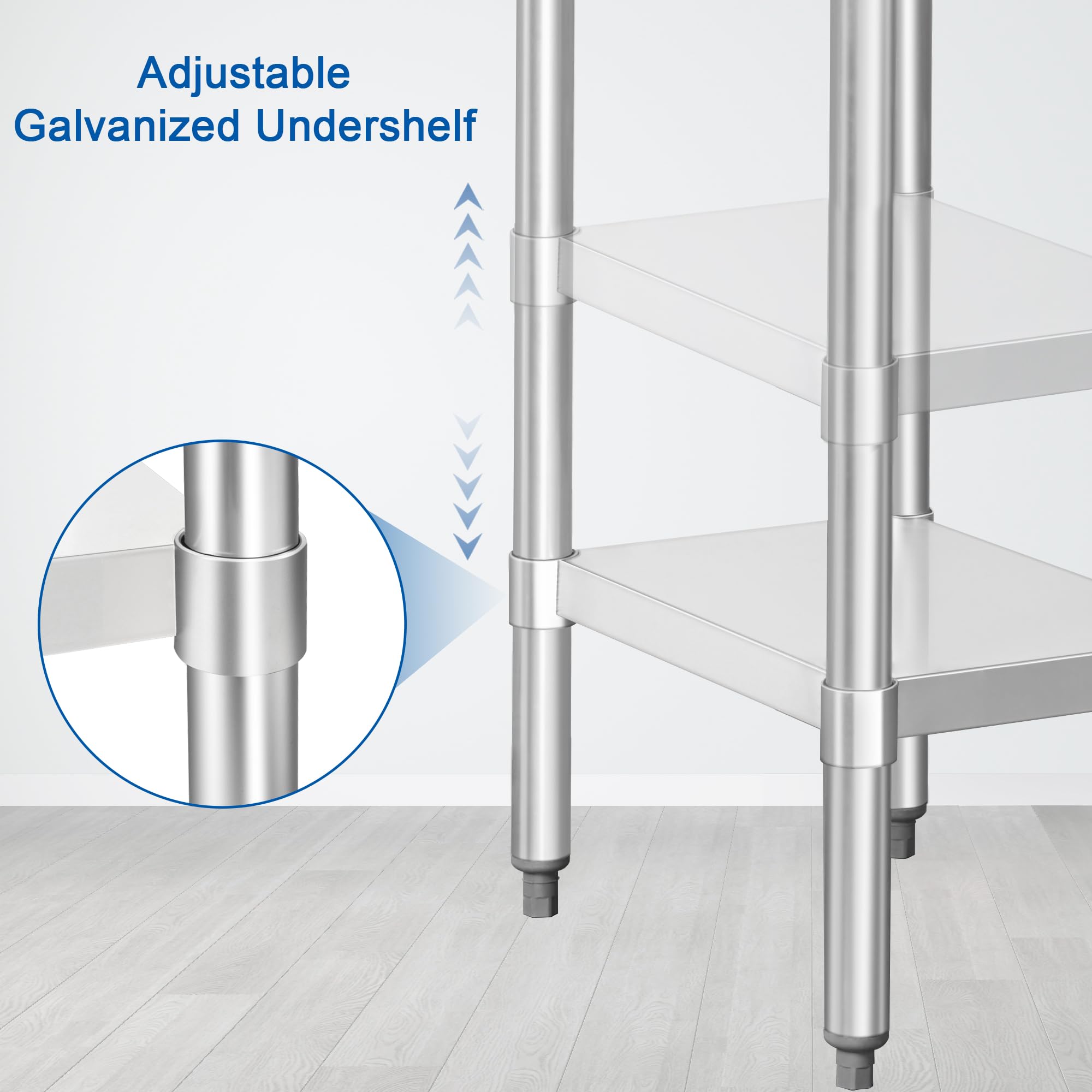 【ADJUSTABLE UNDERSHELF】- Stainless steel workbench with adjustable galvanized bottom shelf and 4 galvanized steel legs provides extra storage space. Aluminum corners are designed to take the quality of the workbench to a higher level. You can set the stainless steel table at different heights according to your needs for easy access.