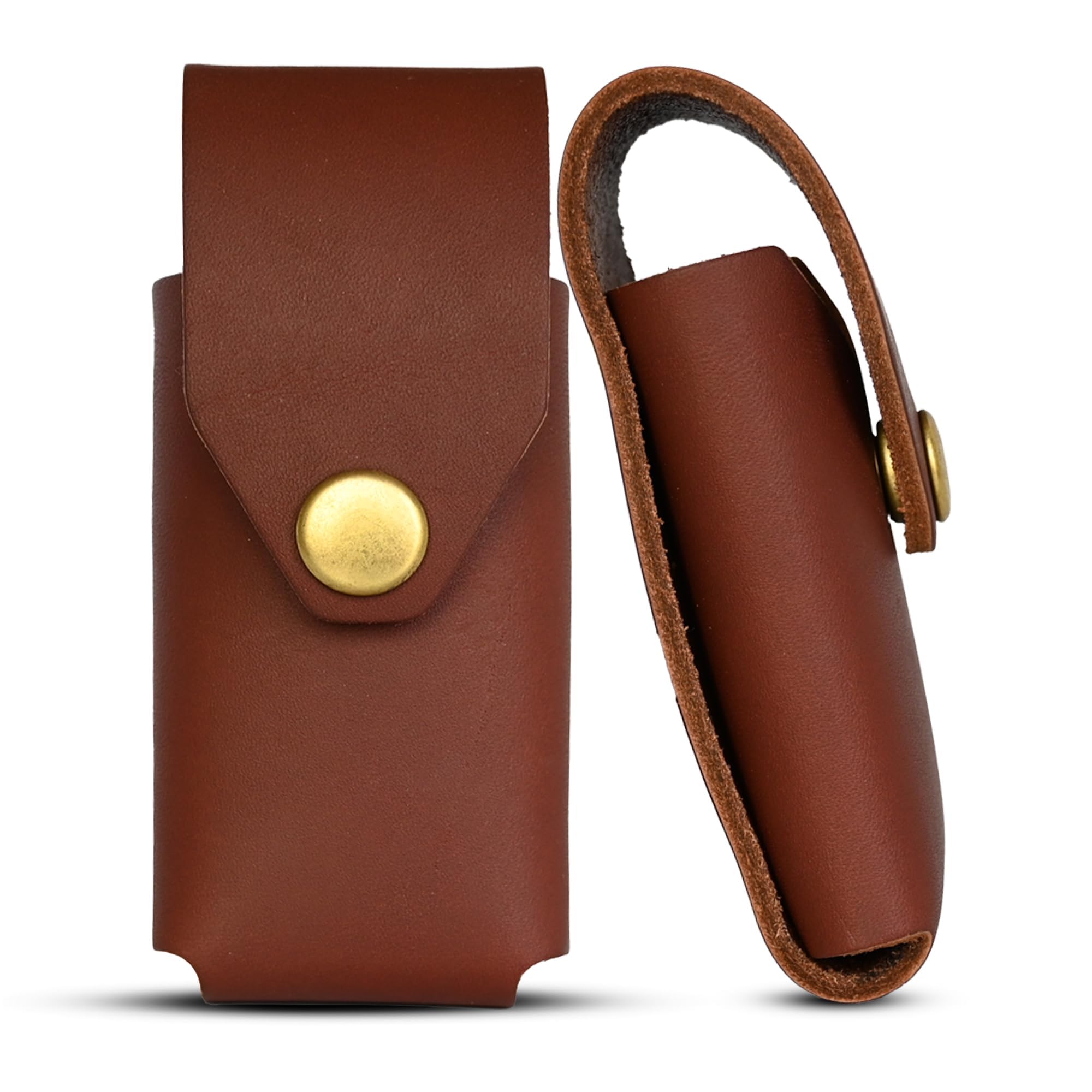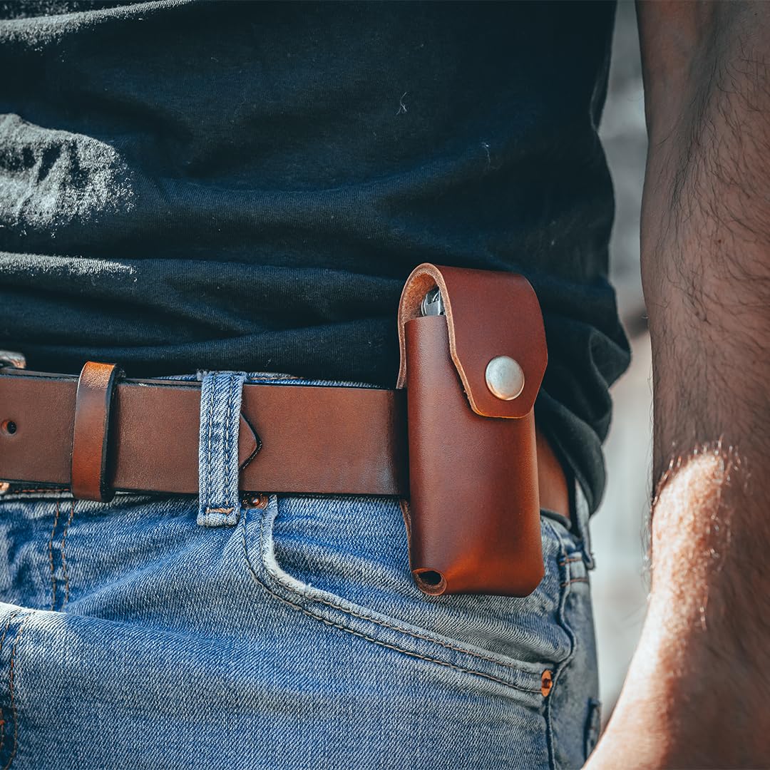Perfect Fit, Secure Carry: Our multitool sheath for belt is tailored to perfectly hold your multitool in place. The snug fit of the leather belt pouch keeps your tool secure, while the pass-through belt slot ensures comfortable carrying on your belt.