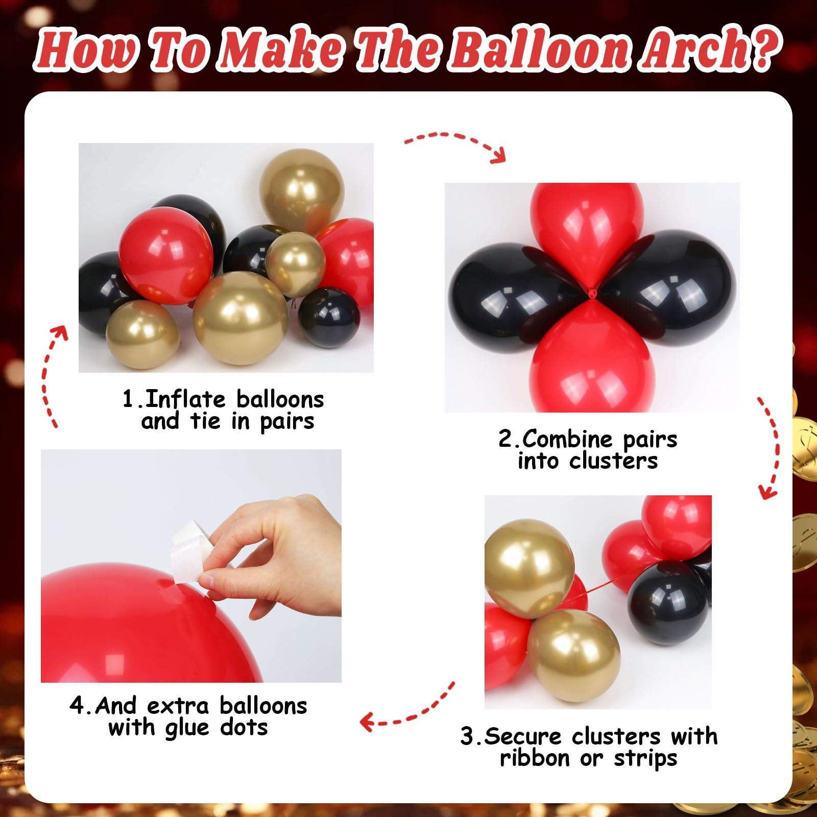 Easy to Assemble: The package include ribbons, glue dots, decorative strip to help you effortlessly assemble casino balloon arch kit. Firstly, blow up all the balloons with a hand pump. Then, fix the balloons together with ribbons or decorative strip to form a cluster balloons and hang it on the party background. Finally, stick the small balloon to decorate balloon arch with glue dots