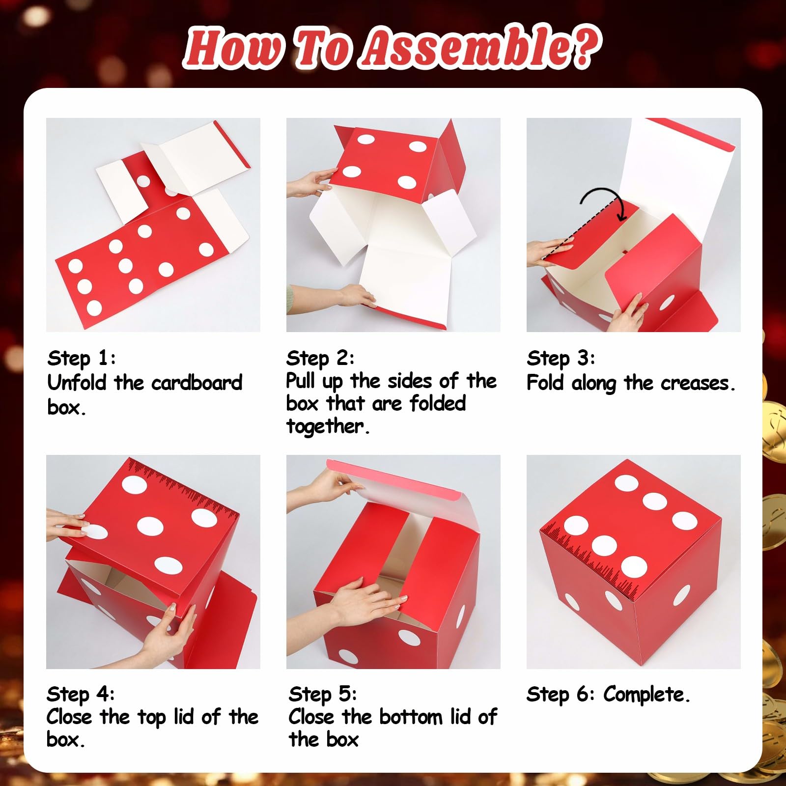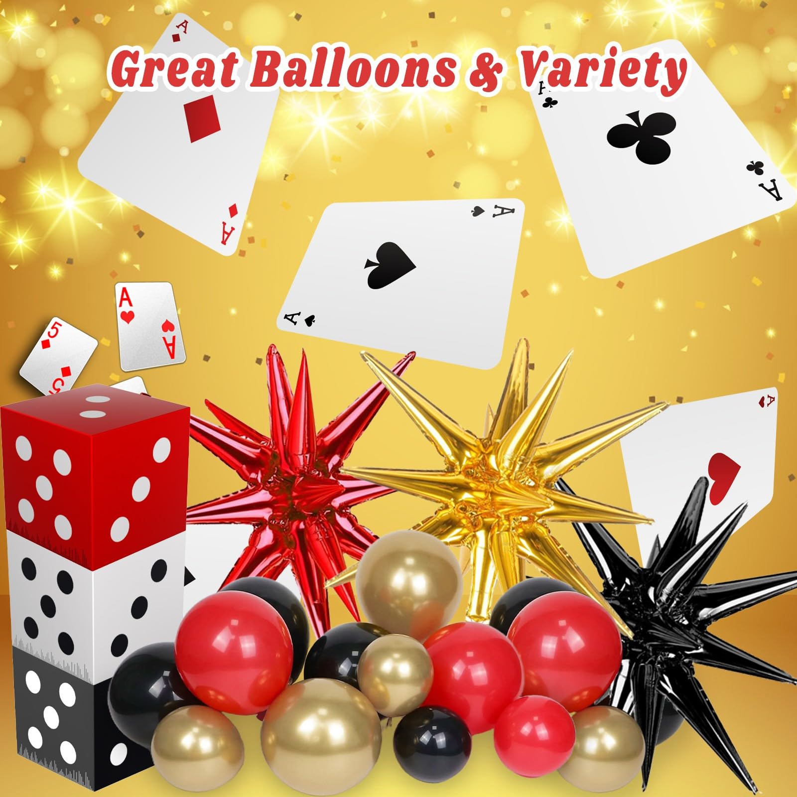 What You Get: The casino balloons include black balloonsx51(18inchx1, 12inchx10, 10inchx20, 5inchx20), red balloonsx51(18inchx1, 12inchx10, 10inchx20, 5inchx20), metallic gold balloonsx30(10inchx20, 5inchx10), 7x5inch random pokersx5, 11x11x11inch dice boxesx3, 22inch foil balloonsx3, red ribbonx1, decorative stripx1, glue dotsx100