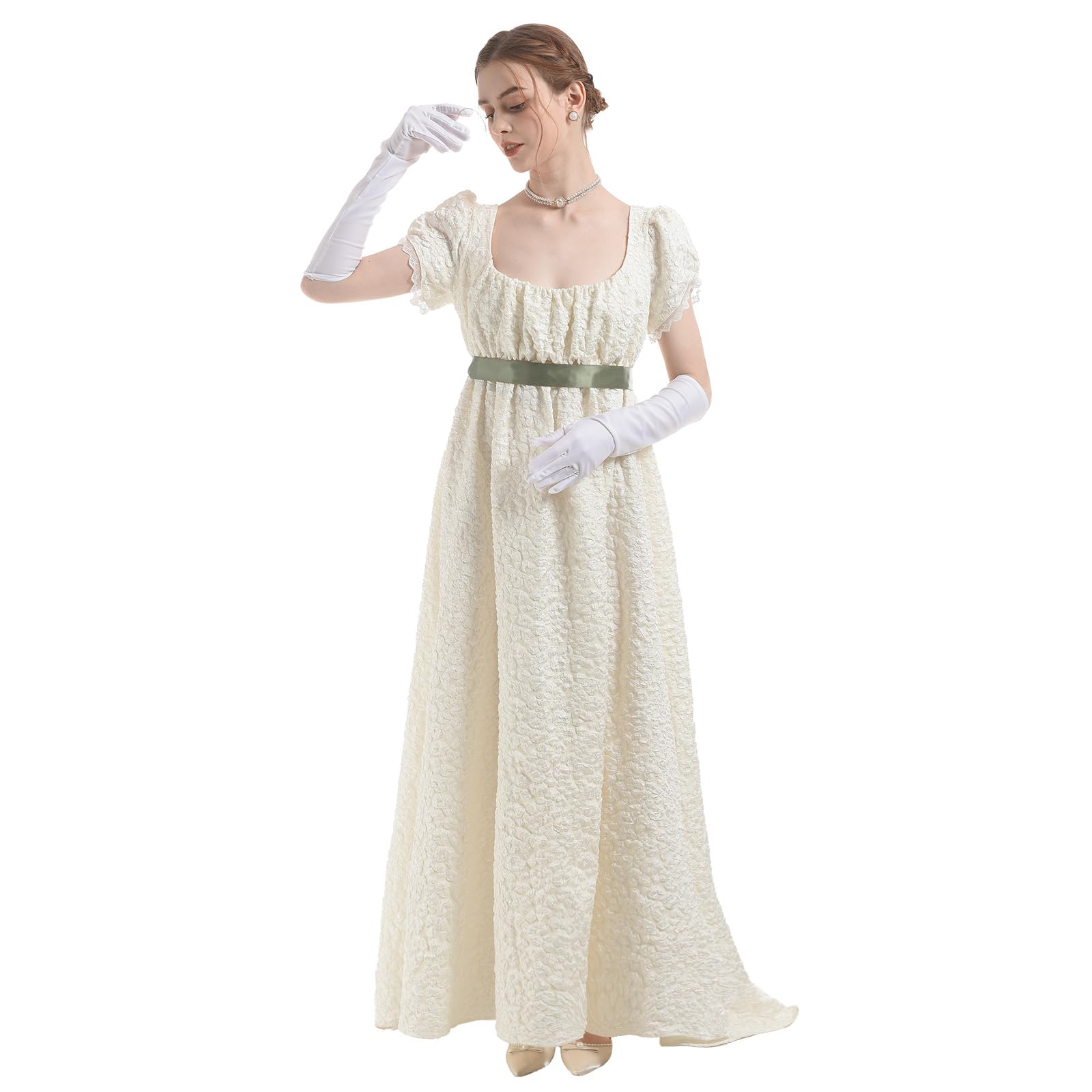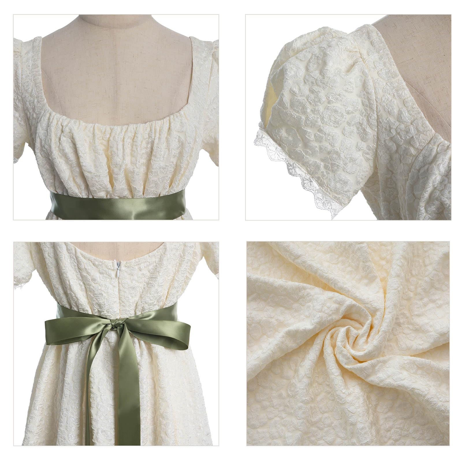 Package included - 1* regency dress; 1* green satin sash. We provide one satin sash for this light champagne regency gown, ties into a bow or knot at back, elegant and chic.