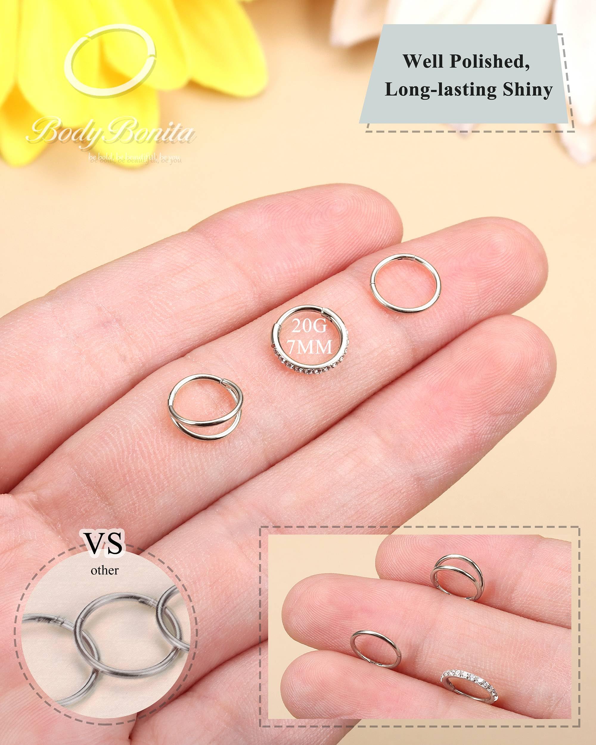 Description What you get: 3 pcs of BodyBonita seamless nose ring(14K gold plated/silver/black plated/rose gold plated ), crafted to be brilliantly shiny, hypoallergenic, and effortlessly easy to put in and take out. Materials: 316L stainless steel. Style in One Package: cubic zirconia nose hoop, double nose ring hoop, classic single nose rings hoop. Available Color: 14K gold plated/silver/black plated/rose gold plated. Avaliable Gauges Size: 14g, 16g, 18g, 20g. Avaliable Inner Diameter : 7mm, 8mm, 9mm, 10mm. Product Types: Lip piercing/aretes para labios, Septum ring, Hoop belly button rings, Cartilage earring, Daith piercing jewelry, Conch hoop earring, Helix earring, Tragus earring, Rook earrings, Acero inocidable dorado arete percing, Nipple rings.