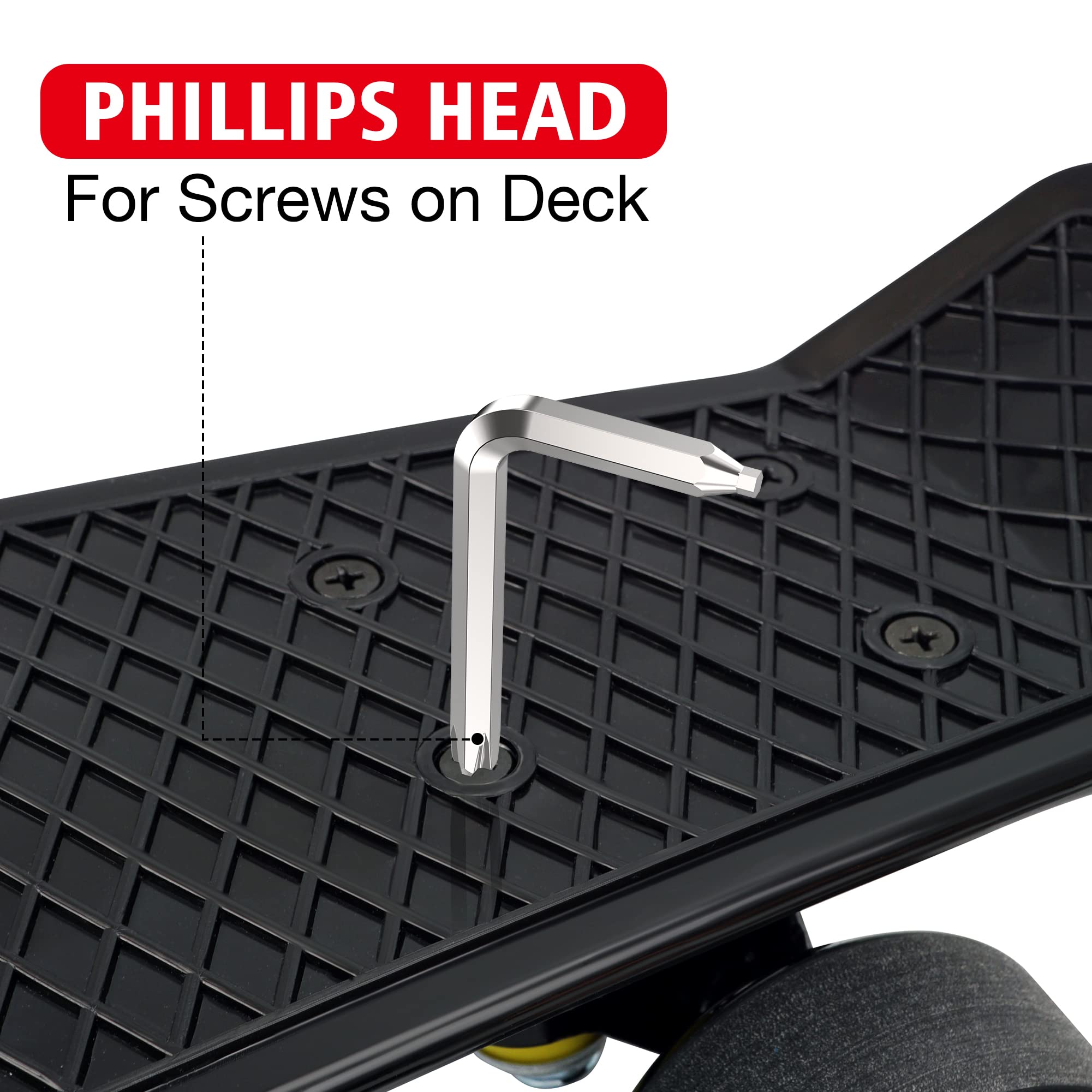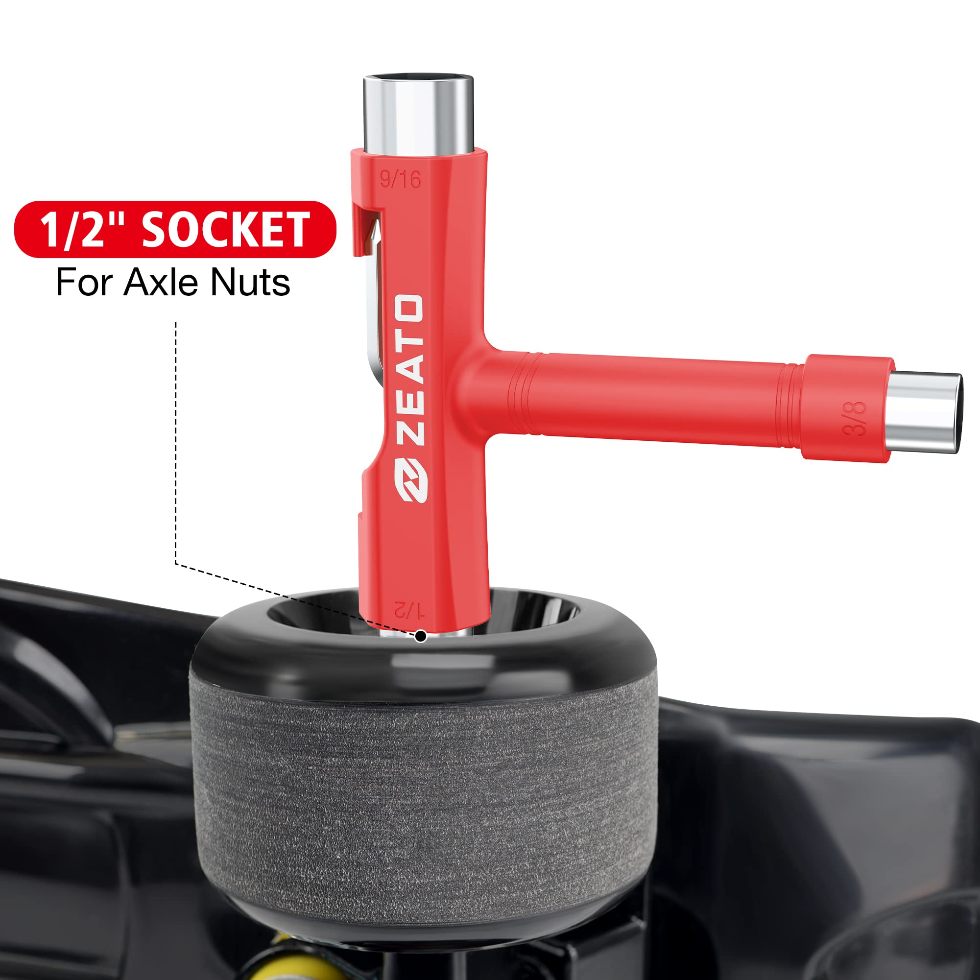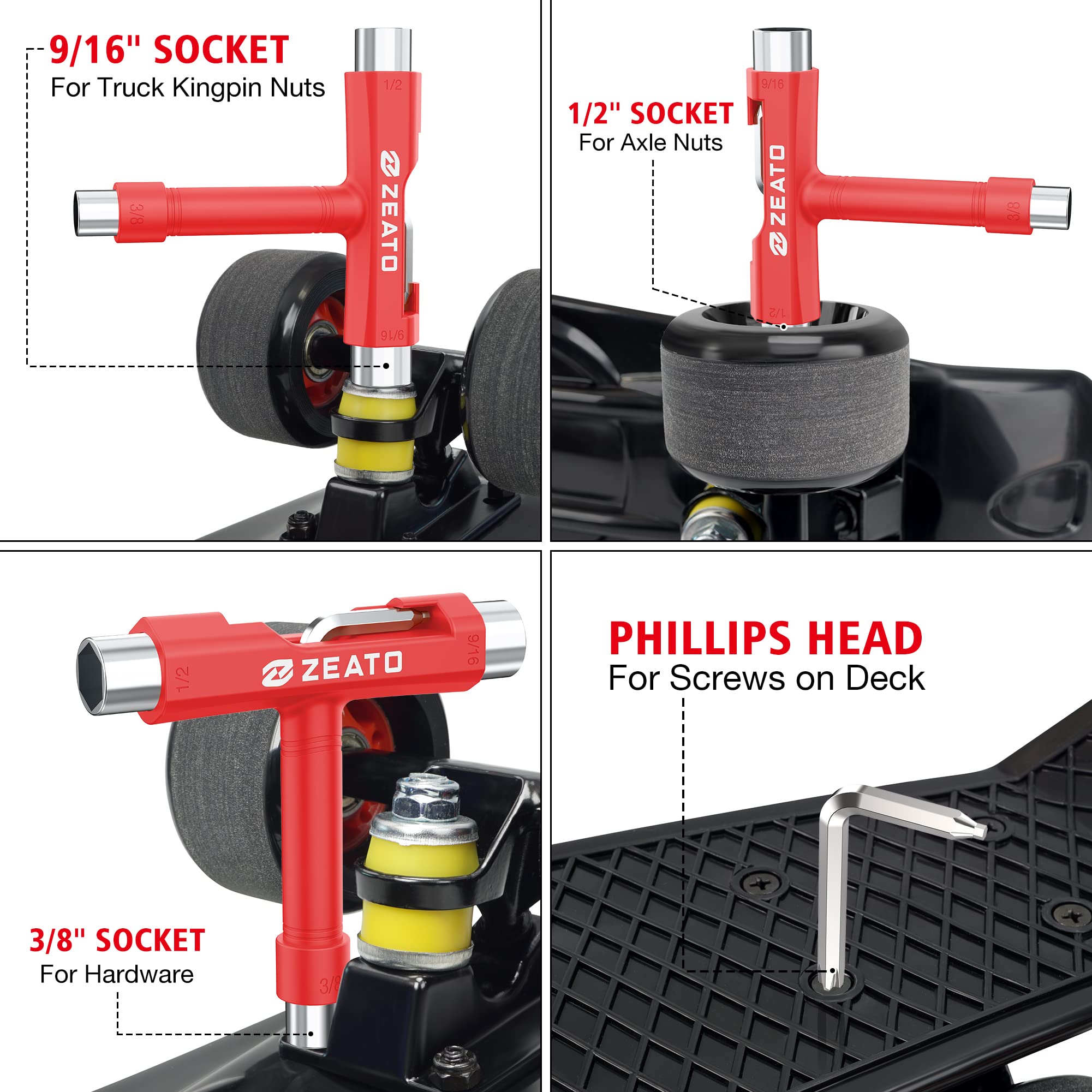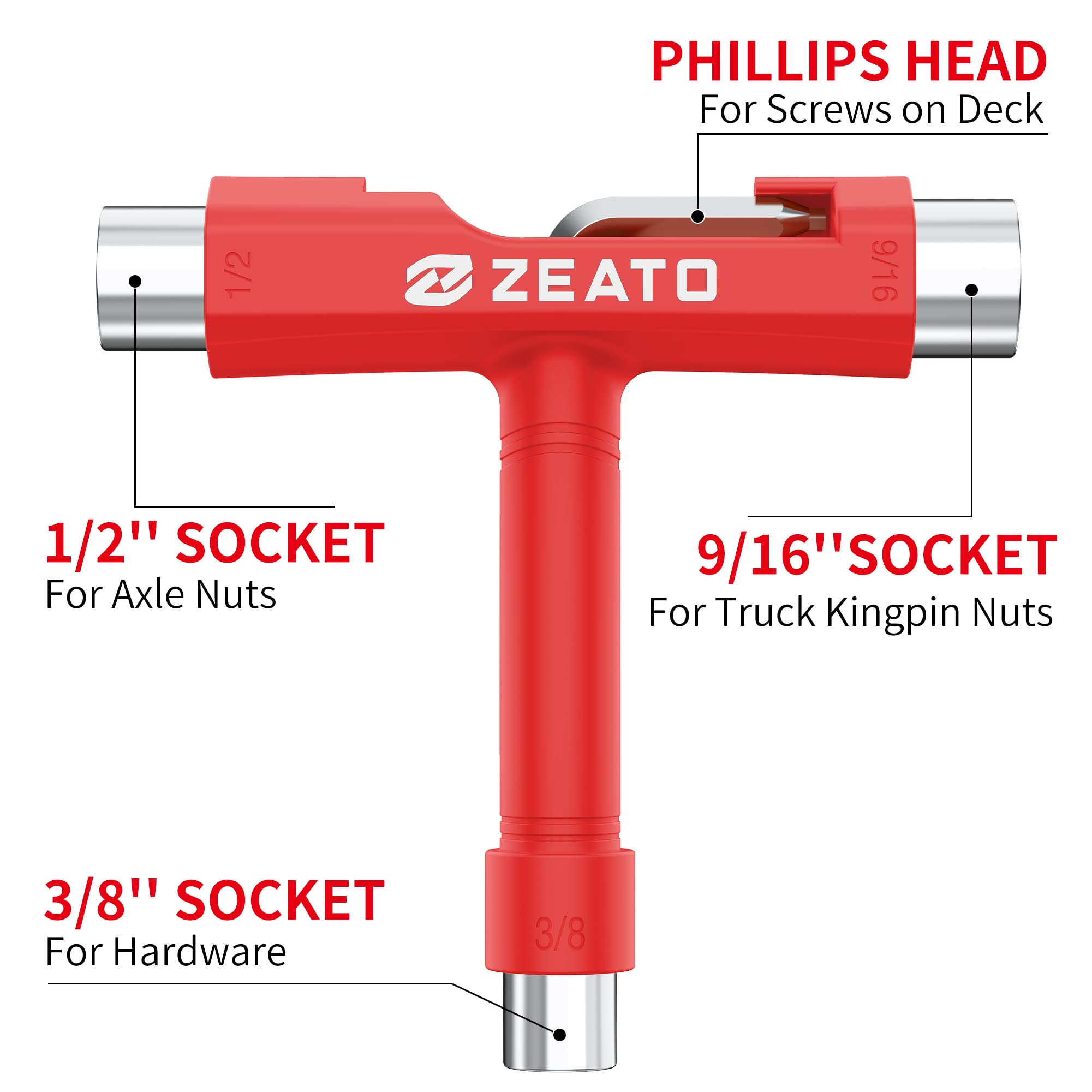 [Anti-Loss Structure]: The skateboard T tool includes 3 different sizes of sockets (3/8", 1/2", 9/16") and a slide-out Phillips head wrench screwdriver that fits into the top of the handle when not in use