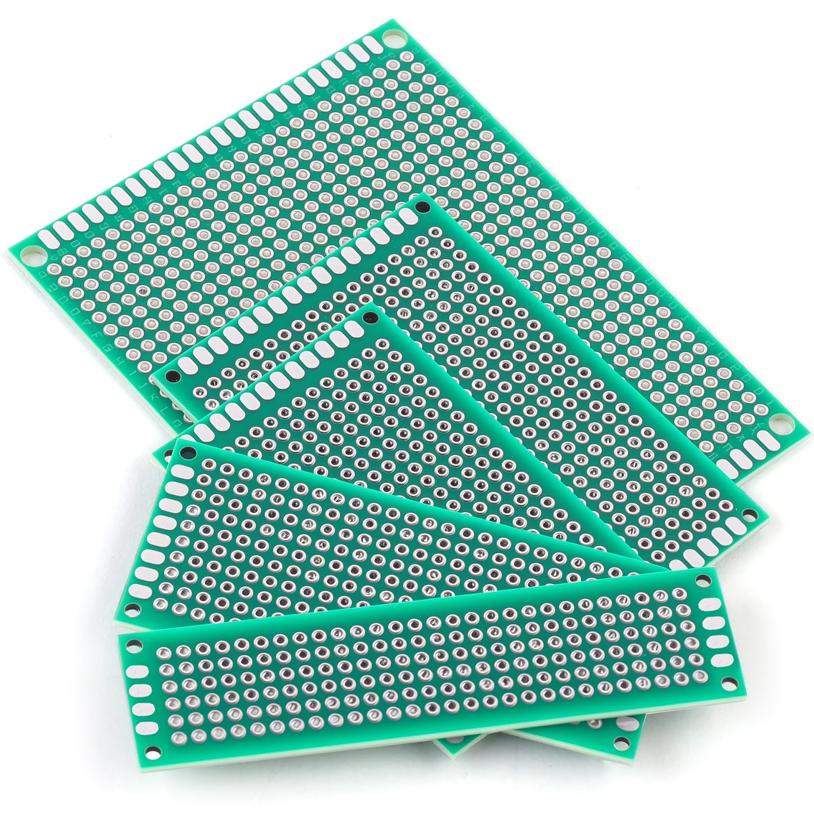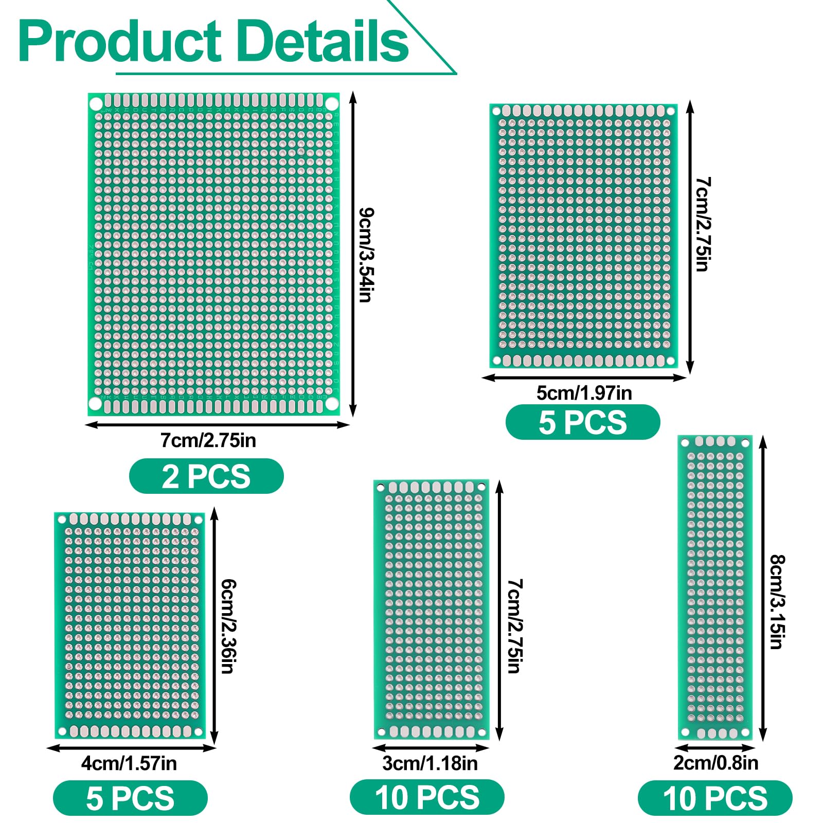 Package Includes: The product contains 5 different sizes of circuit boards, 10Pcs 2x8 cm, 10Pcs 3x7 cm, 5Pcs 4x6 cm, 5Pcs 5x7 cm, 2Pcs 7x9cm, 32Pcs in total, it is the standard tenth-inch (0.1") spacing