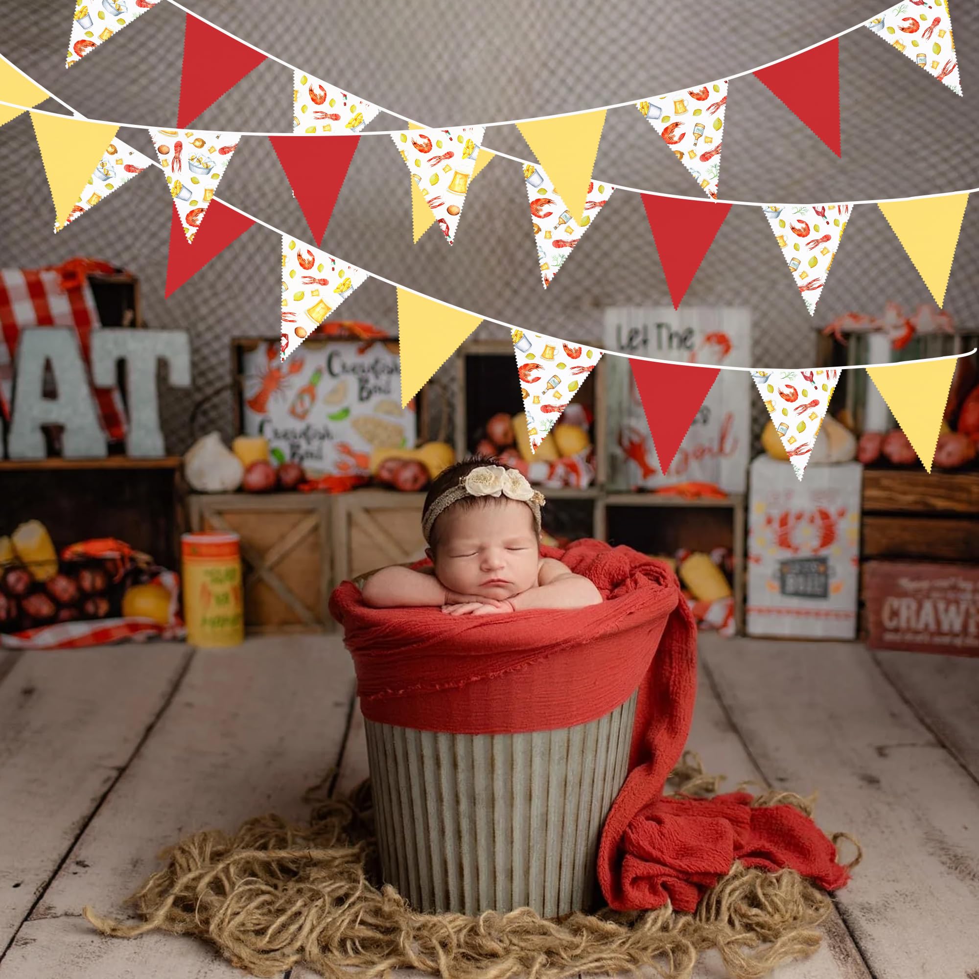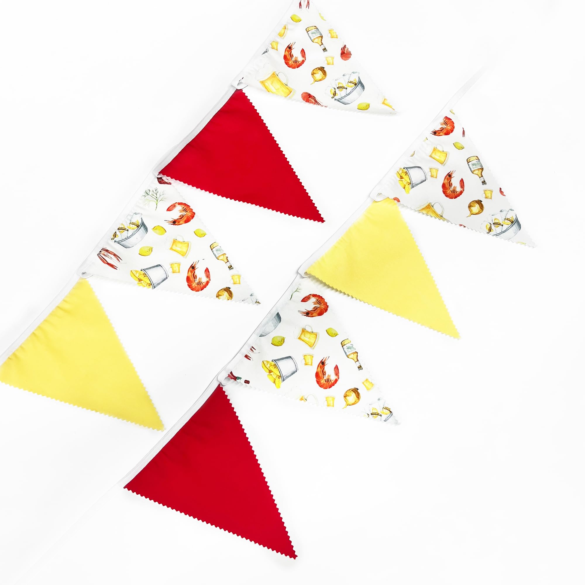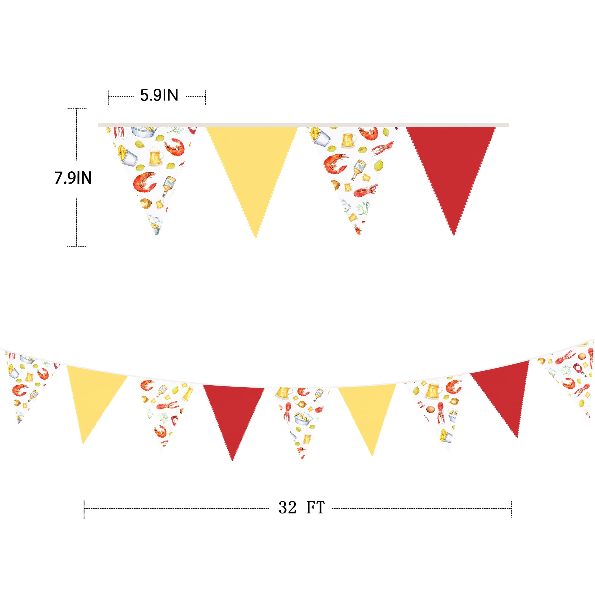 Package Including:1 pack crawfish boil theme fabric bunting banner garland in red, yellow and crawfish beer printed colors, with 36pcs flags in 10M/32.8Feet. Flag Size: 5.5in width x 7in height.