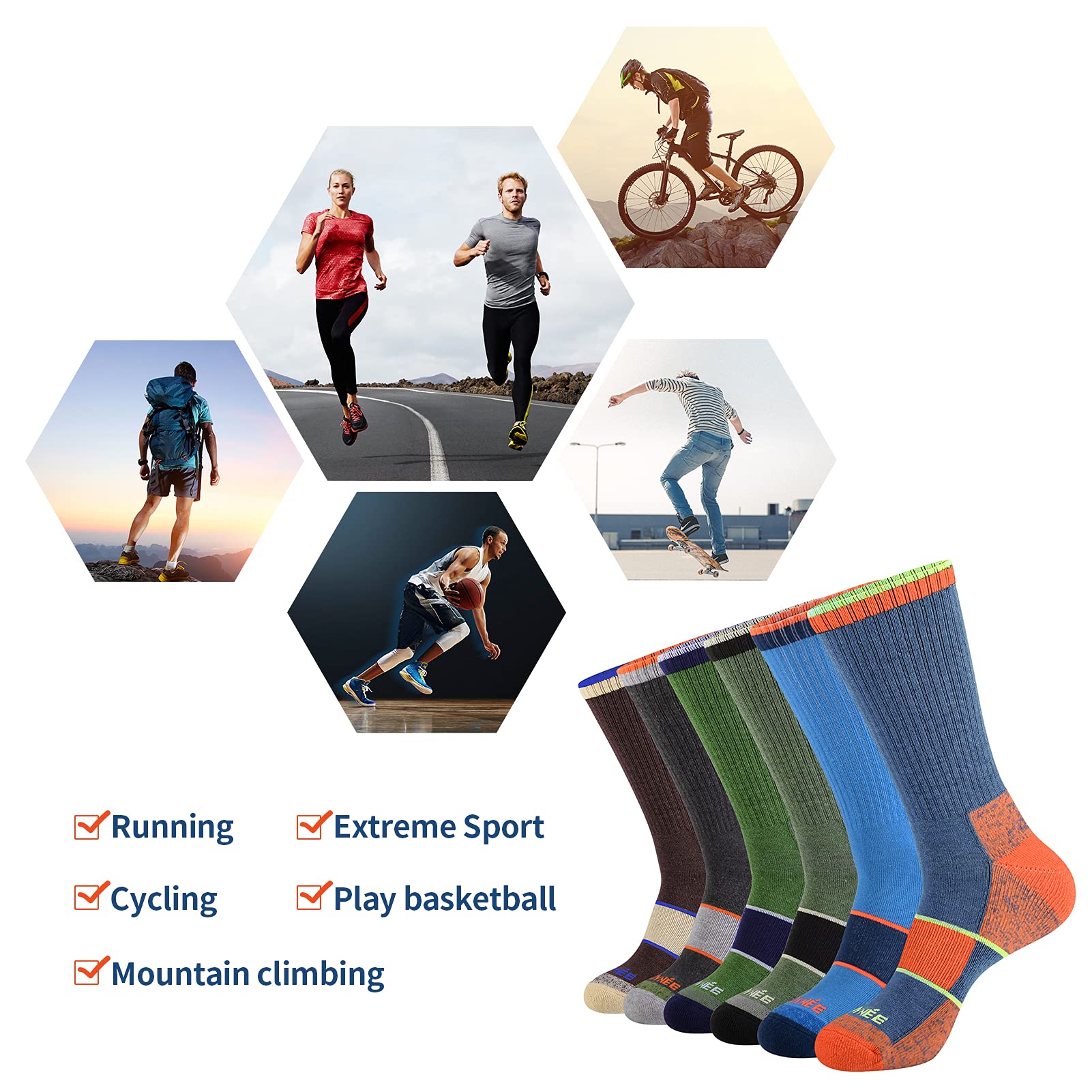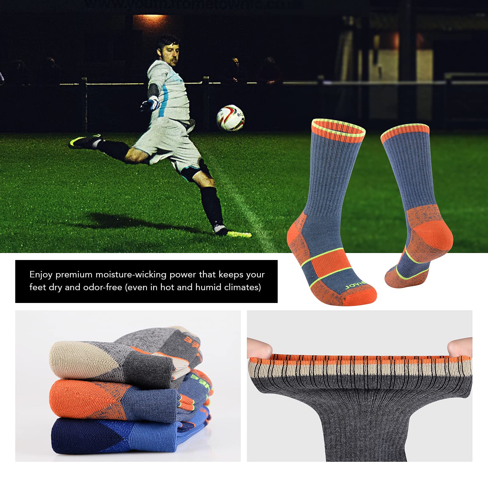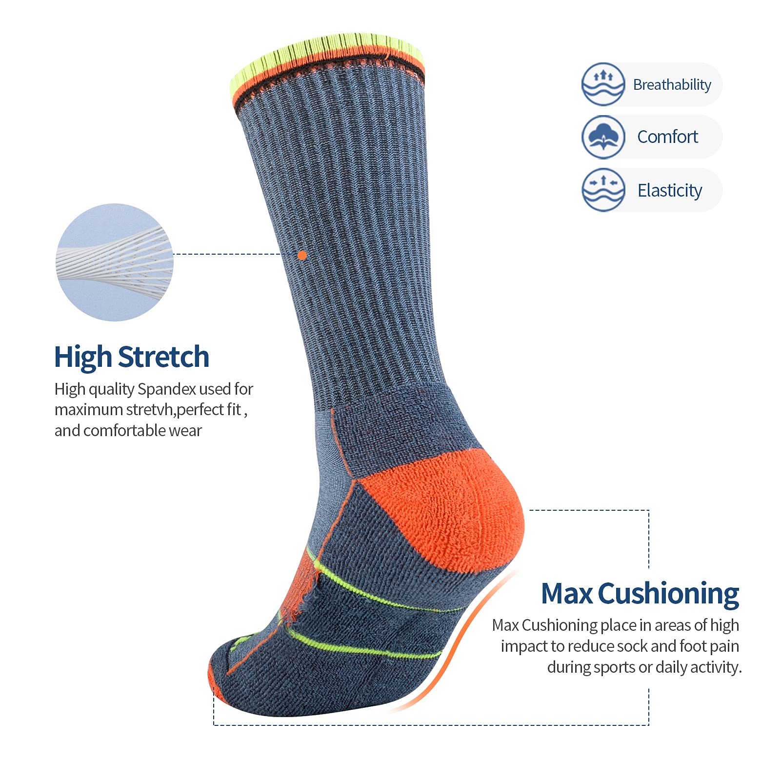 QUALITY MEN'S SOCKS: Made of 95% polyester,5% spandex. Our men's crew socks are strong, durable and breathable enough to keep your skin dry and comfort. We guarantee you will love our mens full cushioned sport socks, well for used as walking, cycling, jogging, running, work out, gym, training, home, casual, tennis, golf, daily wear etc.