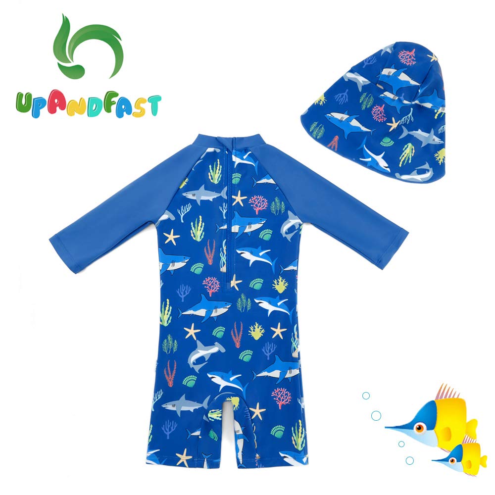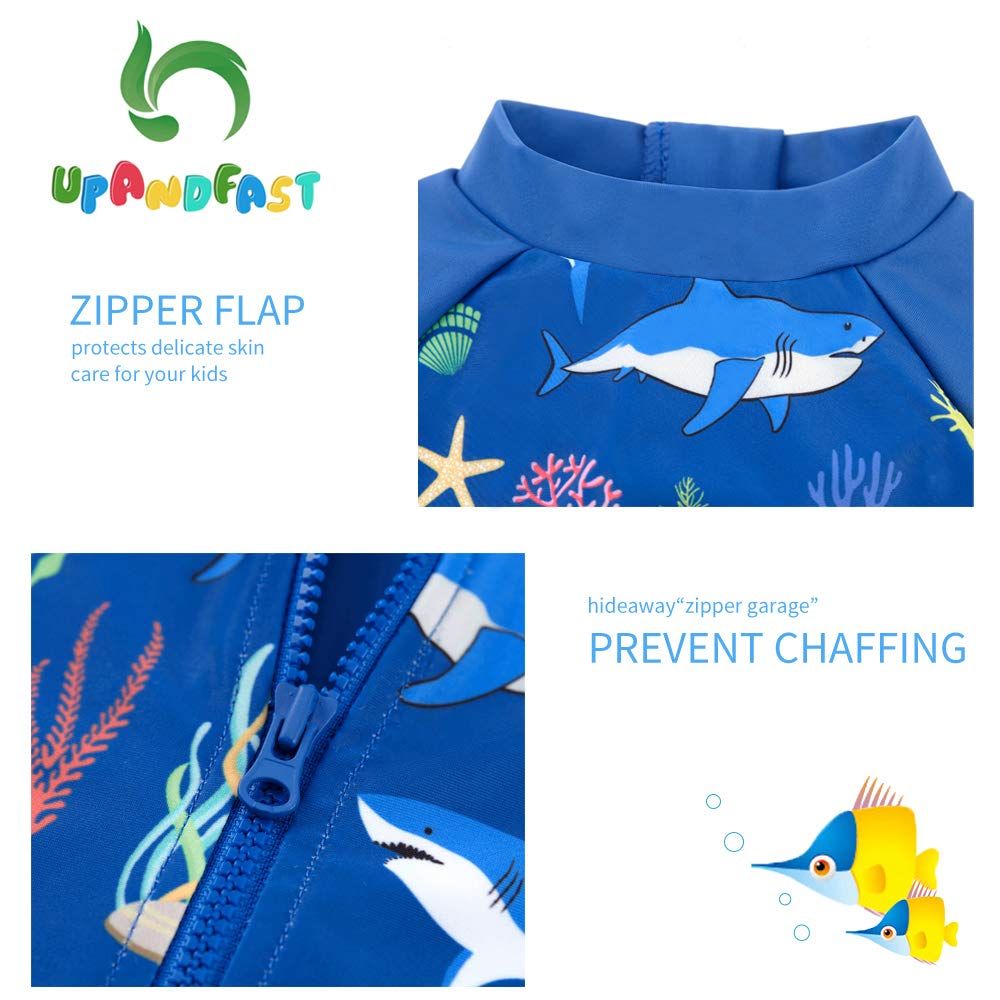 HUMANIZATION DESIGN: This one-piece baby bathing suit has a front / back zip for convenient putting on and taking off. Zipper flap and garage protect your baby's delicate skin
