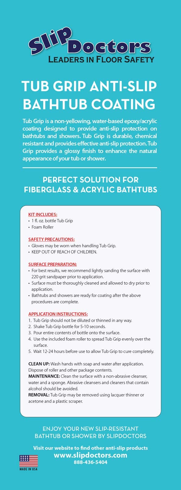 EASY APPLICATION: One Tub Grip covers one standard size bathtub or shower. Porcelain tubs MUST be etched prior. Use the included roller to make application a breeze! Detailed instructions are included with every purchase. Tub Grip is low odor. Easy removal with lacquer thinner and a plastic scraper.