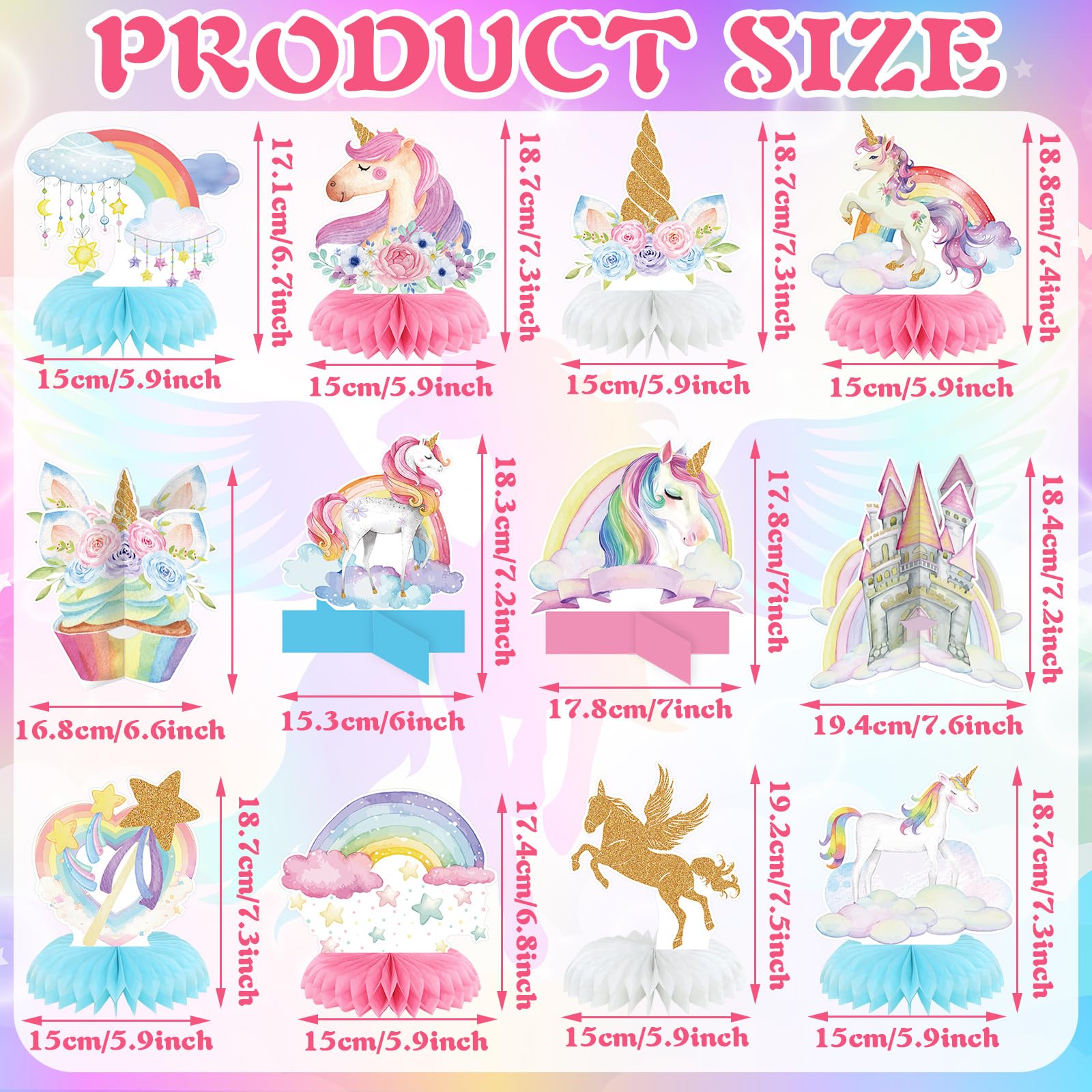 Package Contents: our package contains 12 unicorn rainbow honeycomb ornaments with 12 different designs; The lovely designs and suitable size make these decorations become shiny and lovely party supplies at birthday party; Sufficient in quantity and diverse in designs to meet your decorative needs
