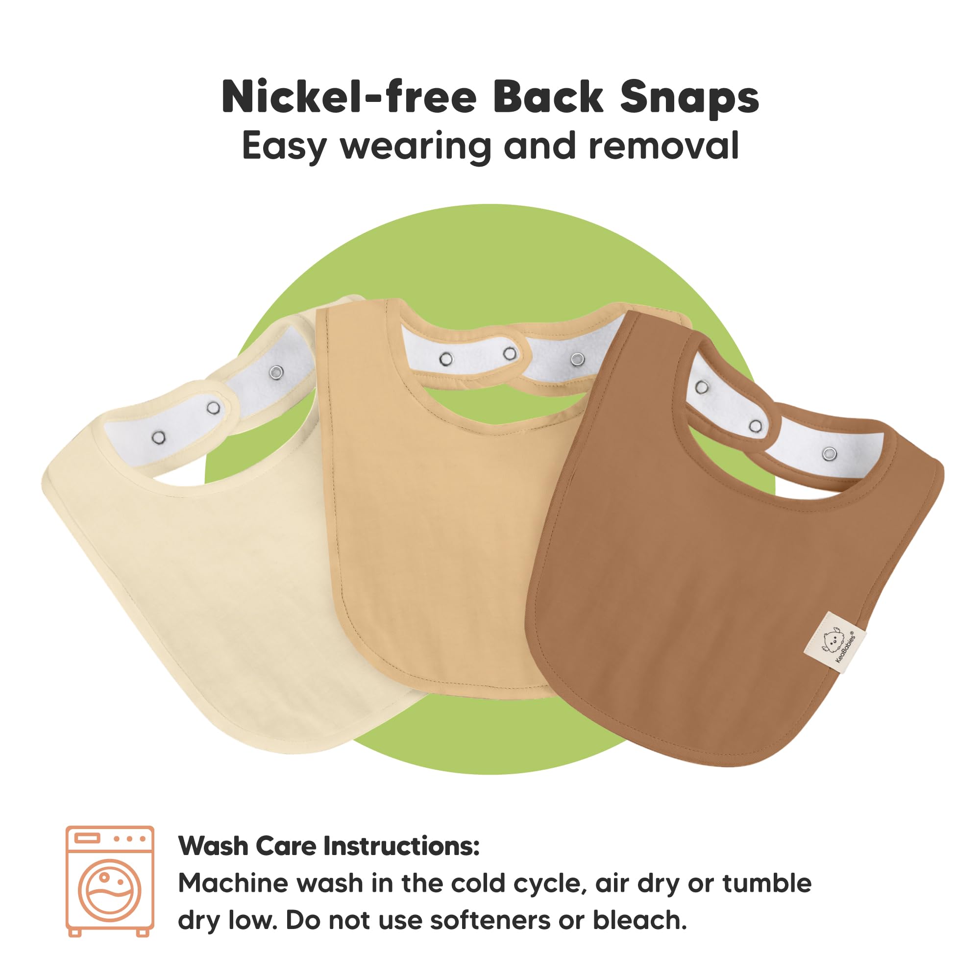 3 Adjustable Size With Soft Seams - With 2 sets of easily fasten nickel free snaps, you can adjust the girl and boy bibs according to your baby’s neckline. The soft wrapped organic cotton seams provide extra comfort for your baby and they won’t feel a thing while having the baby cotton bibs on. Suitable for newborn babies up to 24 months.