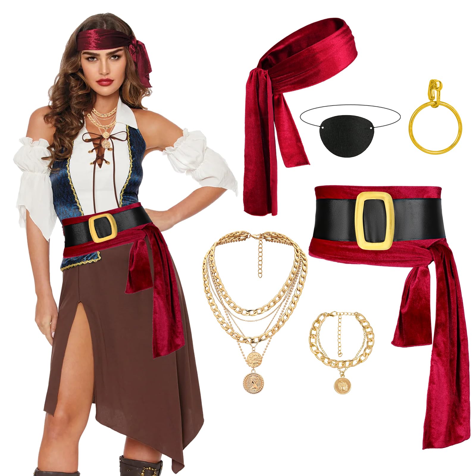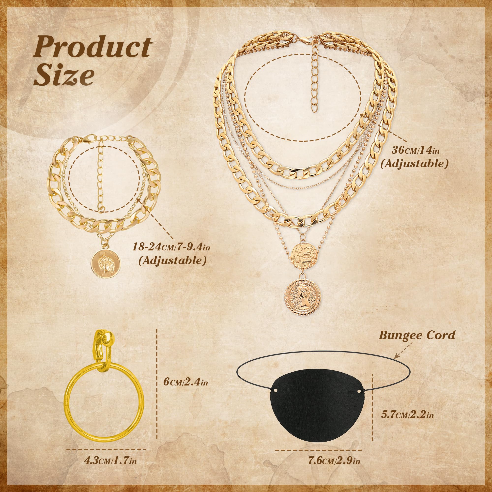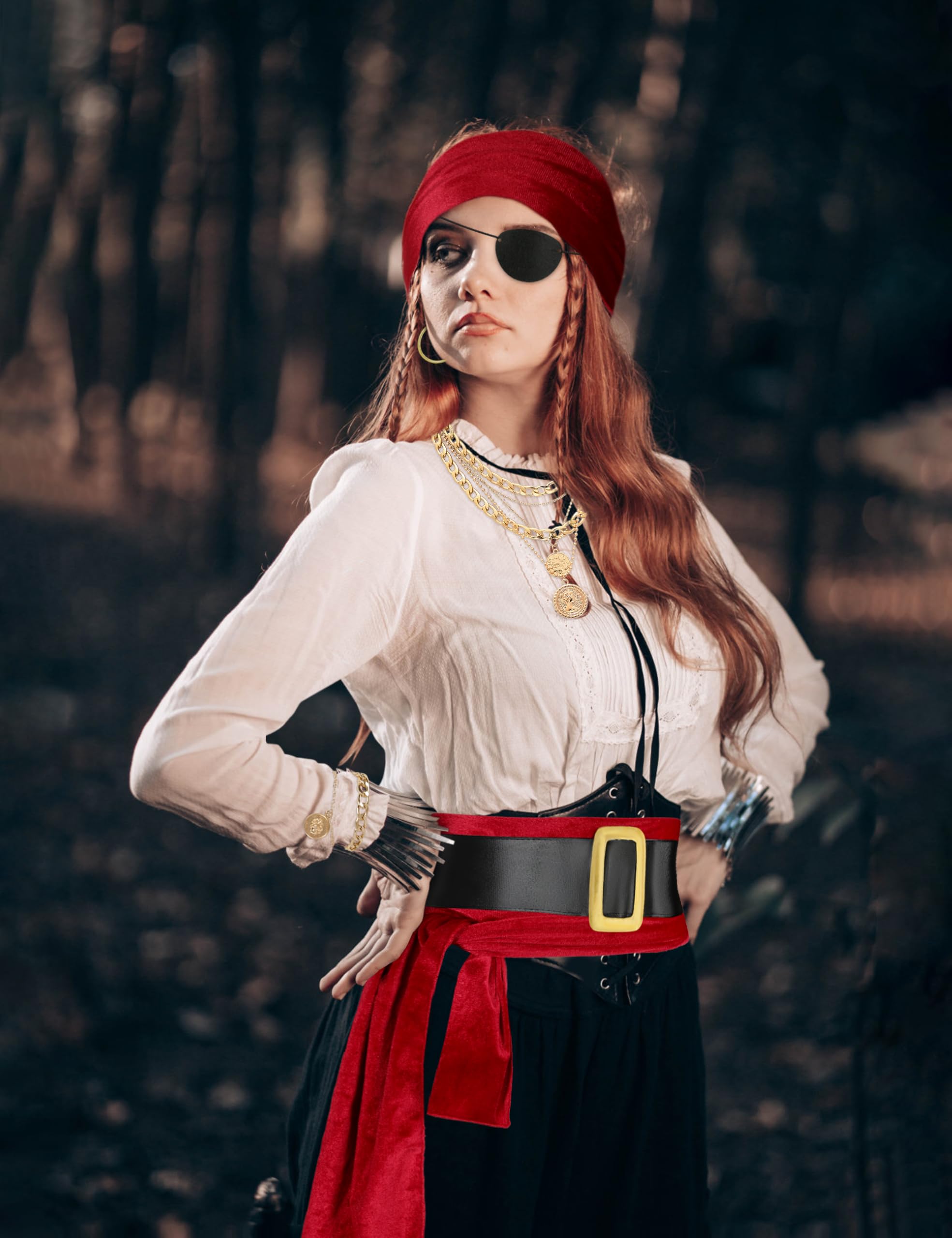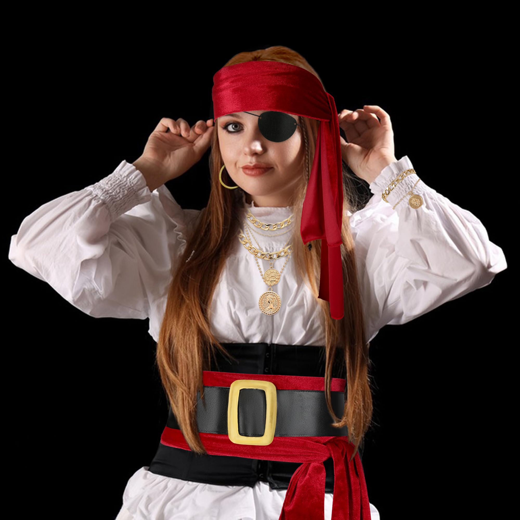6 PCS Pirate Accessories Set Package includes: 1 piece pirate bandana, 1 piece pirate large sash,1 piece Bracelet,1 piece necklace,1 piece eye patch,1 piece earring