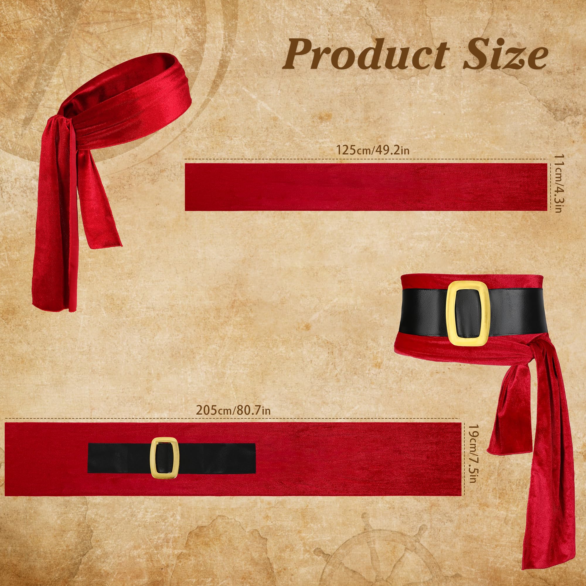 Size: pirate bandana: approx. 47 x 47 x 57 inch/ 120 x 120 x 145 cm; Pirate large sash: approx. 137 x 9.05 inch/ 365.76 x 25.4 cm; Please make sure the size before you buy it