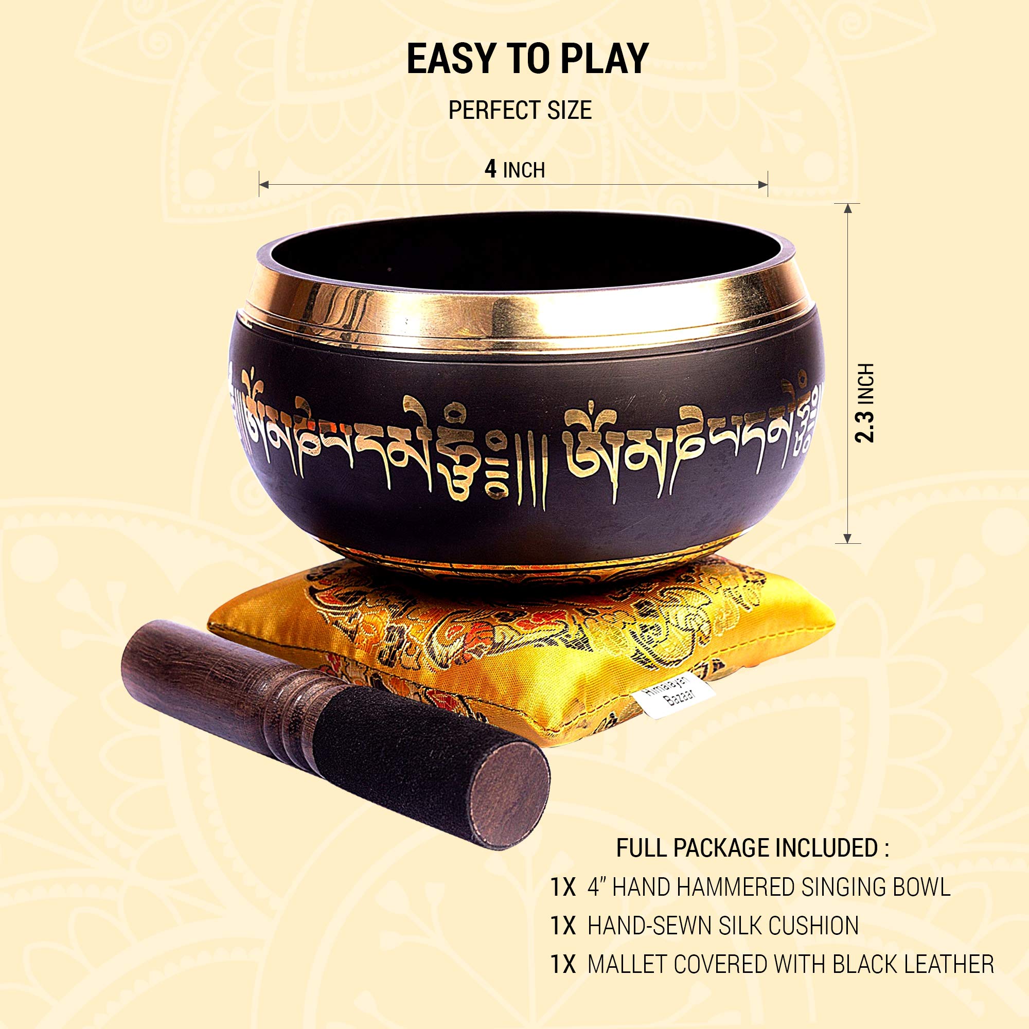 COMPLETE SET: Includes 4” Hand hammered singing bowl x 1, hand-sewn silk cushion x 1, mallet covered with black leather x 1. A full set designed to create a peaceful environment for meditation, yoga, and relaxation.