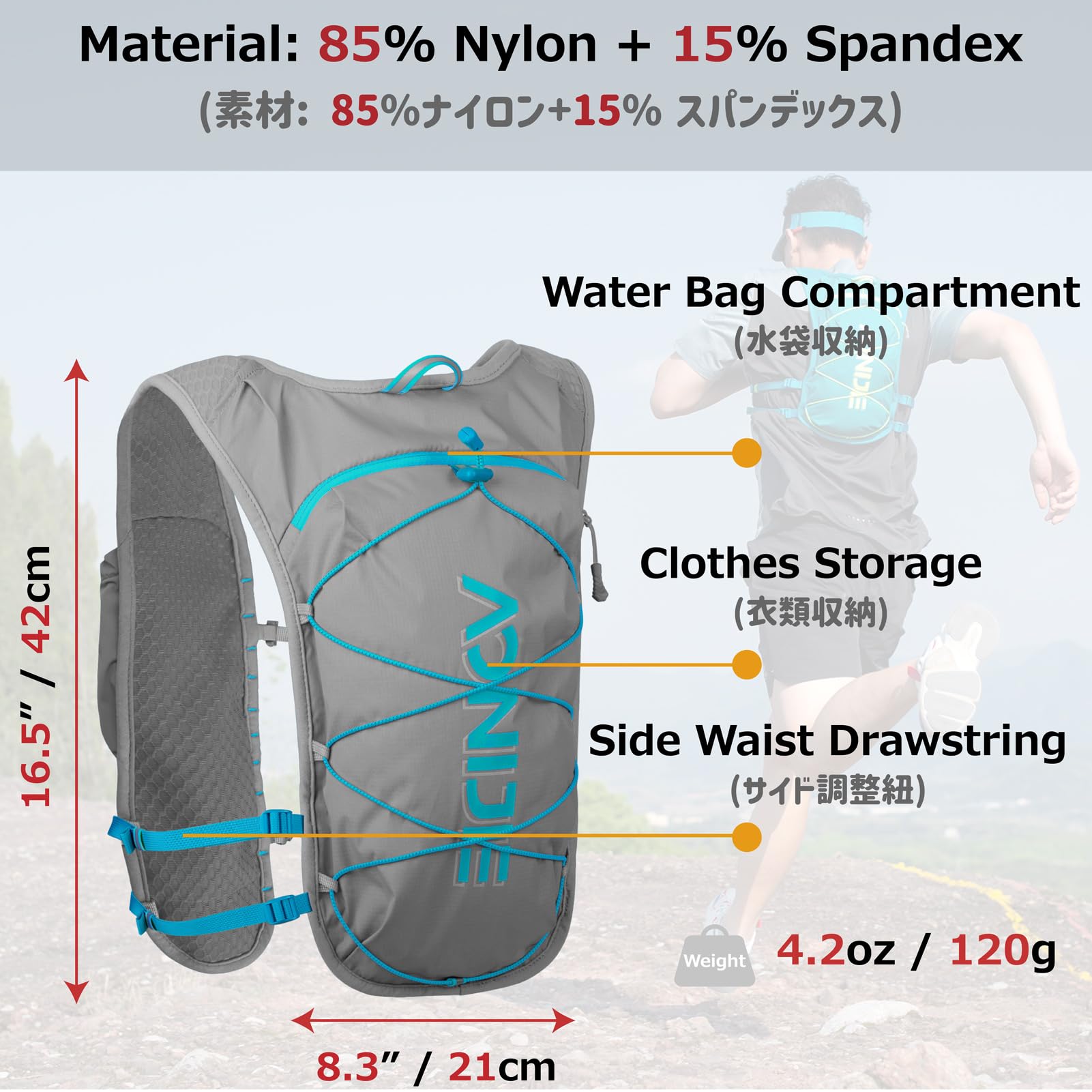 High quality hydration backpack: Made of premium nylon, more wear resistant and durable. Breathable fabrics on the back and shoulders ensure breathability and comfort, so you don't get stuffy while exercising