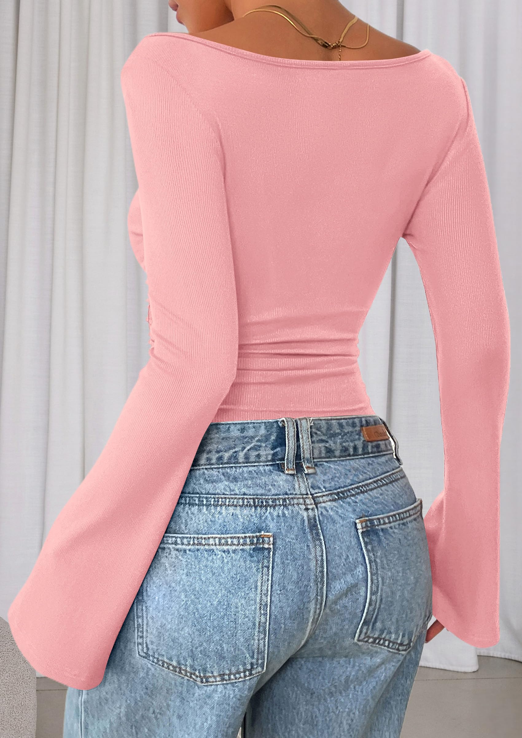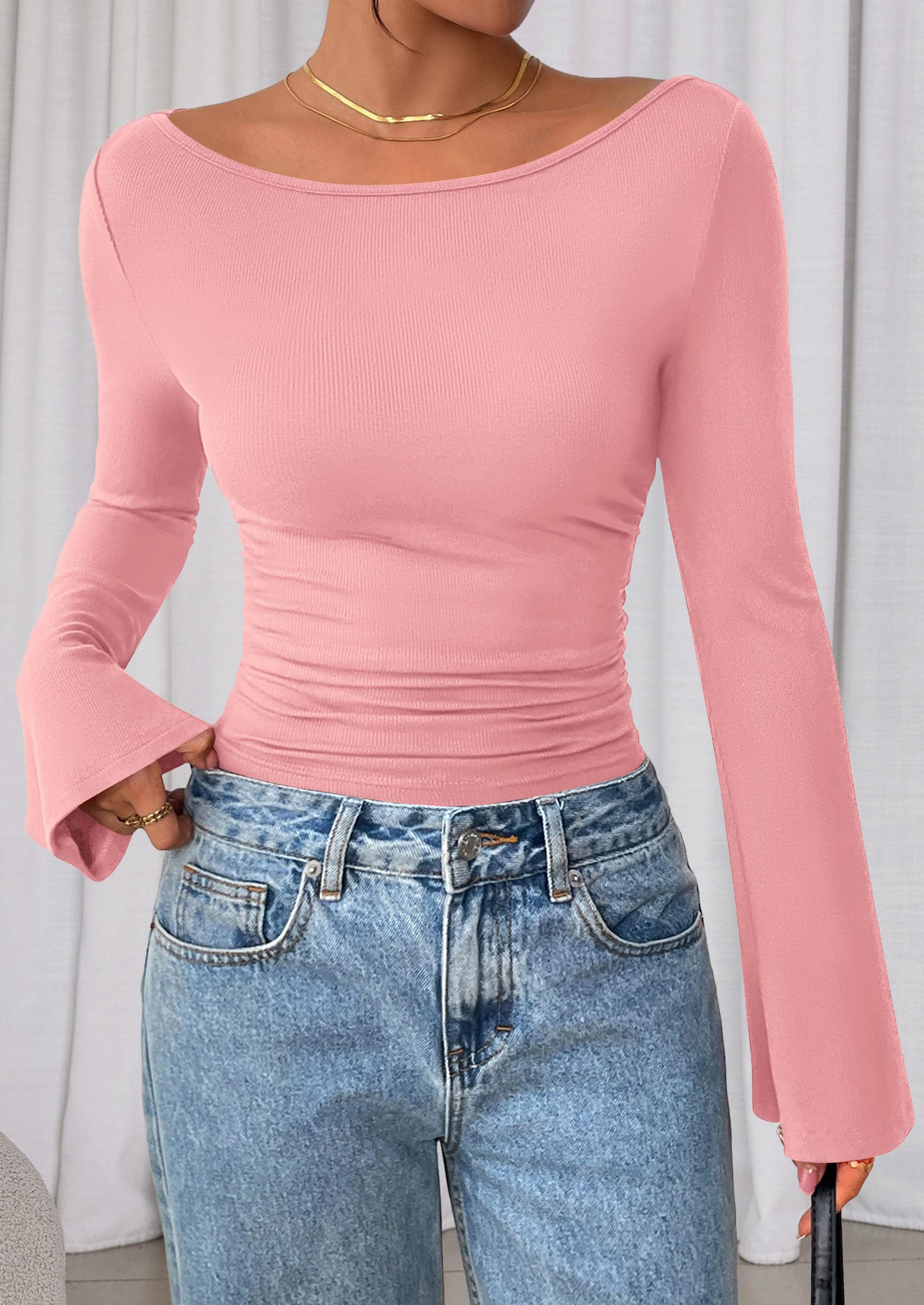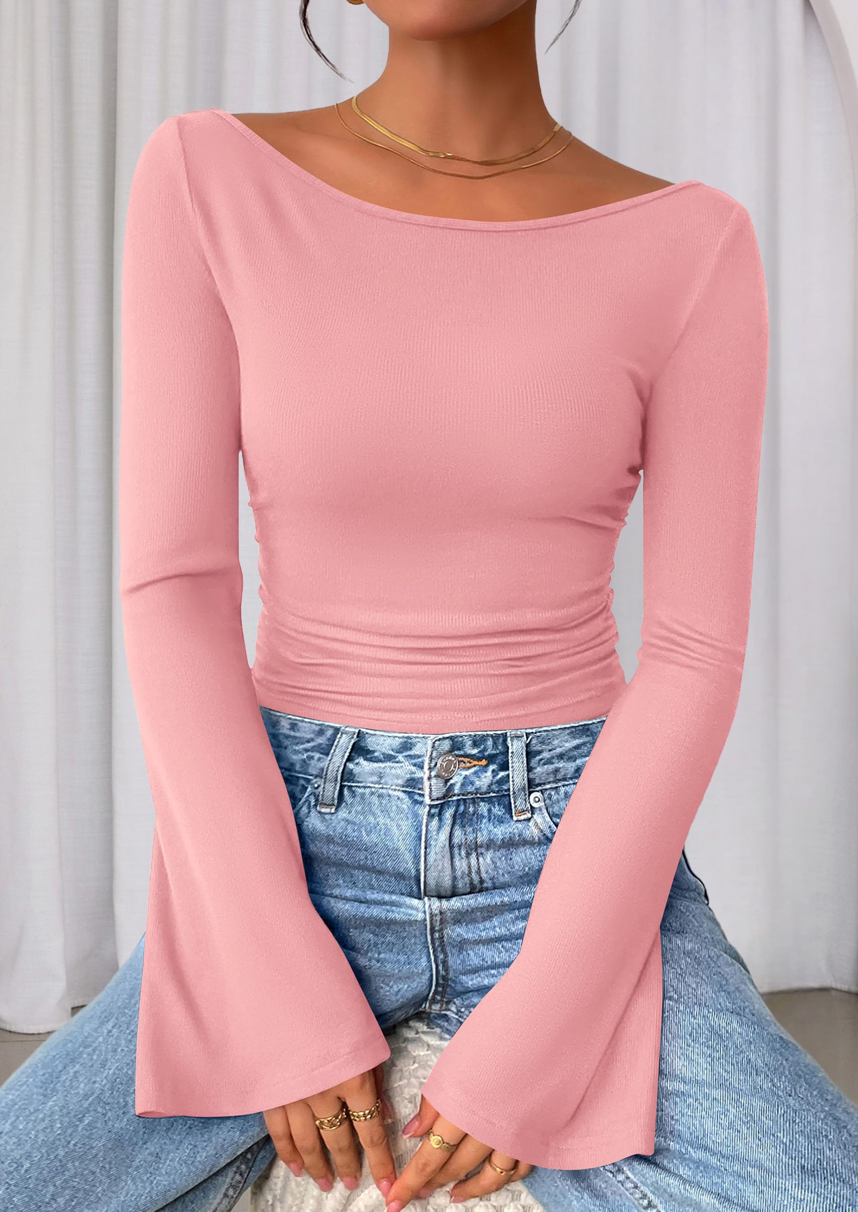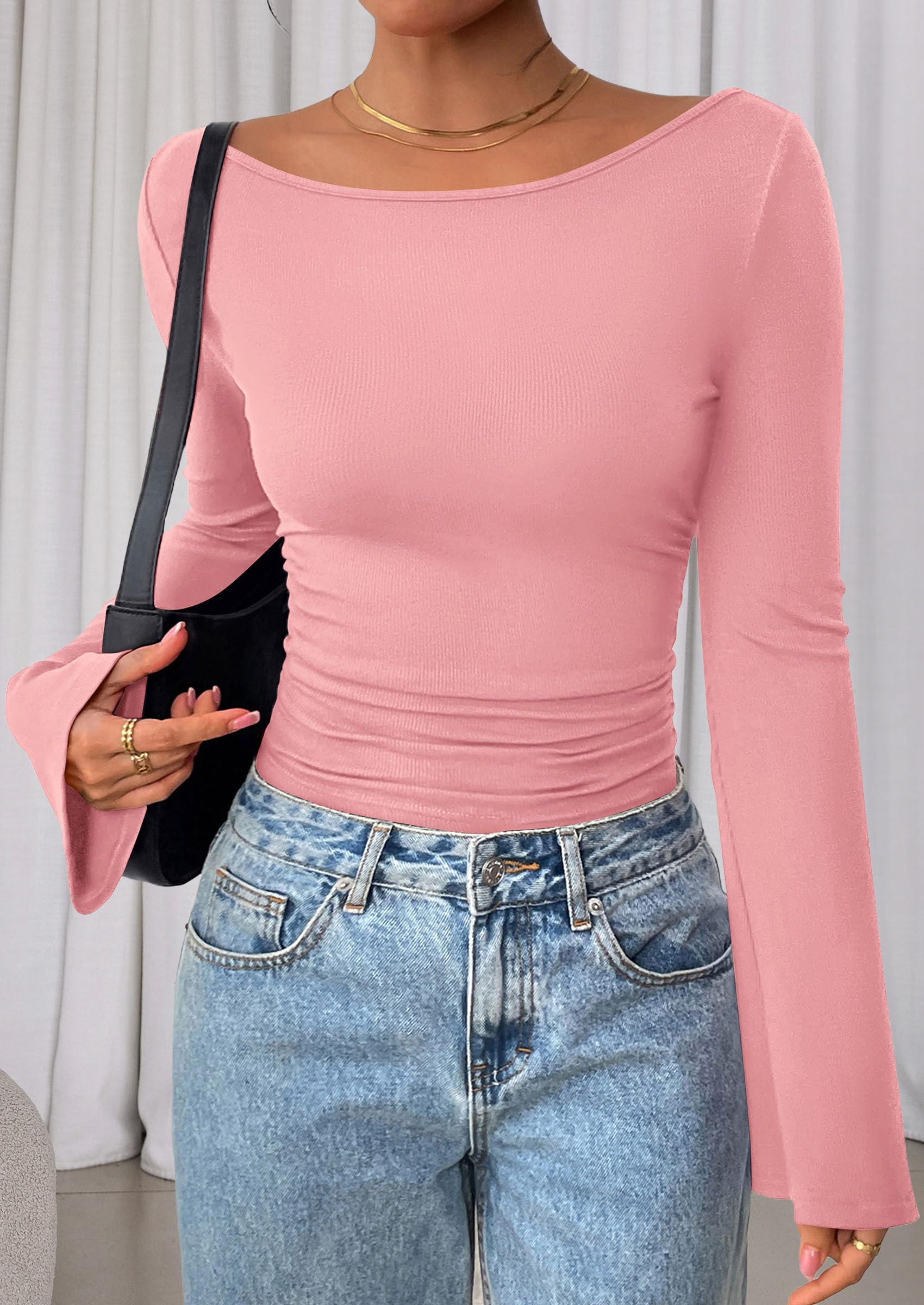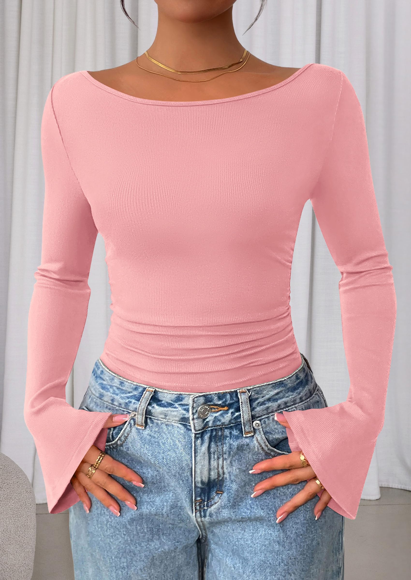 Features: Boat neck tops for women, y2k tops, ribbed knit fitted casual tees, plain T-shirts for women. Bell sleeve design makes it look chic and elegant, suitable for fall, winter and spring
