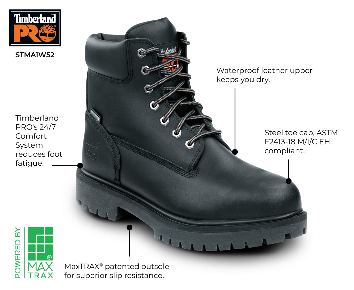Description Waterproof nubuck leather upper. Breathable and moisture wicking lining. 200 grams Thermolite insulation. Timberland PRO 24/7 comfort system to reduce foot fatigue. Seam-sealed waterproof construction. PU midsole. Nonmarking, oil, and abrasion resistant Thermoplastic Urethane (TPU) outsole with MaxTRAX patented slip resistant tread for superior slip resistance. Direct attached construction. Steel toe. EH. WP/Insulated. ASTM F2413-18 M/ I/ C EH compliant.
