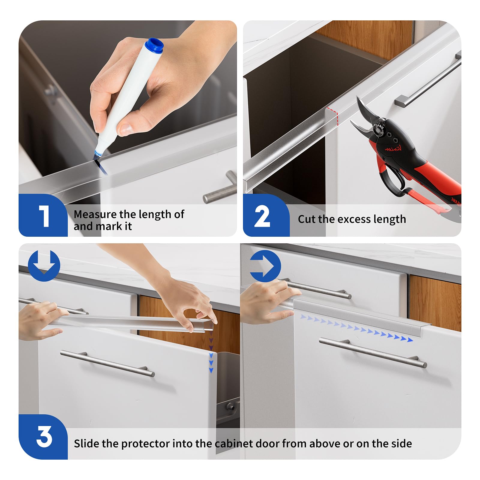 Customizable to Your Needs - Need a perfect fit? These drawer protector edge guards can be easily trimmed to size using common household tools (saw or scissors), allowing for flexible coverage on cabinet doors or drawers of varying lengths.