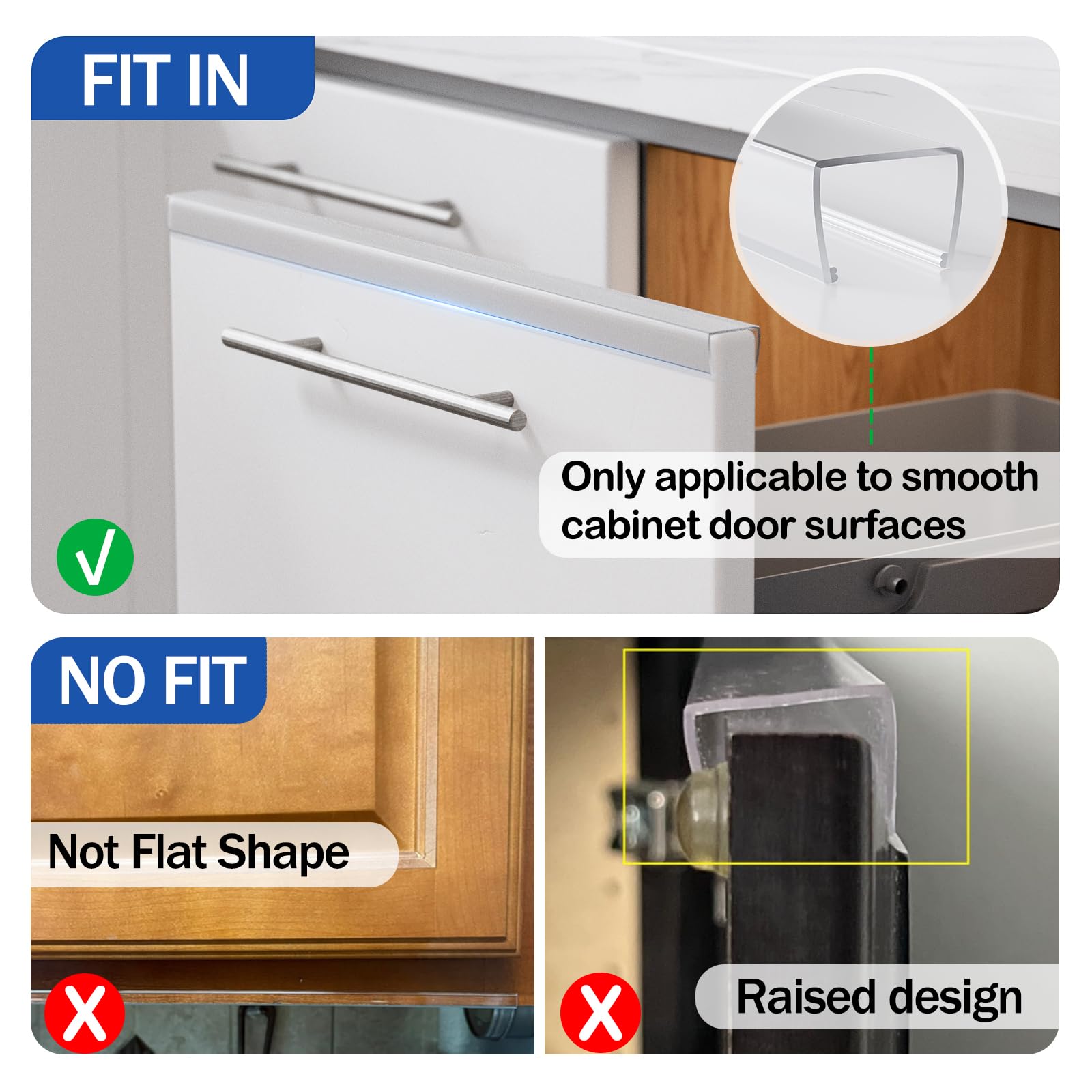 Only Fit for 3/4" Standard Cabinets - Specifically designed for 3/4" thick flat cabinet doors (17.7" length per strip), these cabinet door protectors provide perfect coverage for most framed, inset, and European-style cabinet doors. Package includes 12 cabinet edge protectors for complete cabinet protection.
