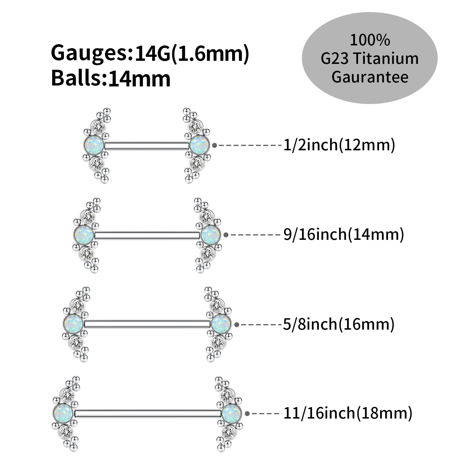 Size: Gauge: 14 G (1.6 mm); Nipple Barbell Length: 1/2"(12 mm); CZ&Opal Size: 14 mm, 1 pair nipple ring per order