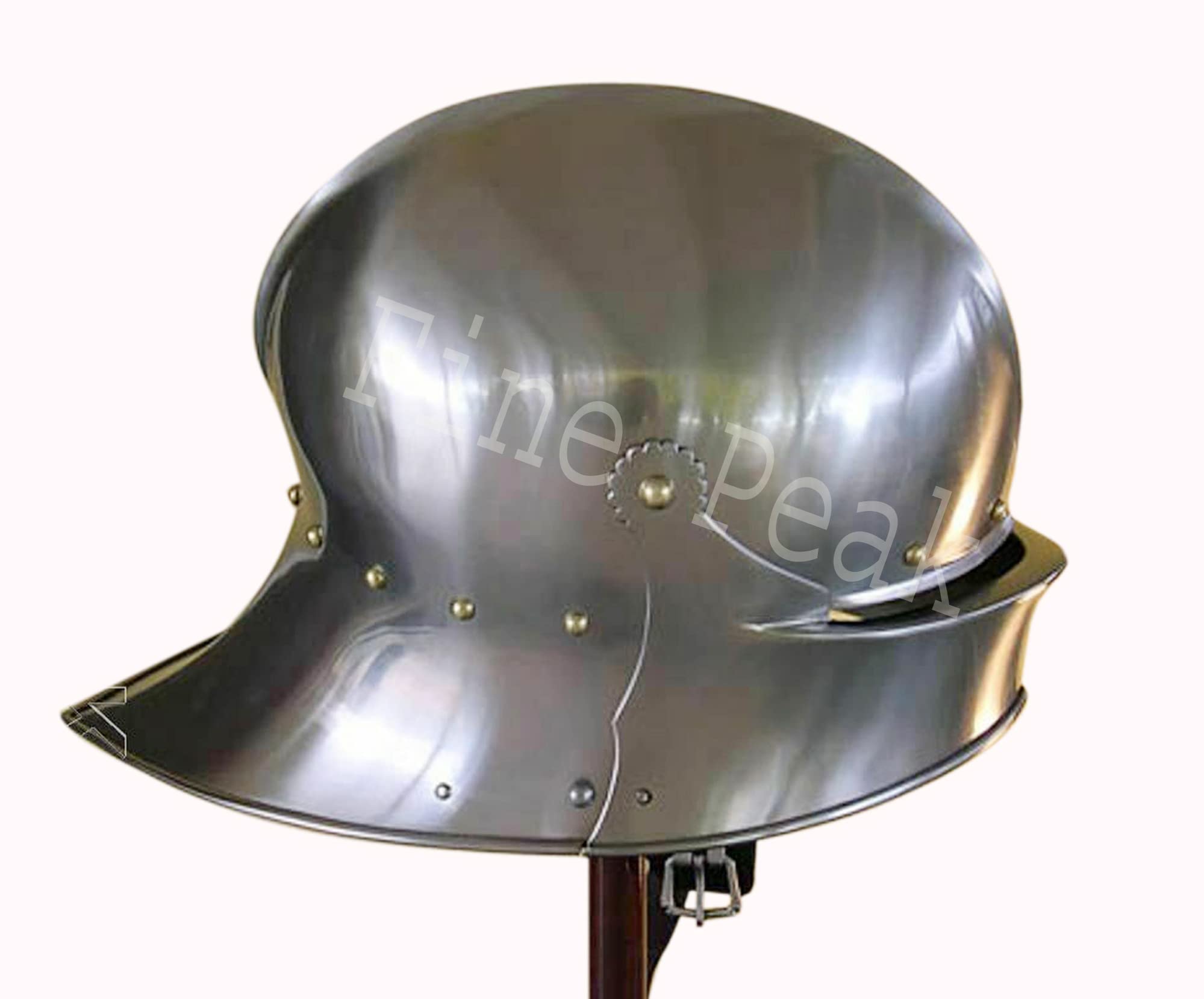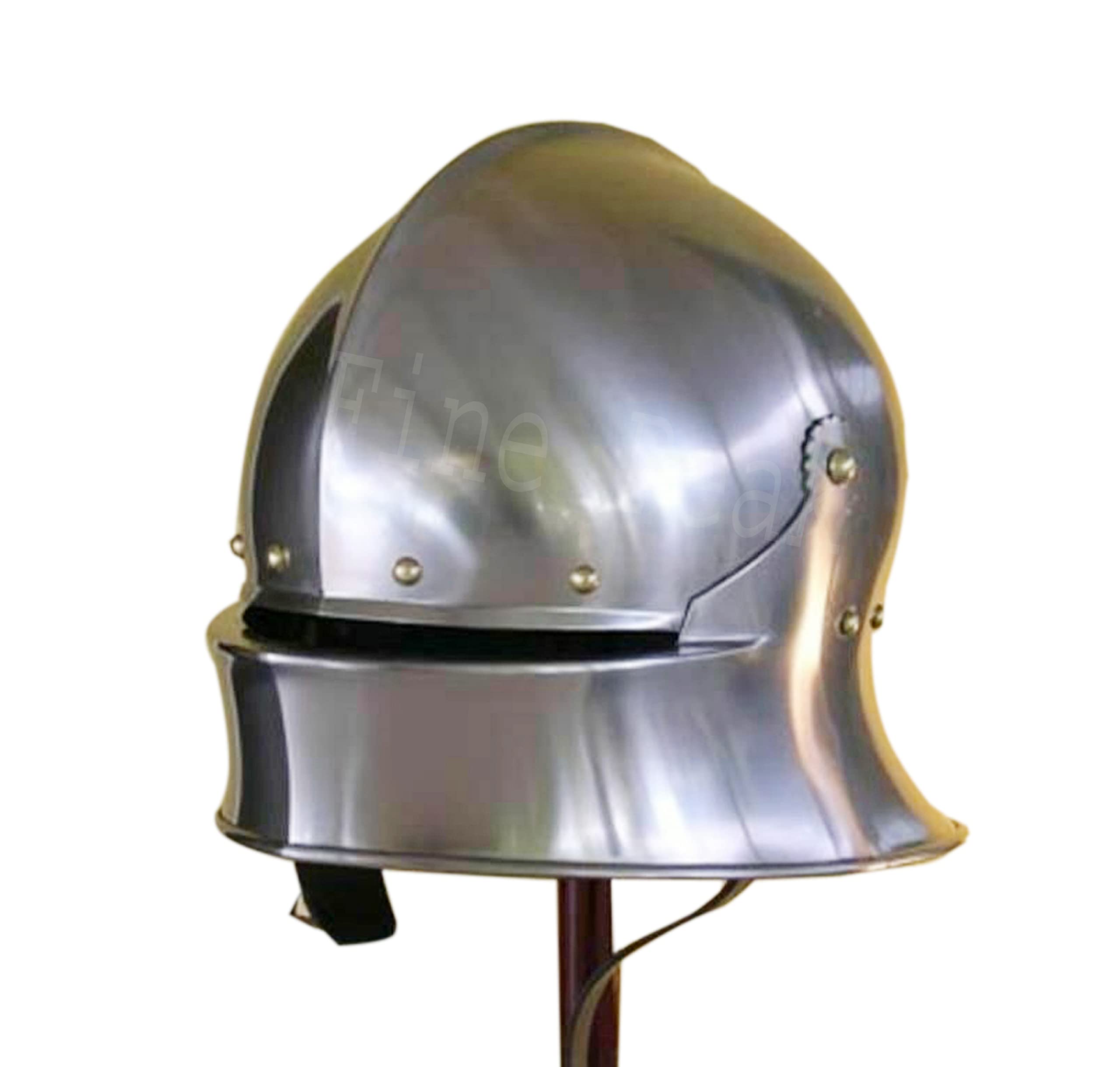 Fine Peak Medieval Knight Wearable German Sallet helmet Replica Sugar loaf 18GA SCA LARP Finish and it's easy to see why the sallet ended up becoming one of the more common helmets of the Middle Ages. / This particular sallet is modeled after the classic German Gothic style, / which gives it an elegant design that features attractive fluting and ridge work that enhances the look of the armour while also / reinforcing its strength. / The interior of the helmet features leather lining as well as an adjustable leather chin strap, / which is perfect for keeping the helmet secured and in-place when wearing it. / The helmet features a shiny metal finish that is perfect for creating a 'knight in shining armour' look, / and the helmet also pairs nicely with our other Gothic Armor sets thanks to its gleaming appearance,All Helmet are coated with rust-free paint from inside