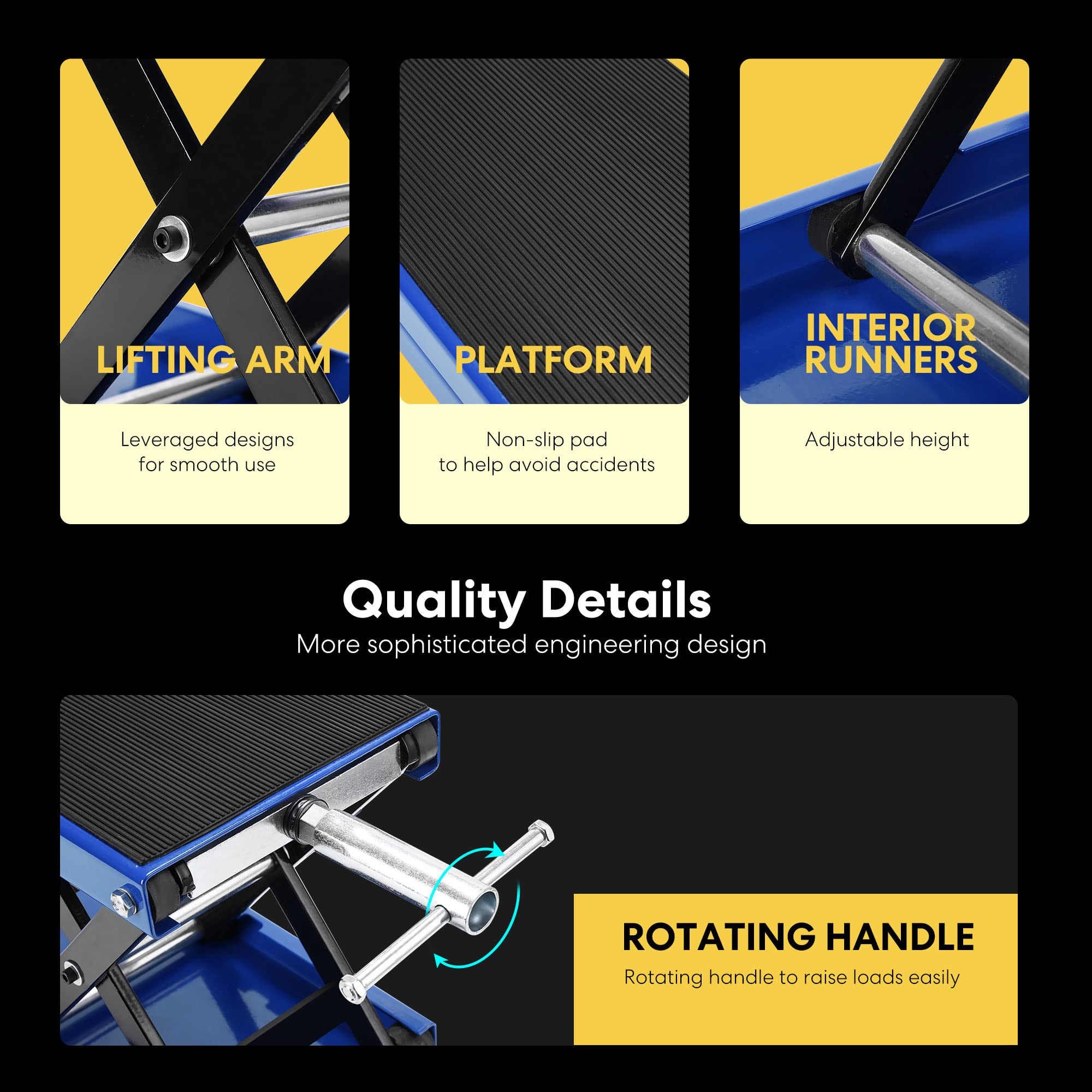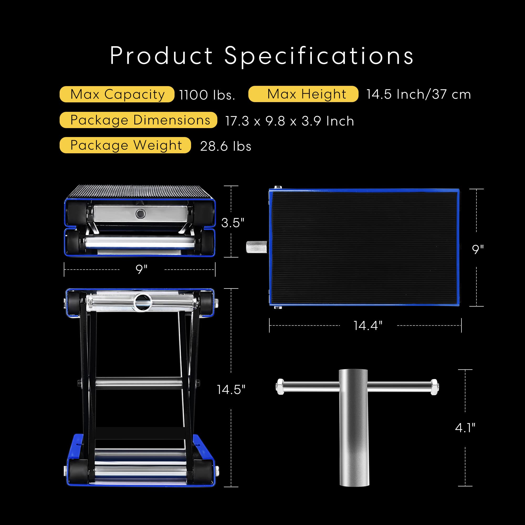 ANTI-SLIP DESIGN - The top surface of the stand has a durable rubber pad with striped pattern to help prevent slippage and scratches; The wide top platform measures 14.4" x 9", which has a large contact area with the motorcycle to raise and lower it steadily
