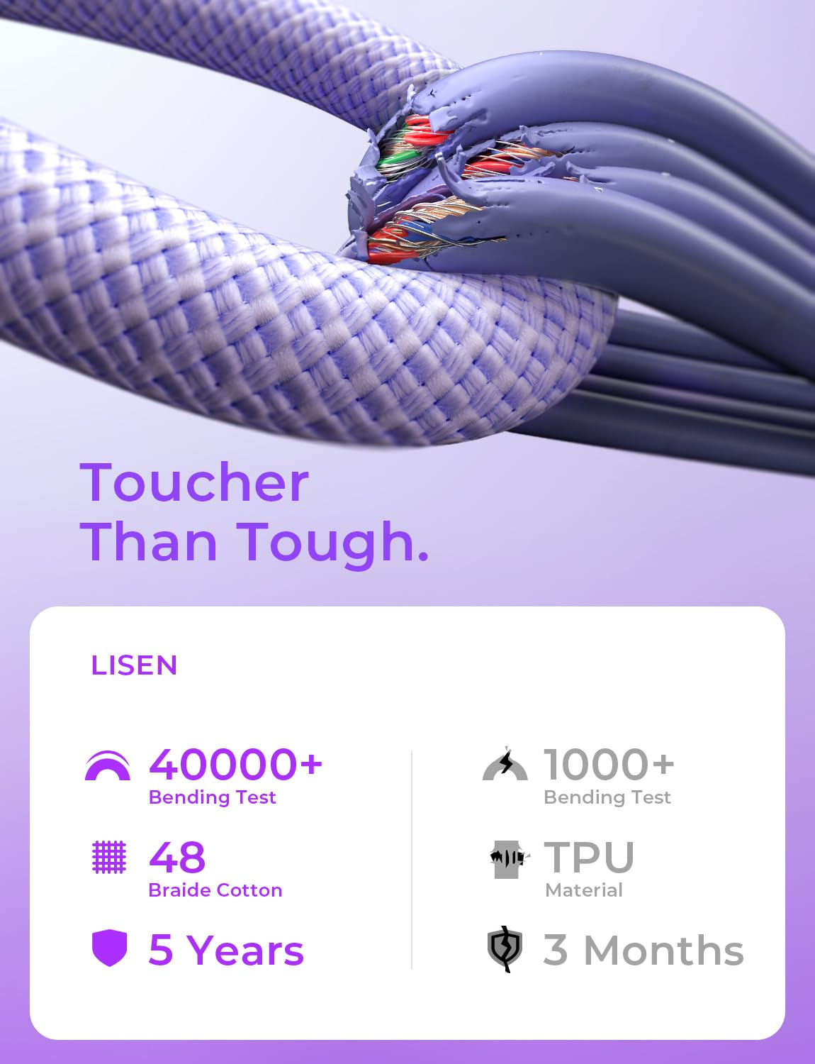【Green Recyclable Materials】 The LISEN USB C Cable is braided from 48 strands of recyclable cotton yarn material. This knit design also helps prevent tangles and damage caused by bending and twisting. Using recycled materials is one way to reduce the carbon footprint of our products, as these materials often have a smaller environmental impact than those sourced from primary sources.