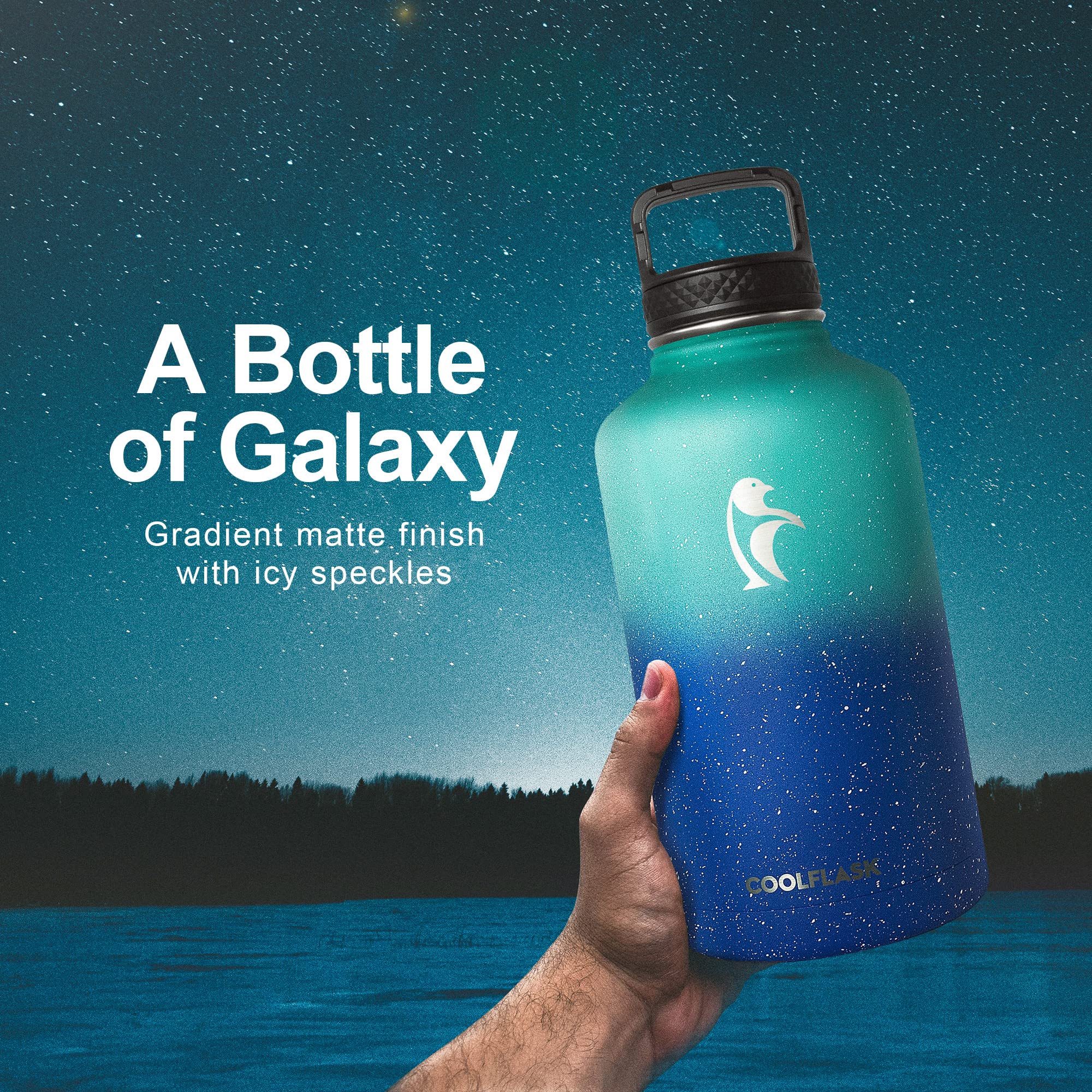 【Grand as the Galaxy】This 64 oz insulated water bottle has a unique matte finish, gradient powder coat, ice speckles and laser engraved logo that's sensory on the look and touch. It won't sweat or slip from wet palms, the large 64 oz capacity will keep you hydrated for a whole day without a refill.